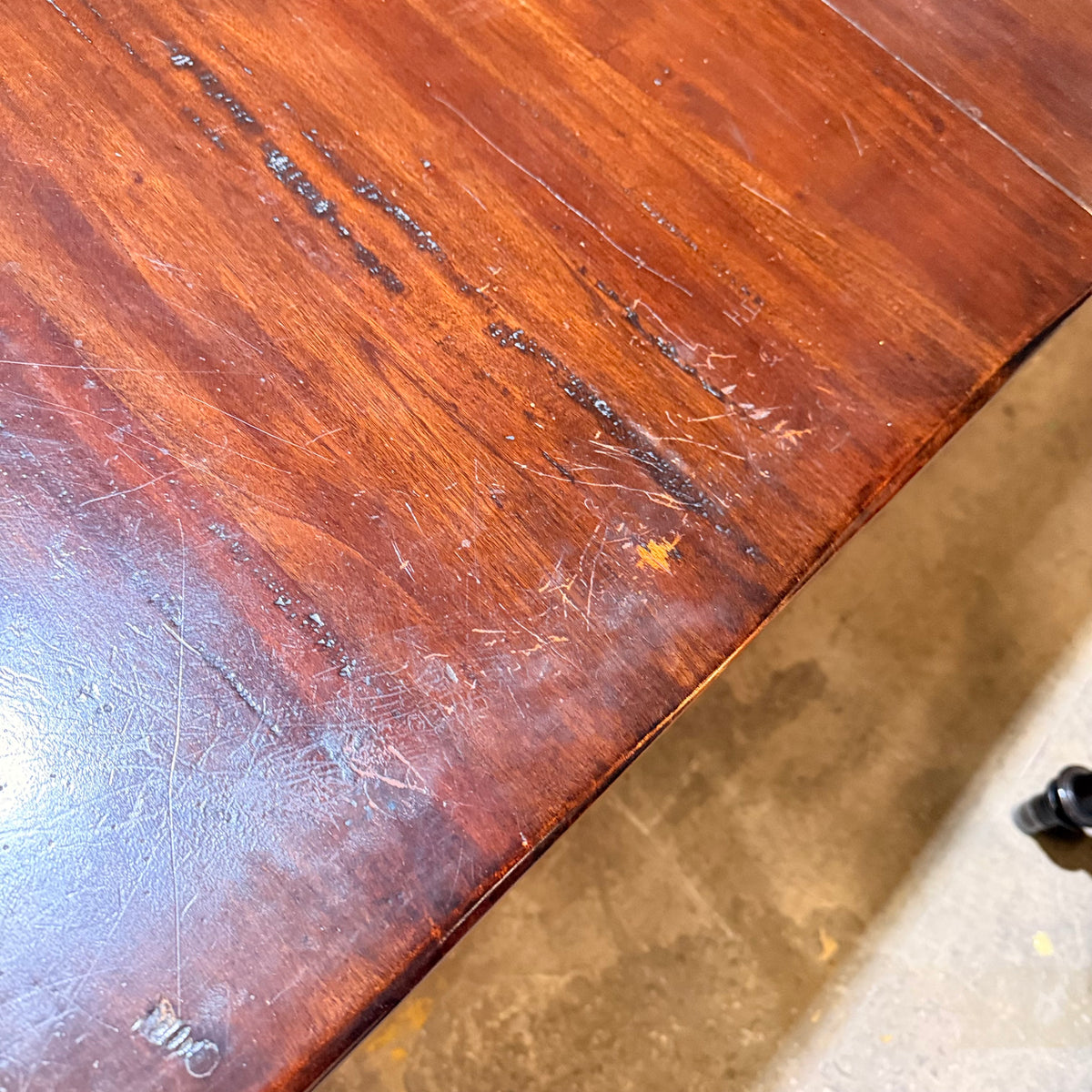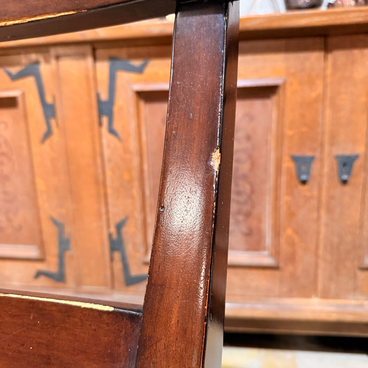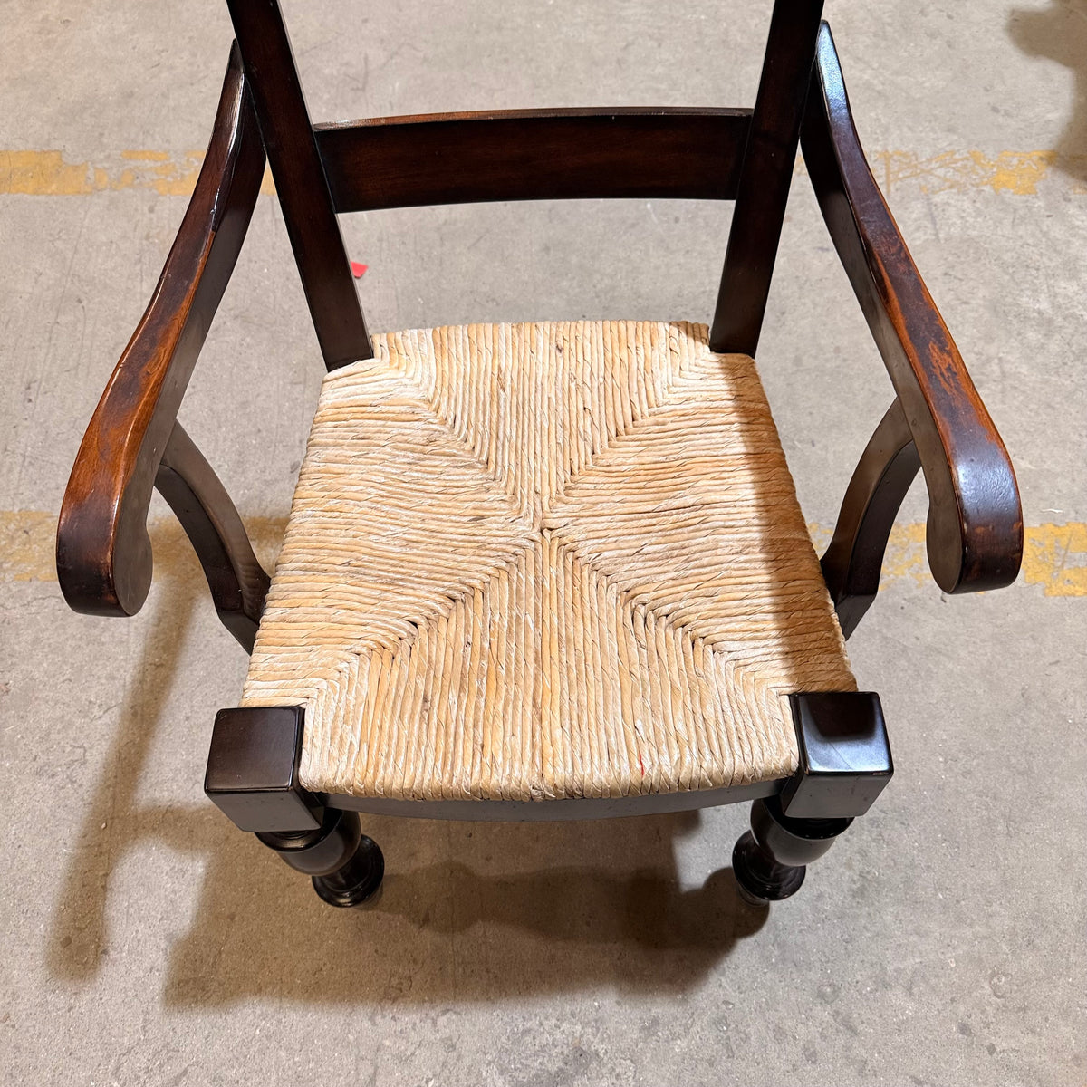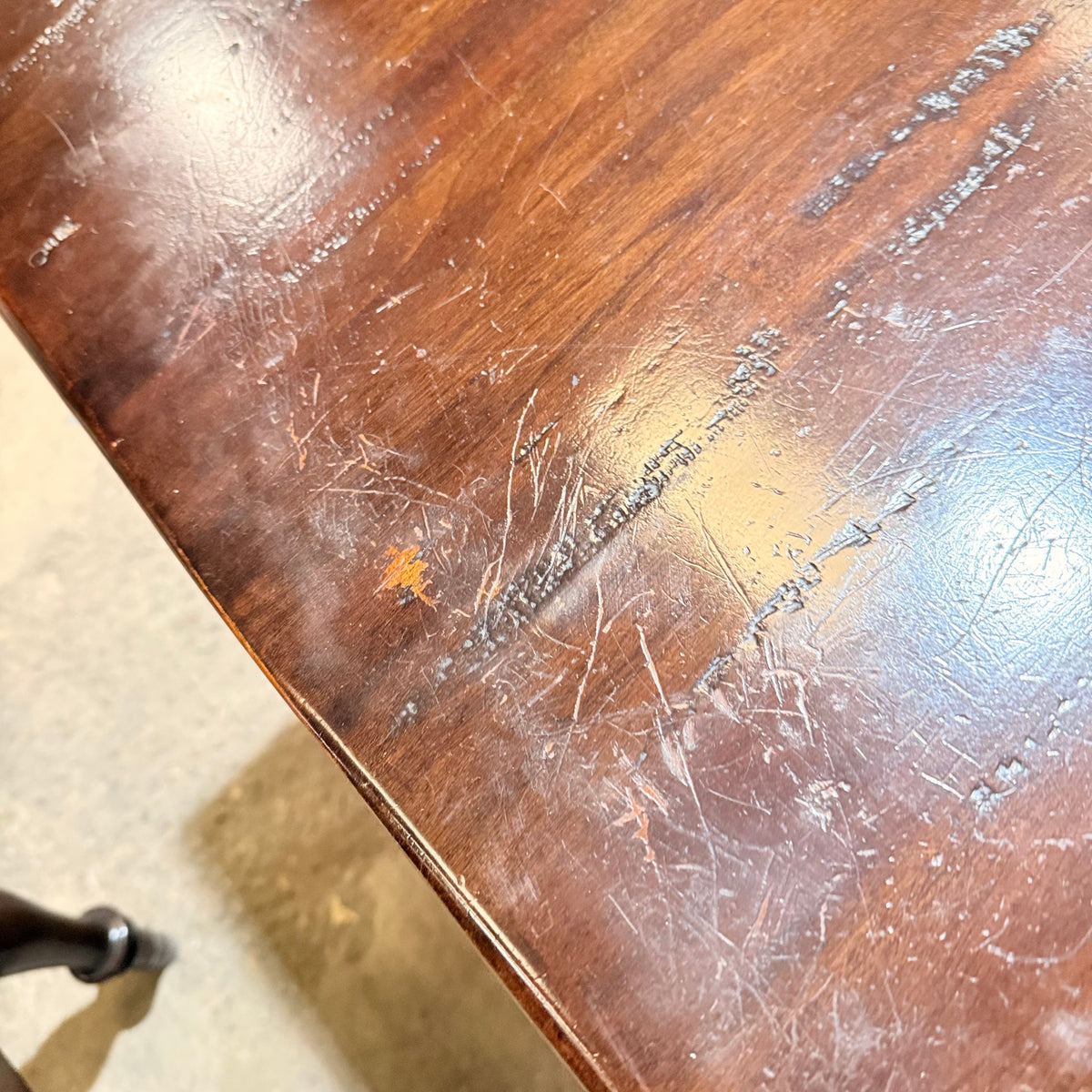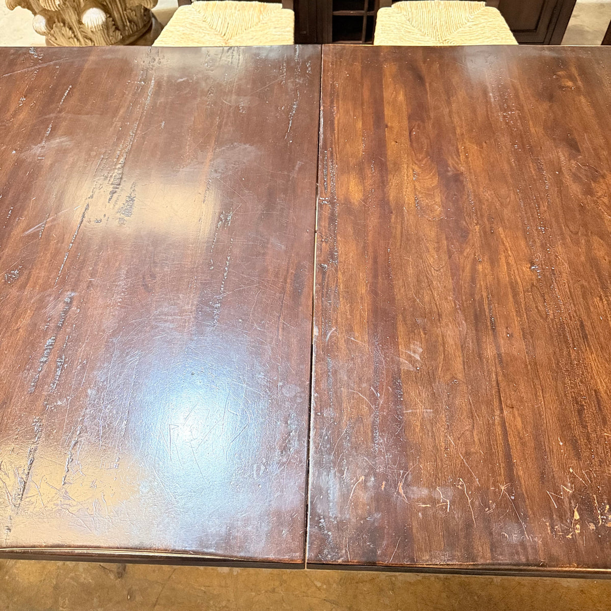 Please note, there are many deep scratches and chips along the surface top of the table. There are also some chips and scratches to the frames of the chairs, especially to their backs and towards the feet. There is one specific dining chair with some damage to the woven straw on the rush seat (see photos).
