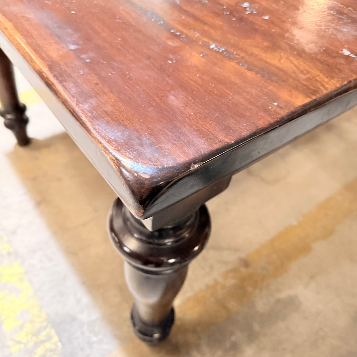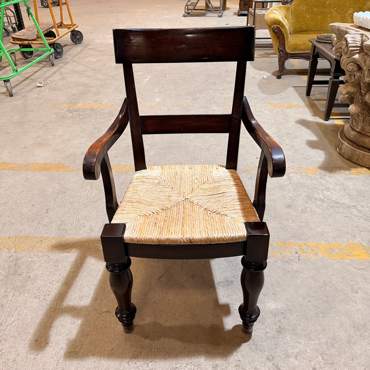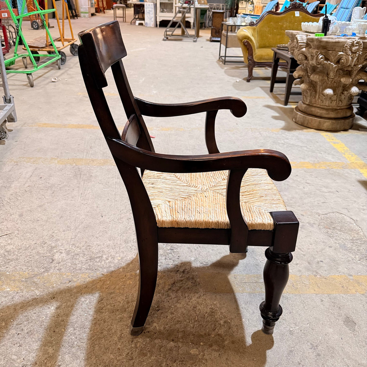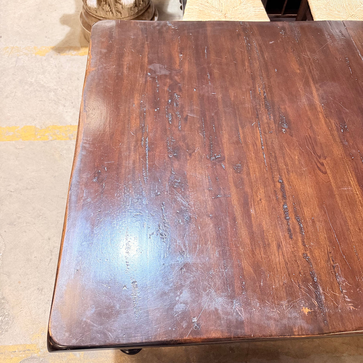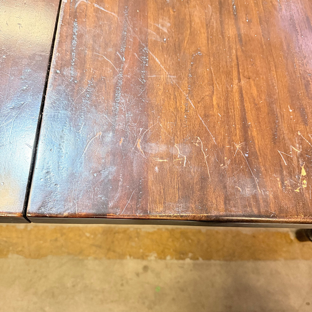 Please note, there are many deep scratches and chips along the surface top of the table. There are also some chips and scratches to the frames of the chairs, especially to their backs and towards the feet. There is one specific dining chair with some damage to the woven straw on the rush seat (see photos).