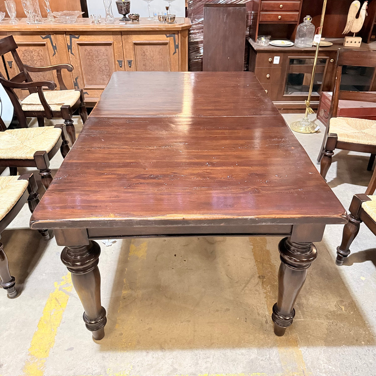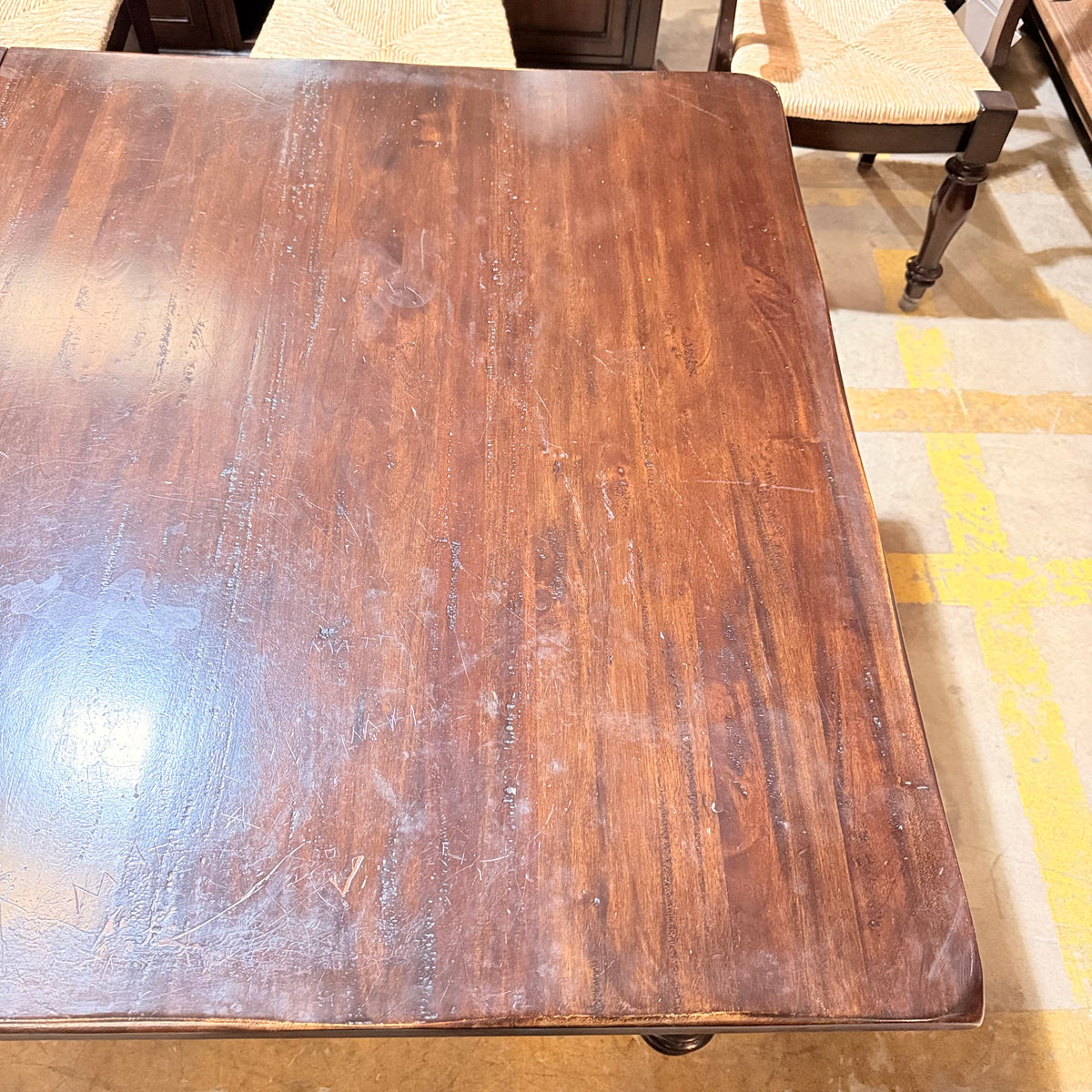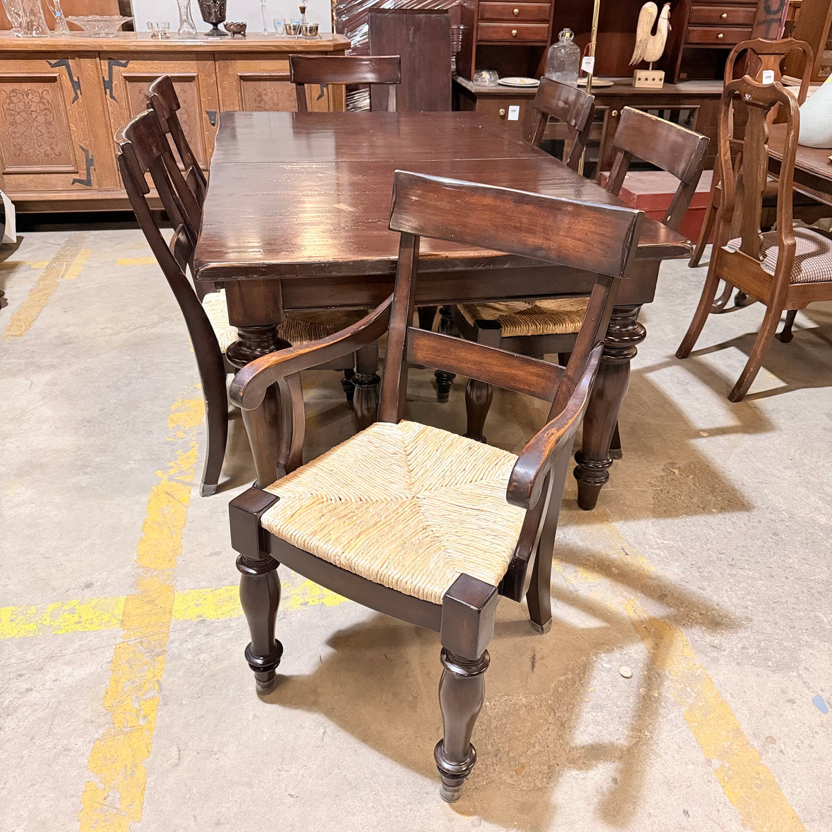 This French Country style dining set includes two armchairs, four side chairs, and two 18-inch extension leaves. The chairs have simple ladder-backs and rush-seats finished with woven straw. The chairs come with protective feet caps included. The table stands on turned legs with bulb and ring-turning. The finish on this dining set is intentionally distressed.