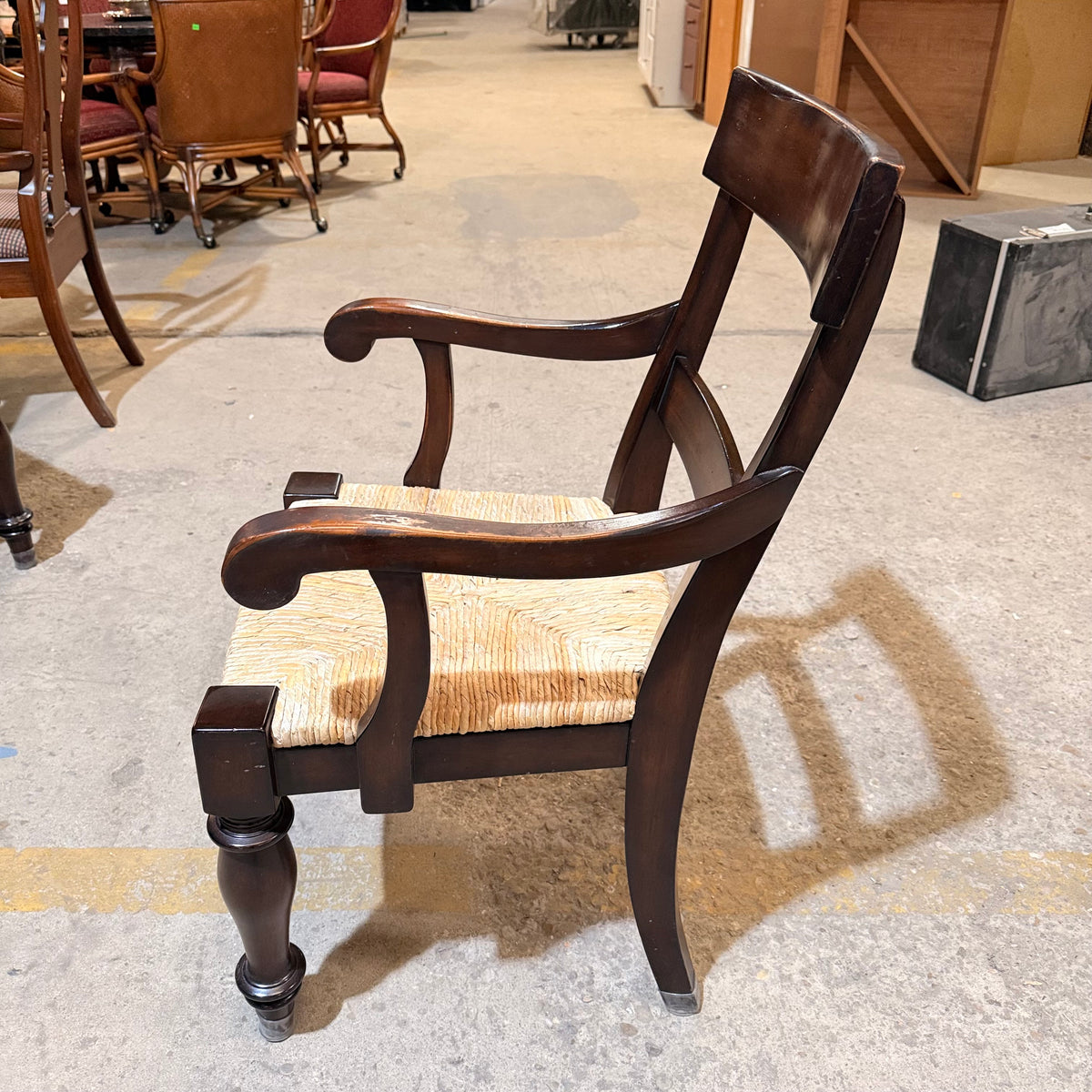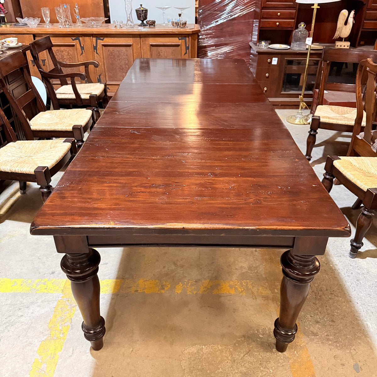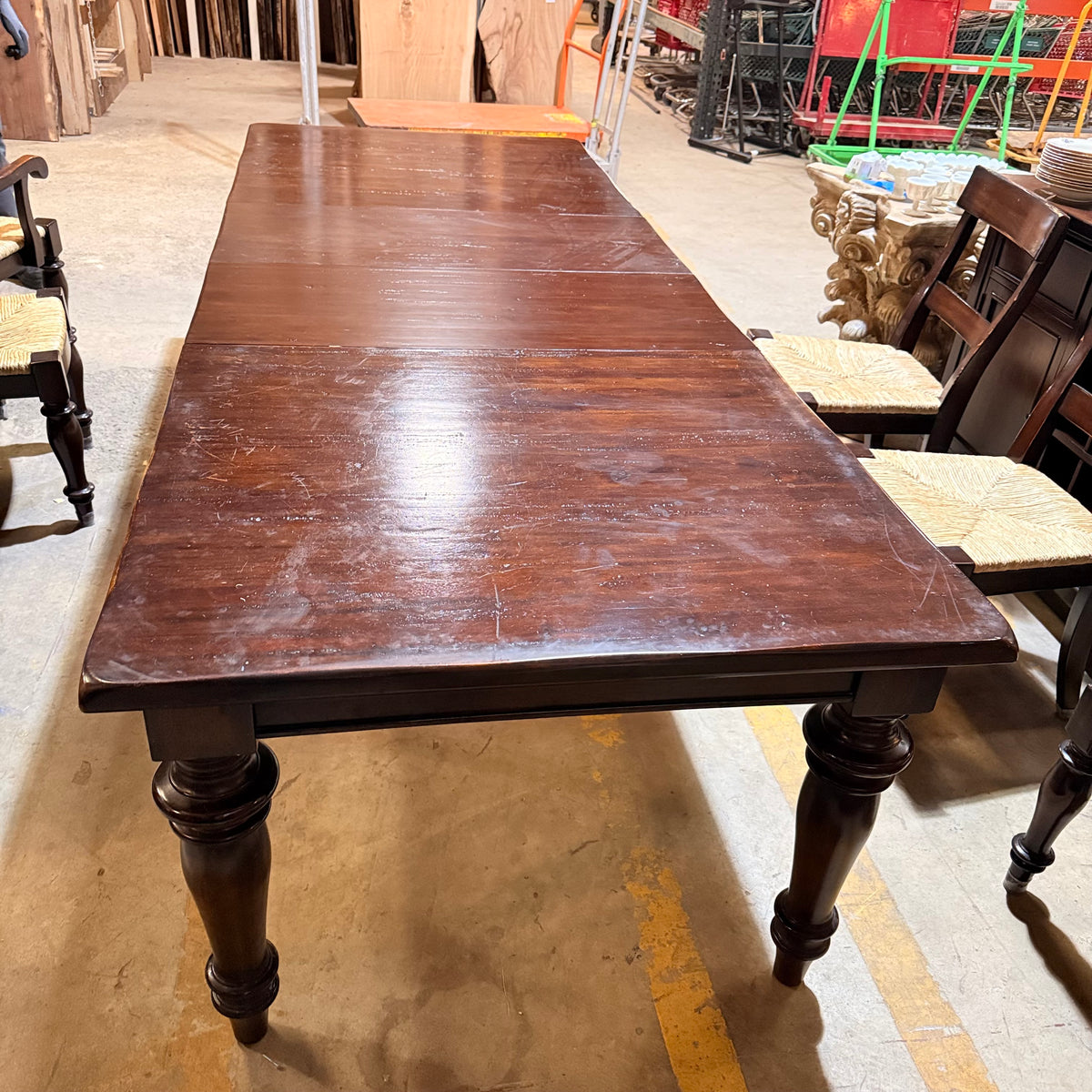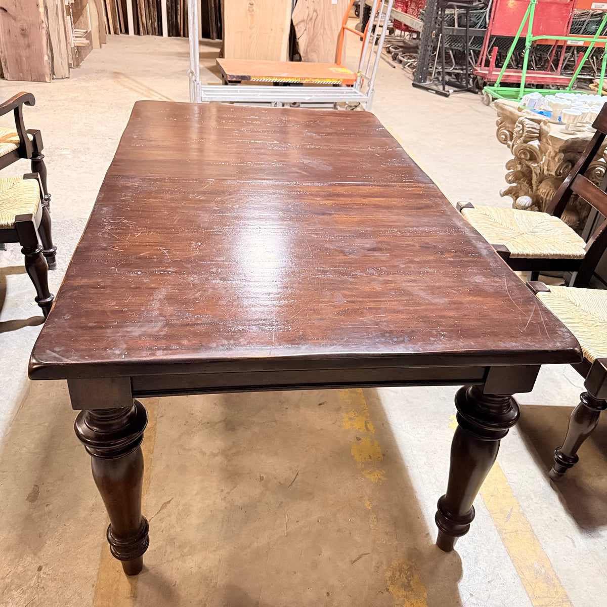 This French Country style dining set includes two armchairs, four side chairs, and two 18-inch extension leaves. The chairs have simple ladder-backs and rush-seats finished with woven straw. The chairs come with protective feet caps included. The table stands on turned legs with bulb and ring-turning. The finish on this dining set is intentionally distressed.