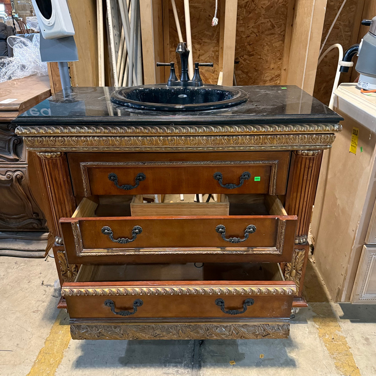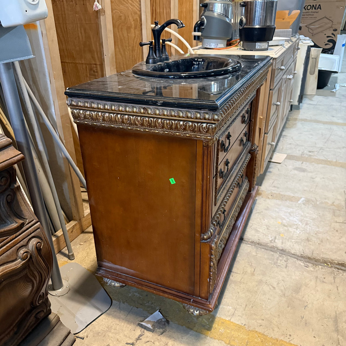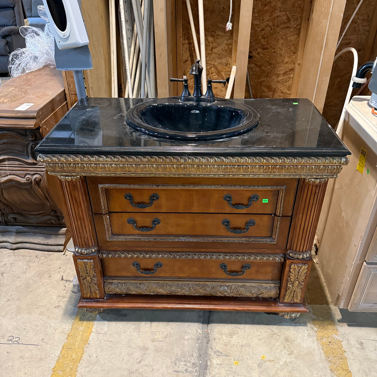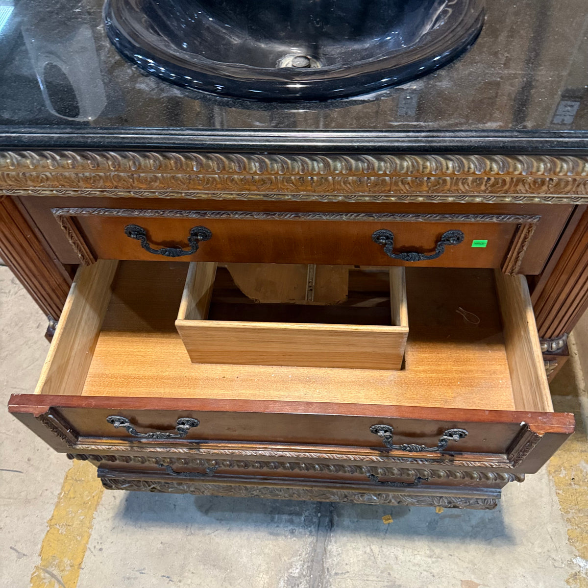 This previously owned freestanding single bathroom vanity by Pulaski Furniture sits on an ornately carved wooden base. It includes a black, stone countertop with a matching American Standard drop-in sink and comes with oil rubbed bronze faucet and draining hardware installed. It features ample storage space below with a total of two spacious drawers with drop-bail pull hardware. Additional cleaning is recommended.