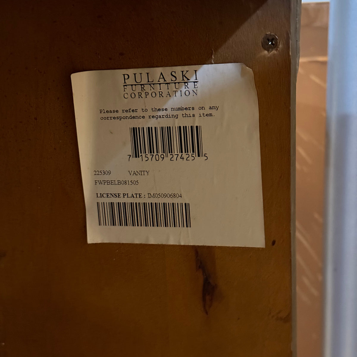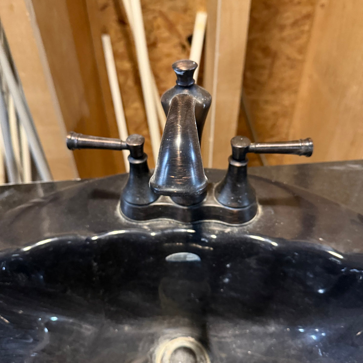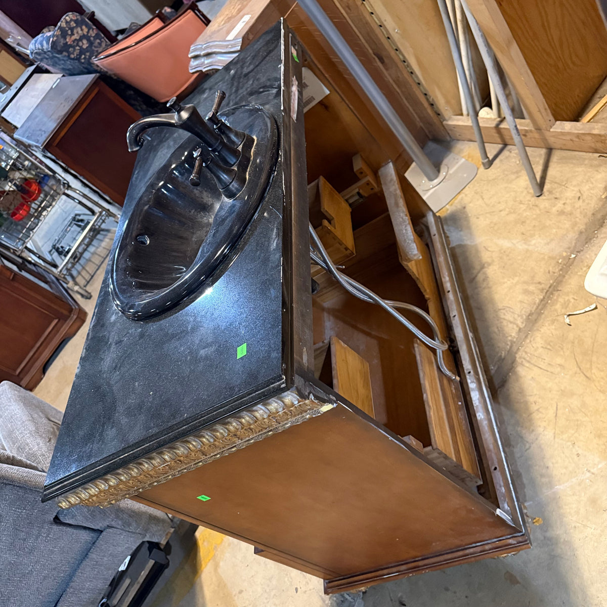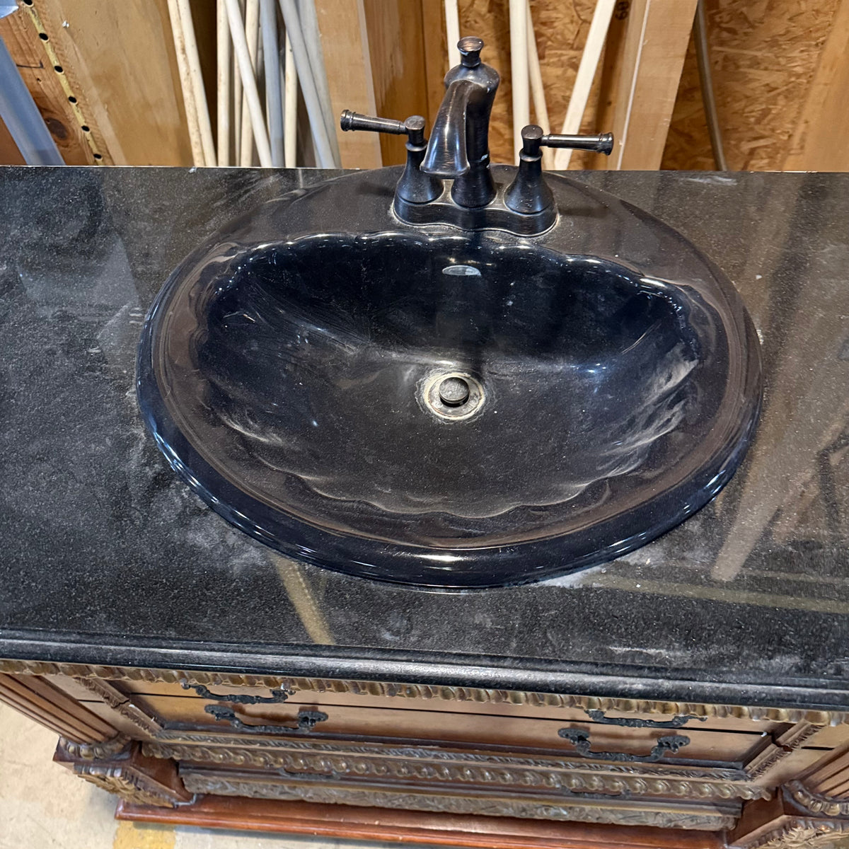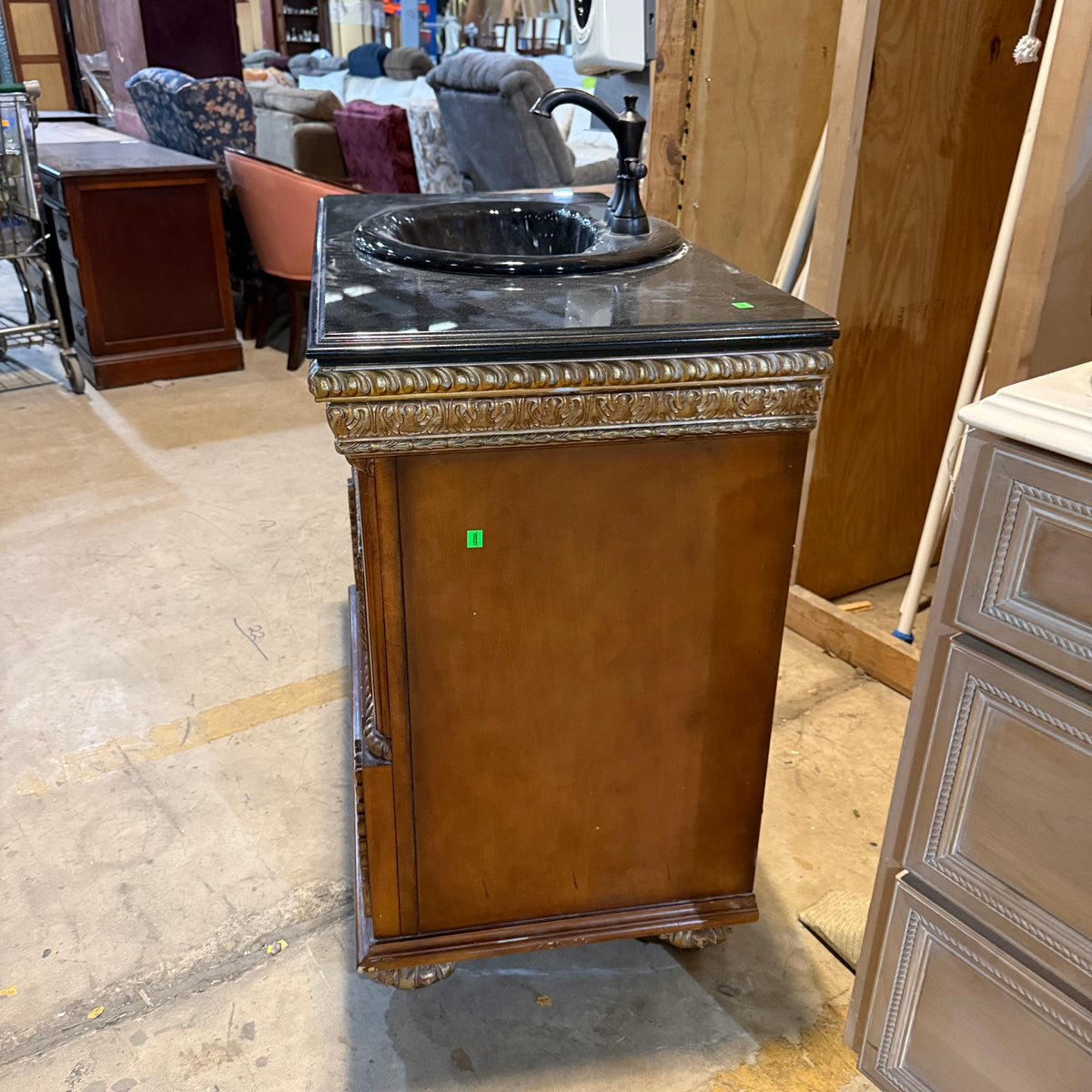 This previously owned freestanding single bathroom vanity by Pulaski Furniture sits on an ornately carved wooden base. It includes a black, stone countertop with a matching American Standard drop-in sink and comes with oil rubbed bronze faucet and draining hardware installed. It features ample storage space below with a total of two spacious drawers with drop-bail pull hardware. Additional cleaning is recommended.
