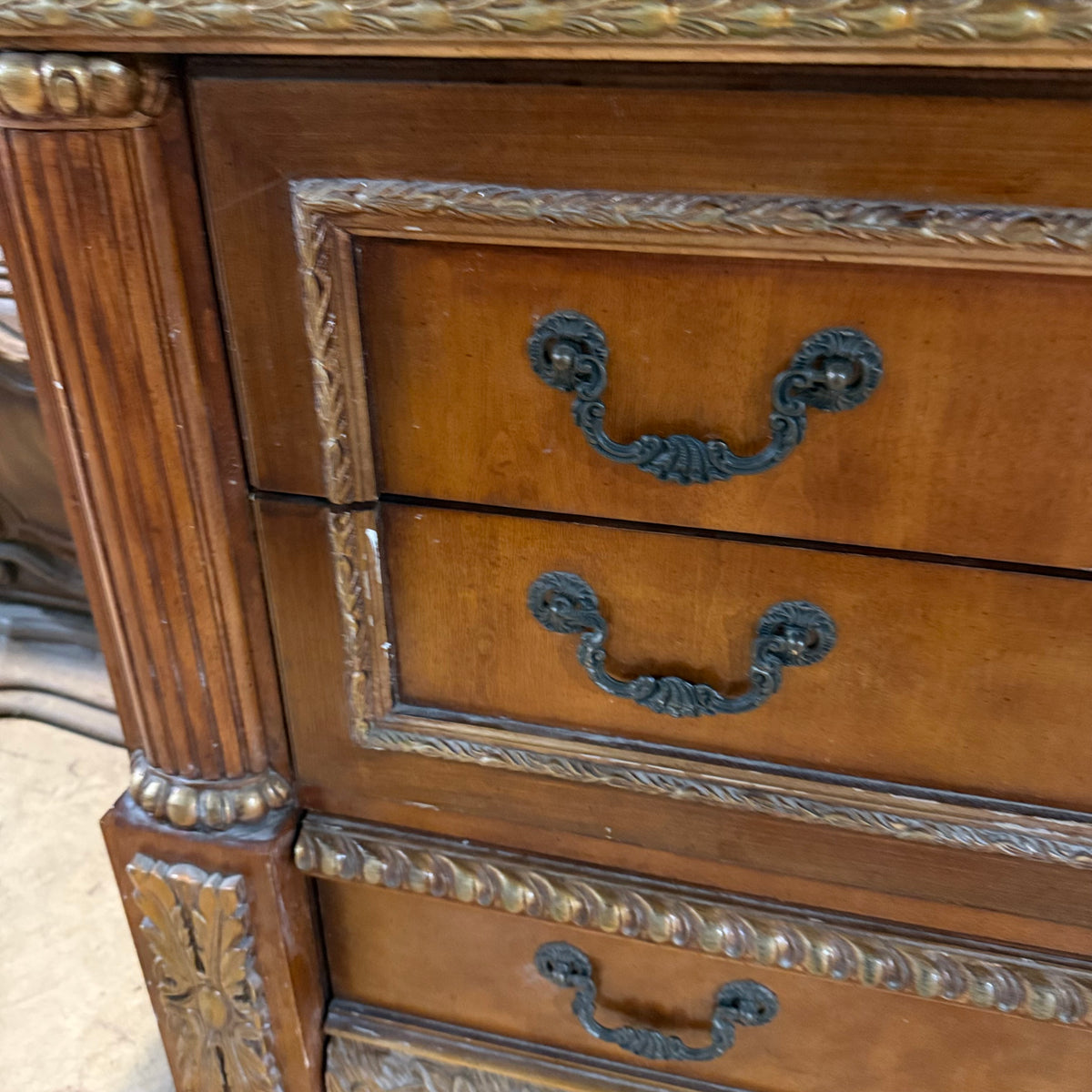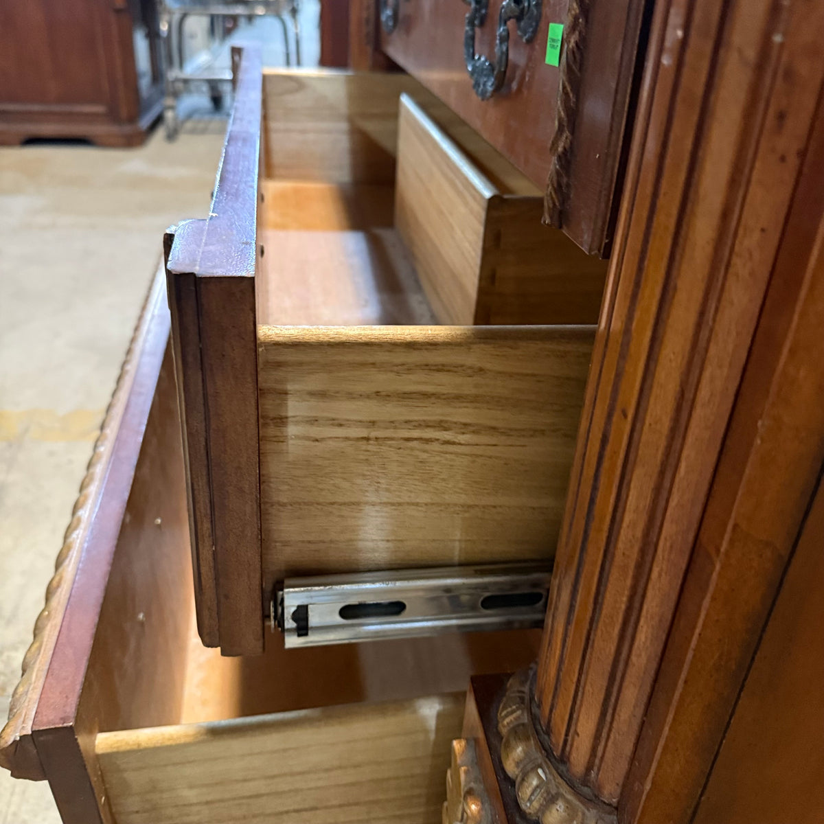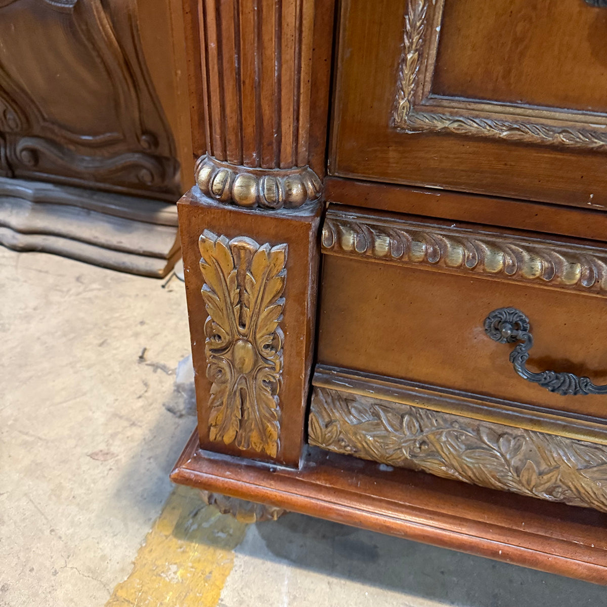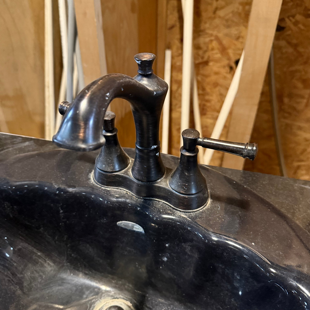 This previously owned freestanding single bathroom vanity by Pulaski Furniture sits on an ornately carved wooden base. It includes a black, stone countertop with a matching American Standard drop-in sink and comes with oil rubbed bronze faucet and draining hardware installed. It features ample storage space below with a total of two spacious drawers with drop-bail pull hardware. Additional cleaning is recommended.