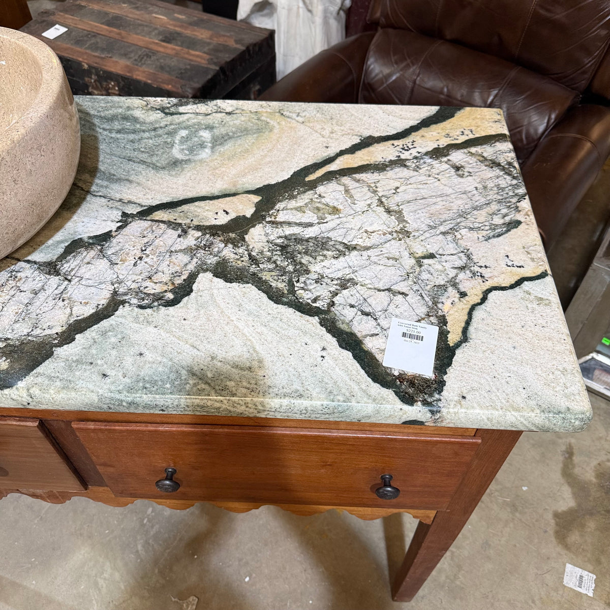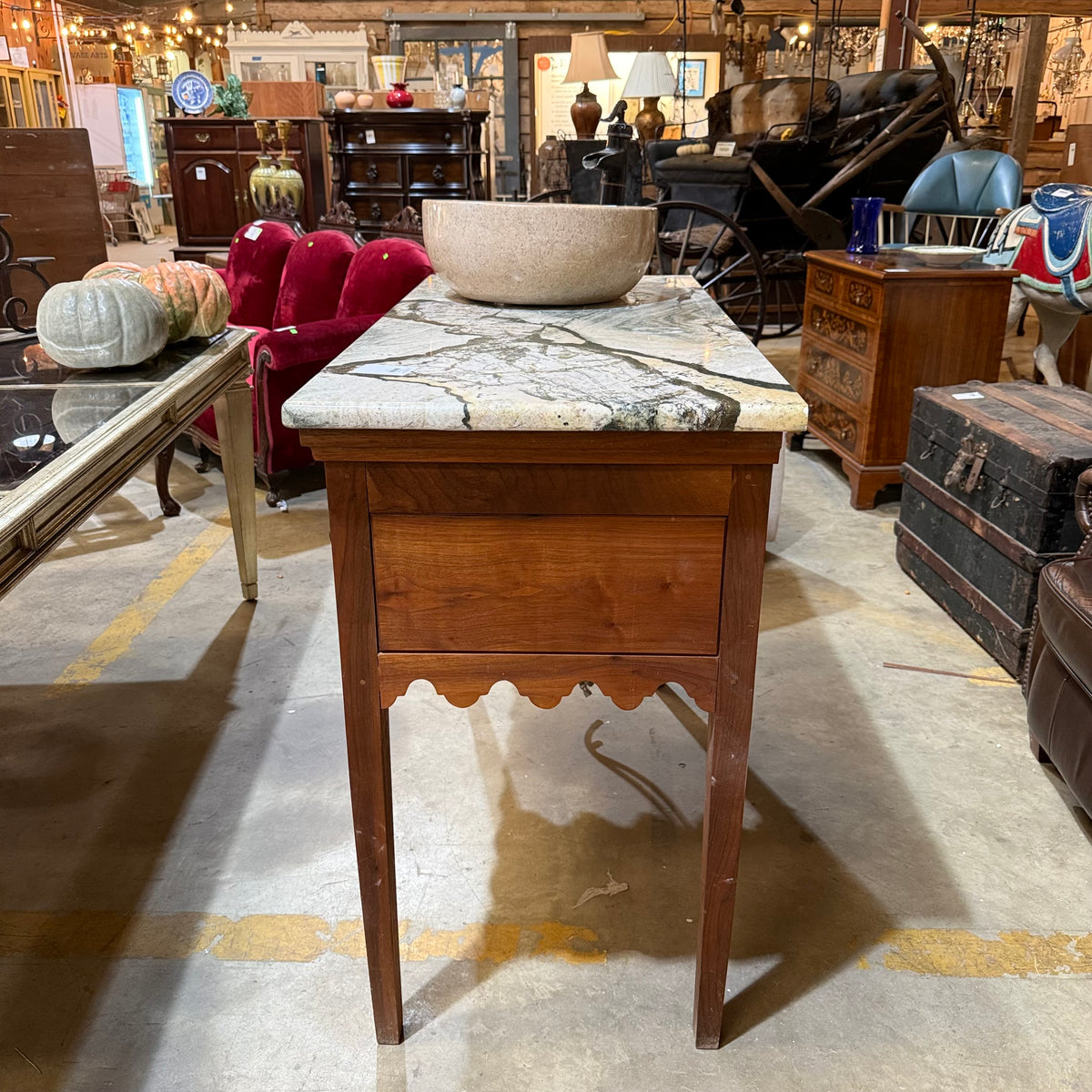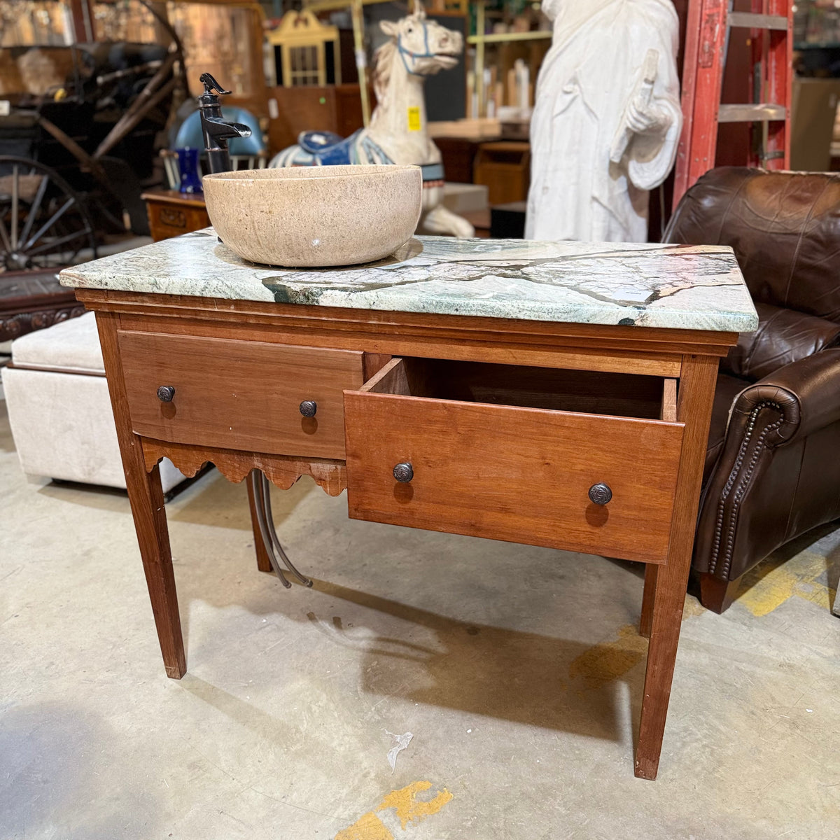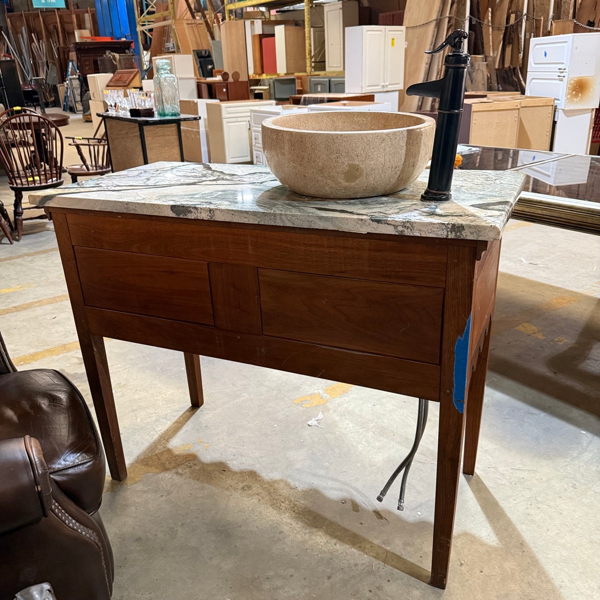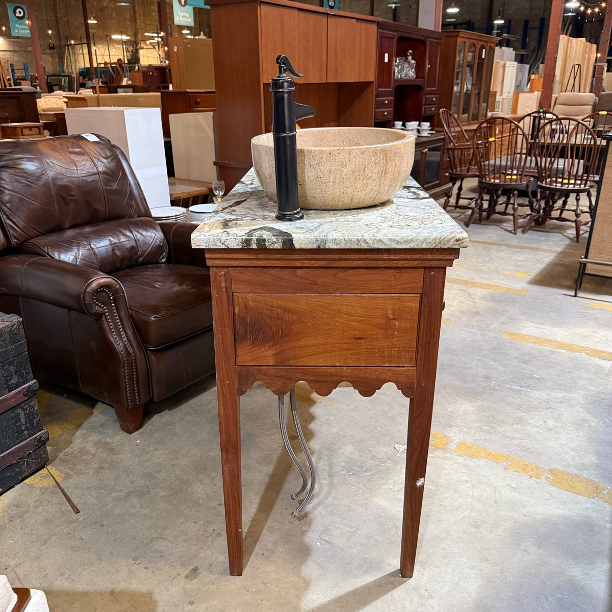 This previously owned single bathroom vanity appears to have been repurposed from a vintage furniture piece and outfitted with a stone countertop. It comes with a round, heavy vessel sink and an oil rubbed bronze faucet included. There is no draining hardware included. It sits on a repurposed, vintage piece of furniture with straight legs, a carved apron front and the base features a single drawer on the right. The drawer on the left comes out, but has been cut down to appropriately fit pipes for for the vessel sink and faucet/draining hardware underneath.