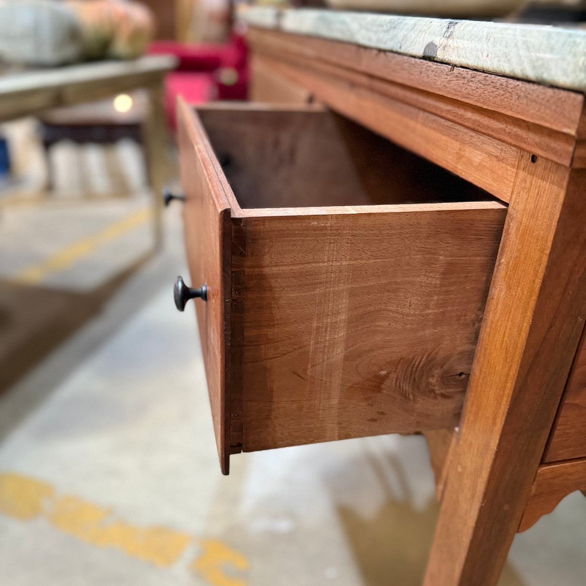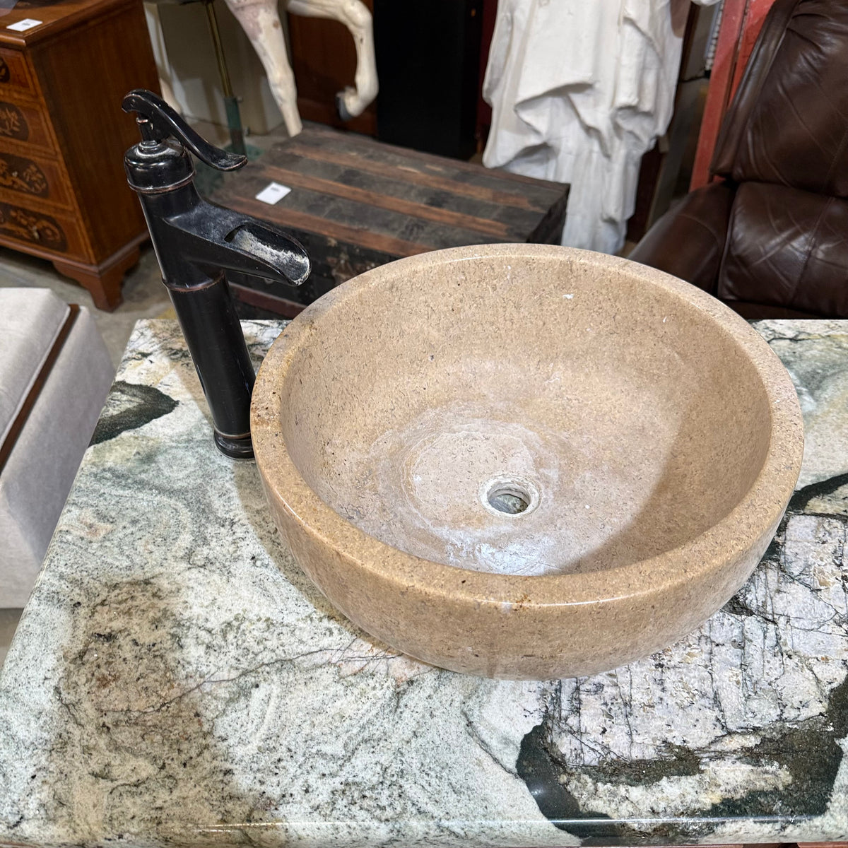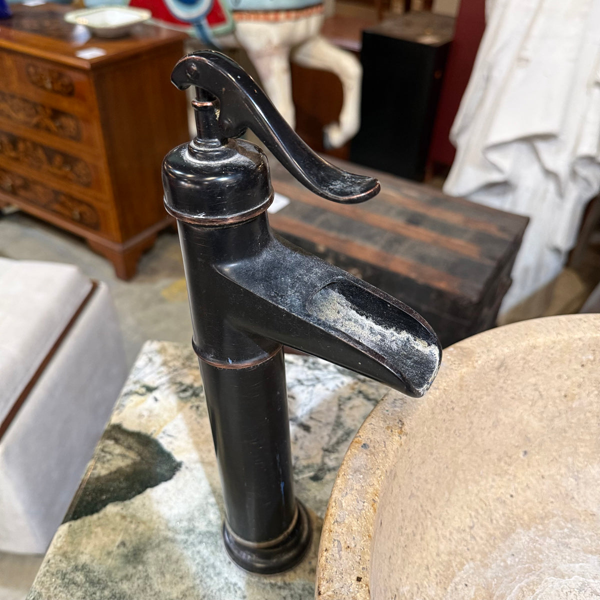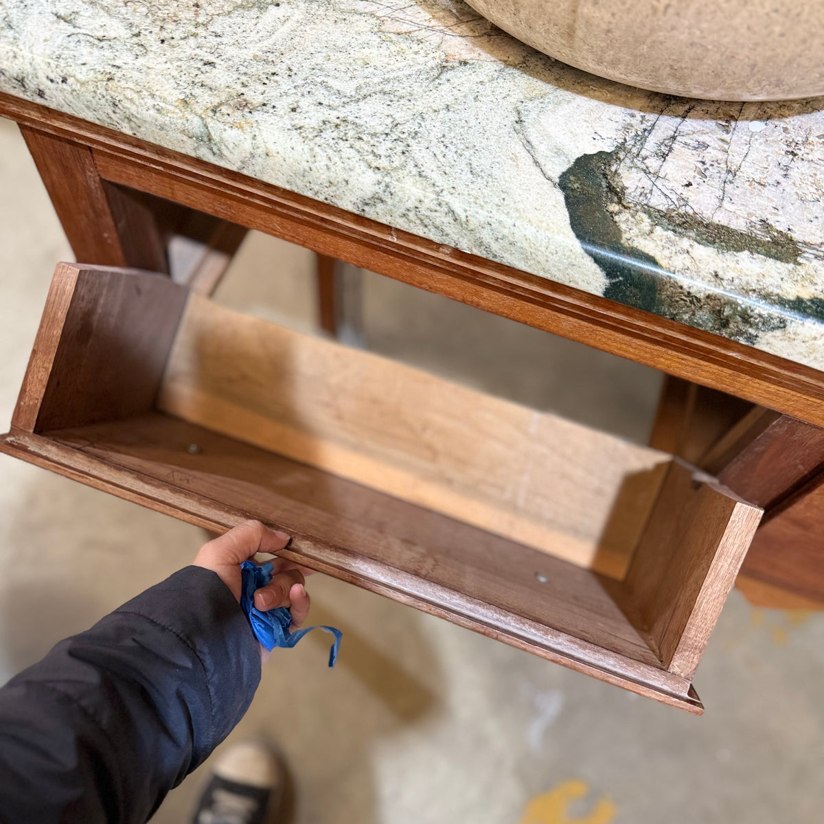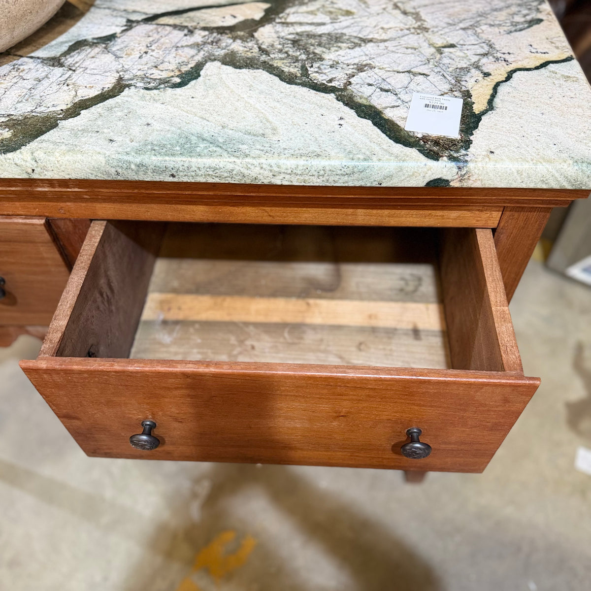 This previously owned single bathroom vanity appears to have been repurposed from a vintage furniture piece and outfitted with a stone countertop. It comes with a round, heavy vessel sink and an oil rubbed bronze faucet included. There is no draining hardware included. It sits on a repurposed, vintage piece of furniture with straight legs, a carved apron front and the base features a single drawer on the right. The drawer on the left comes out, but has been cut down to appropriately fit pipes for for the vessel sink and faucet/draining hardware underneath.