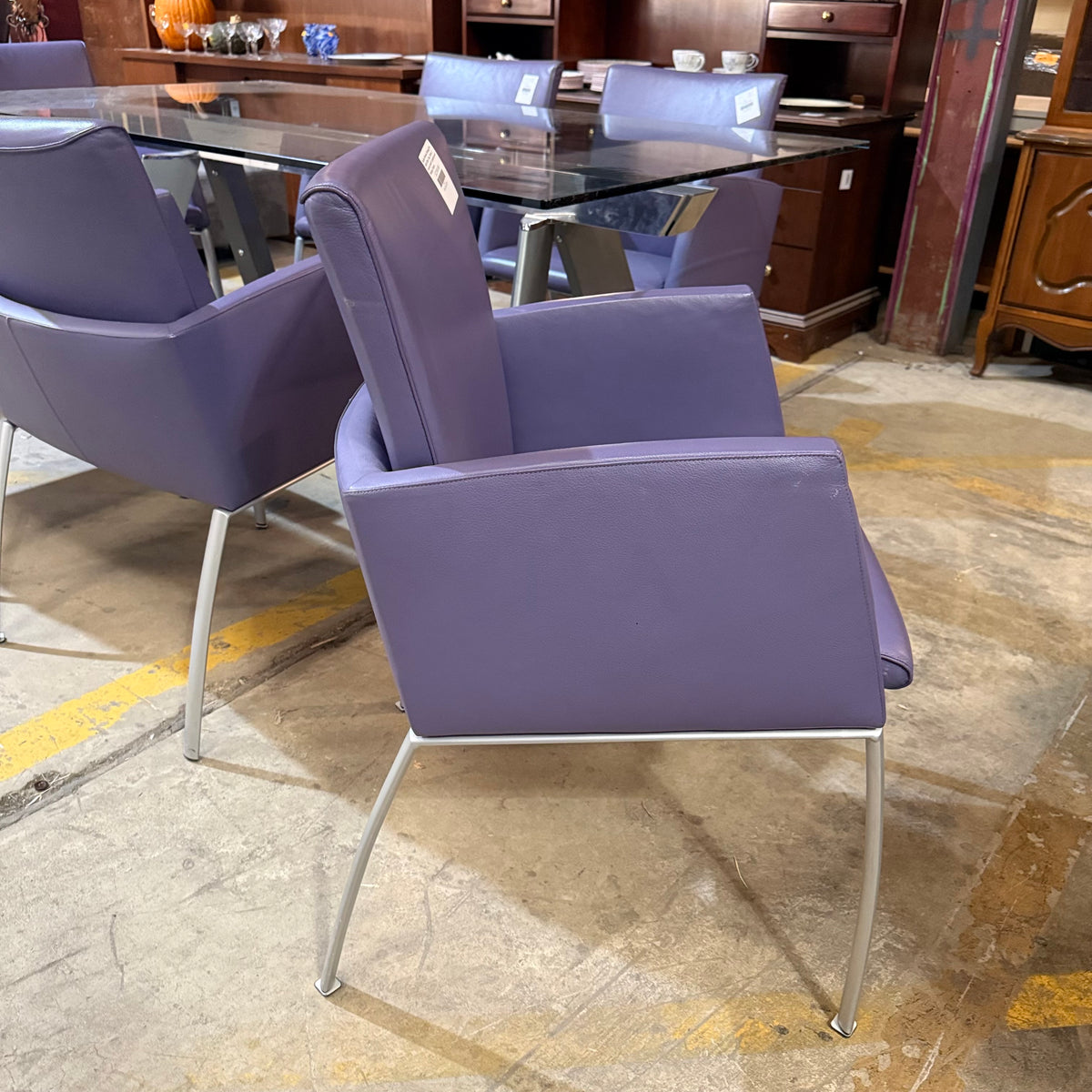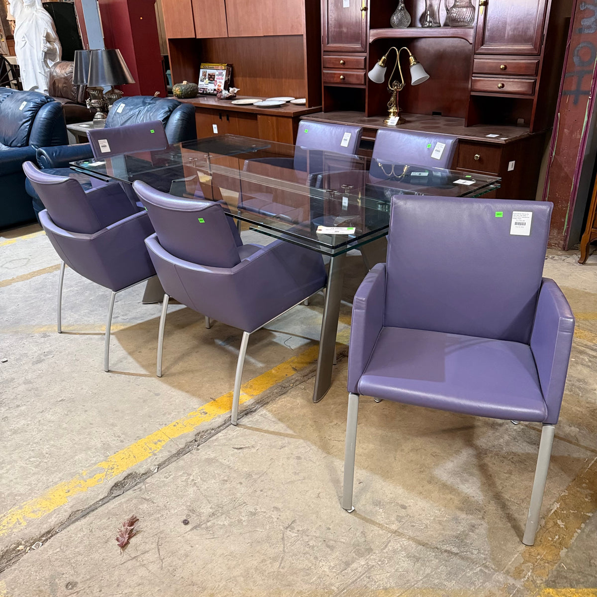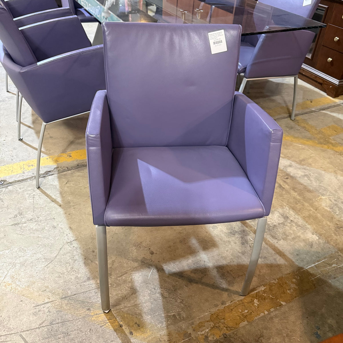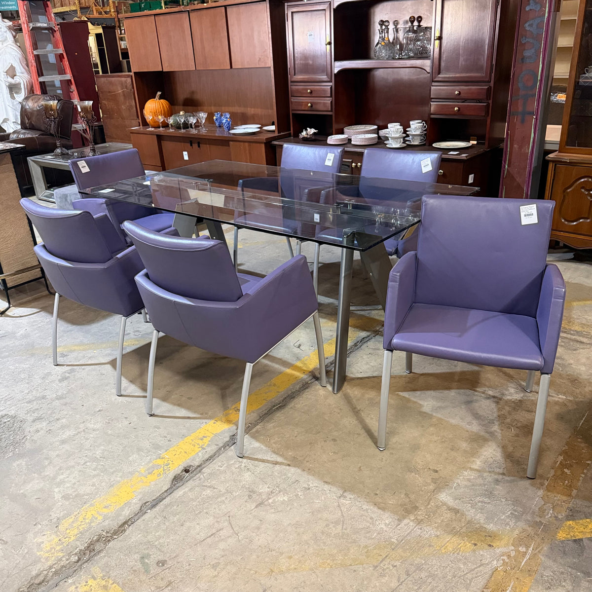 This formal, modern dining set consists of a Roche Bobois table with a rectangular, beveled edge glass top that sits on a metal base with splayed legs. The dining set also includes six purple leather upholstered arm chairs. The table comes with two additional glass leaves included to extend it.