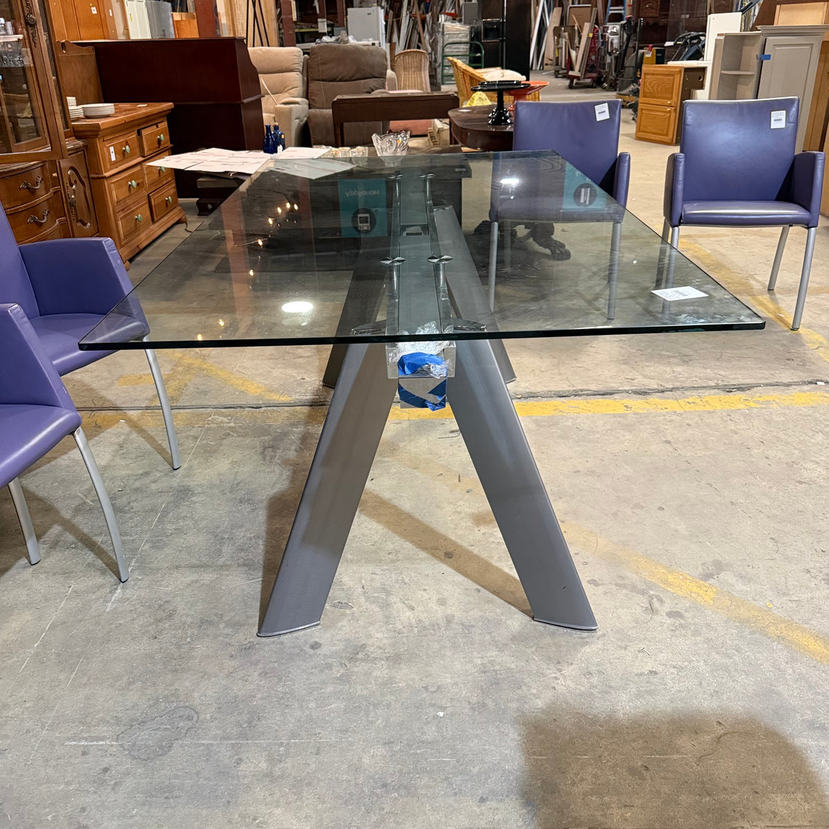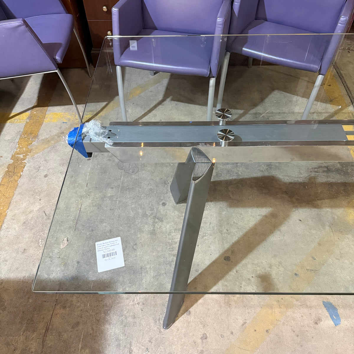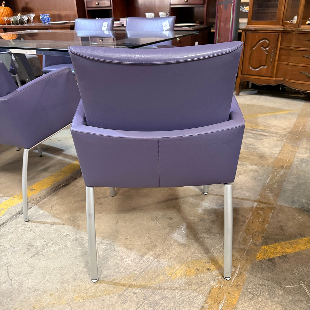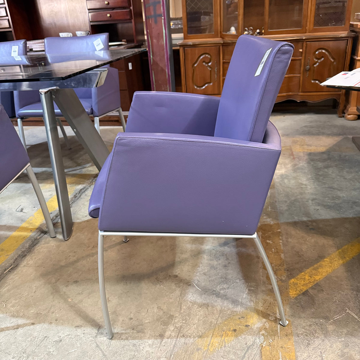 This formal, modern dining set consists of a Roche Bobois table with a rectangular, beveled edge glass top that sits on a metal base with splayed legs. The dining set also includes six purple leather upholstered arm chairs. The table comes with two additional glass leaves included to extend it.