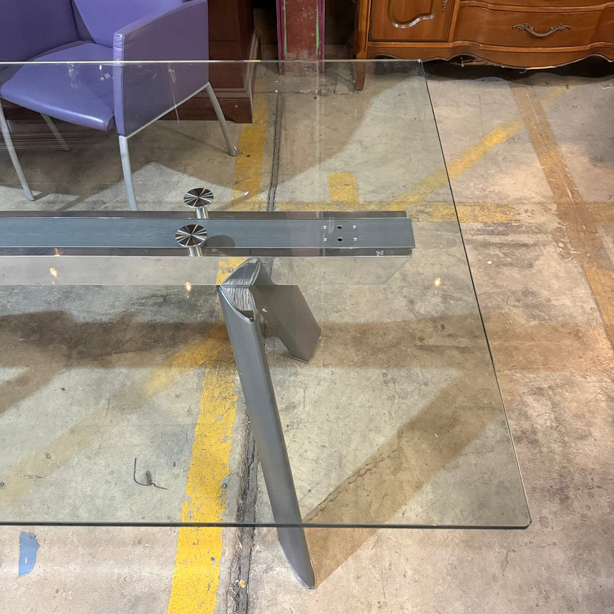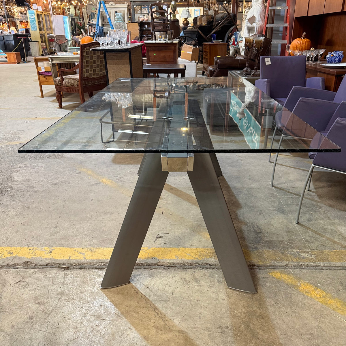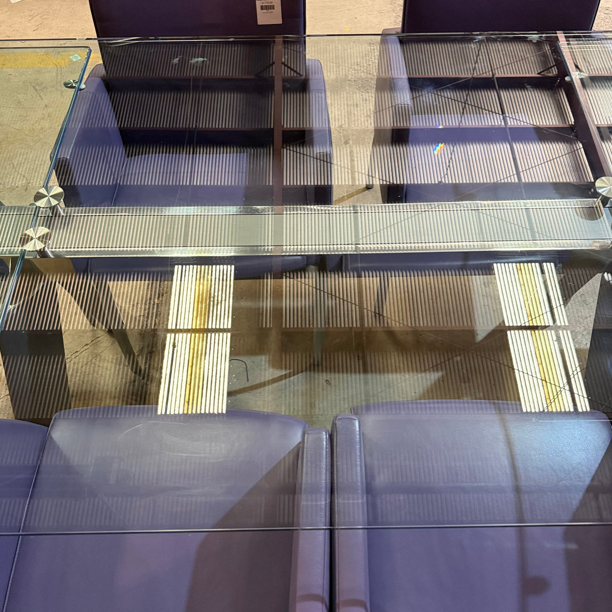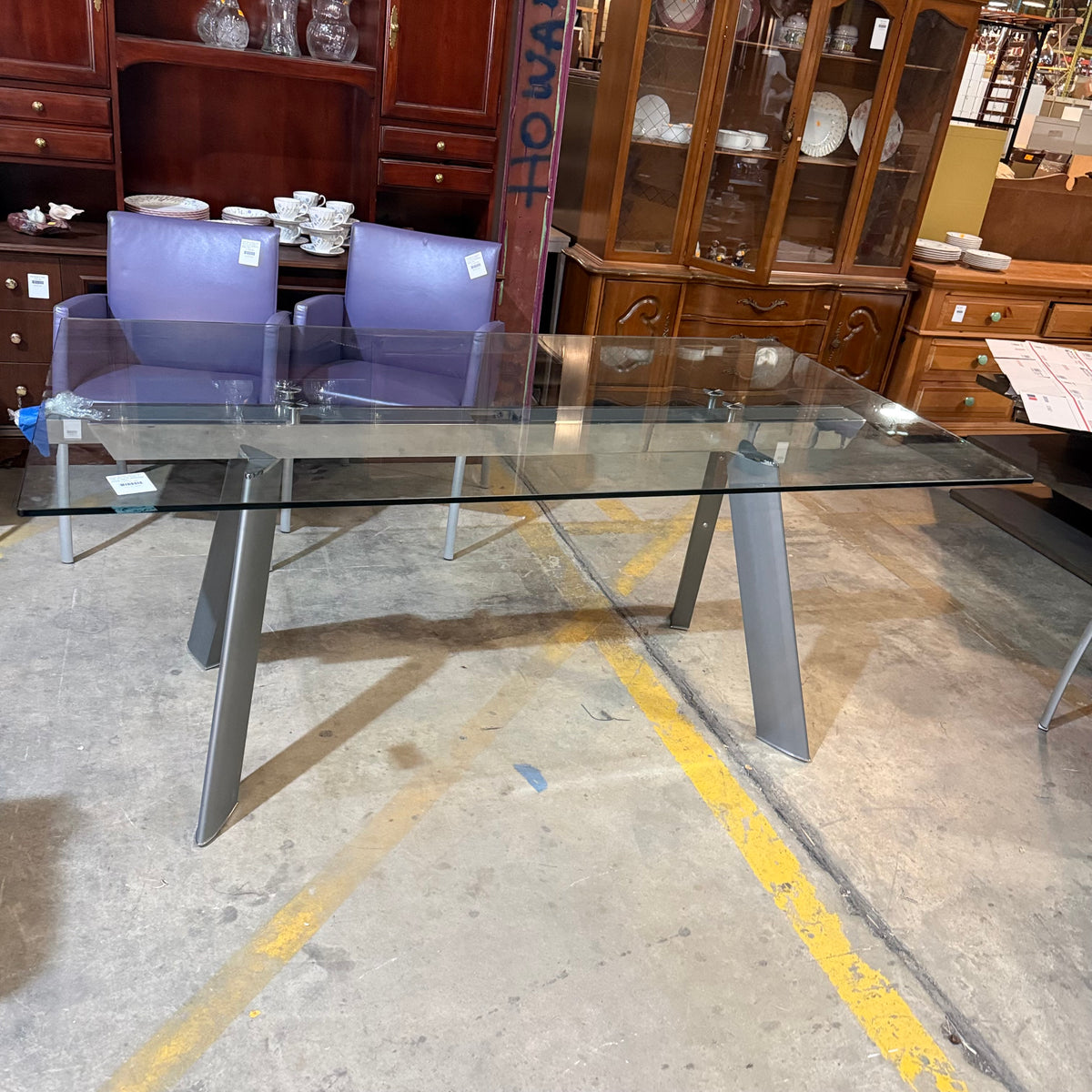 This formal, modern dining set consists of a Roche Bobois table with a rectangular, beveled edge glass top that sits on a metal base with splayed legs. The dining set also includes six purple leather upholstered arm chairs. The table comes with two additional glass leaves included to extend it.