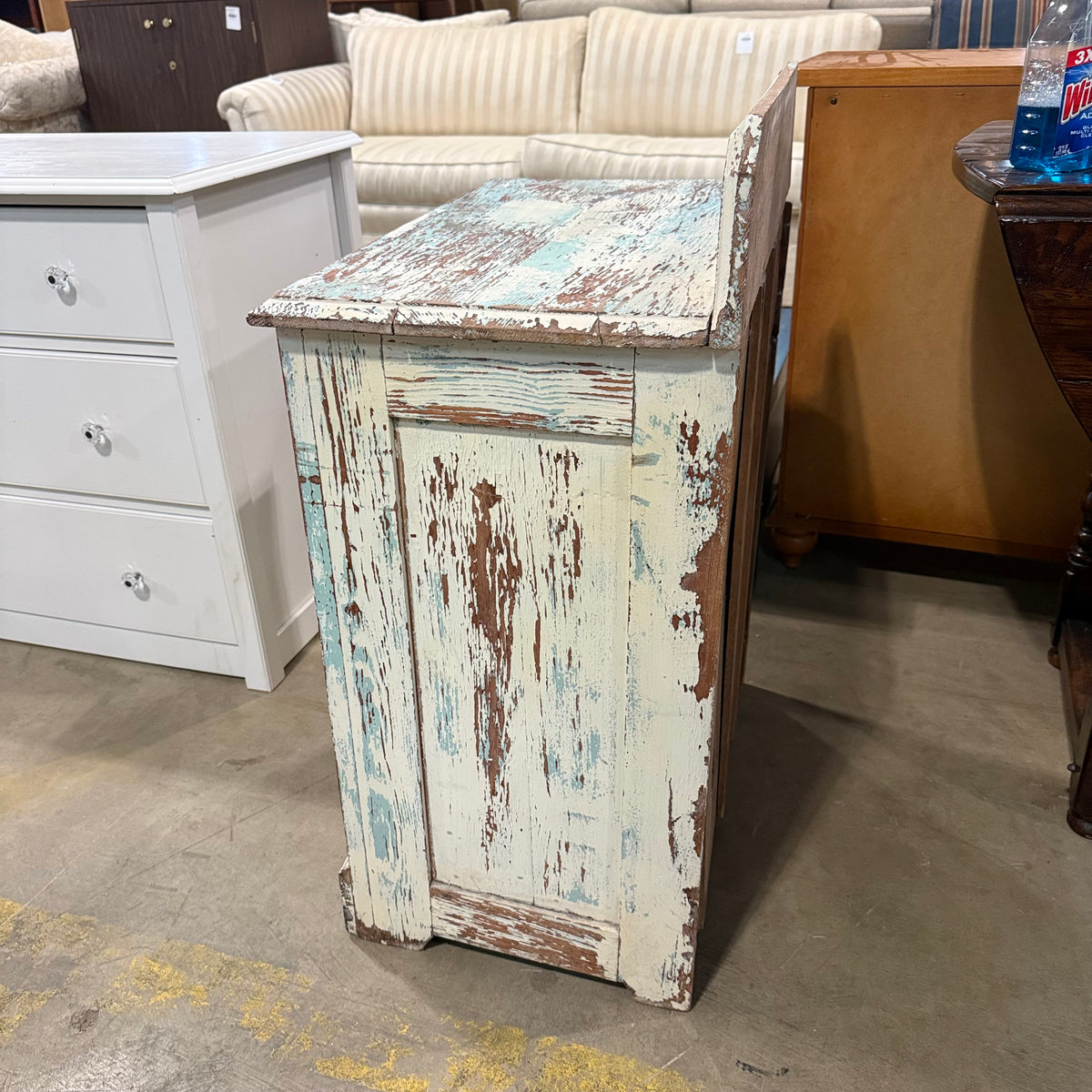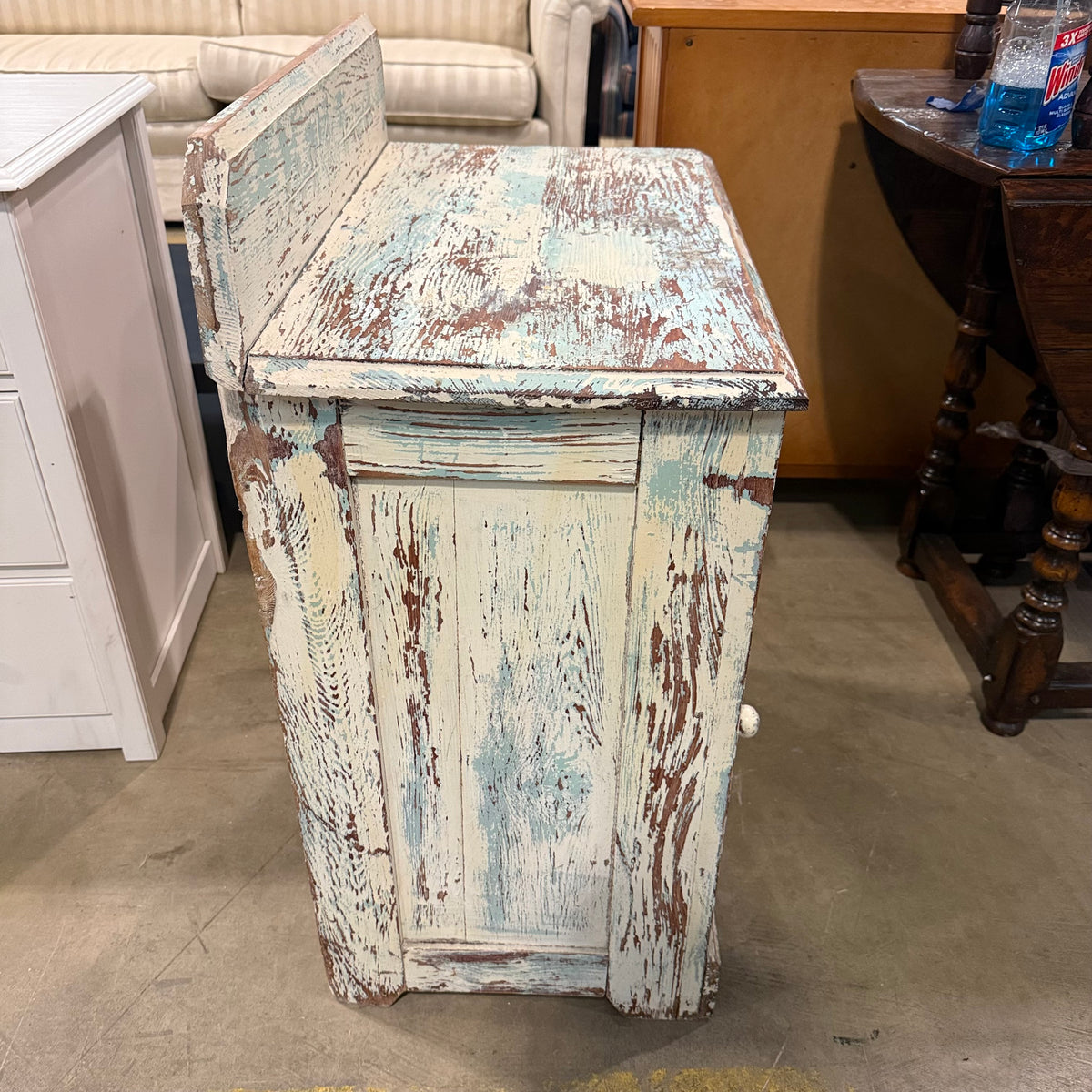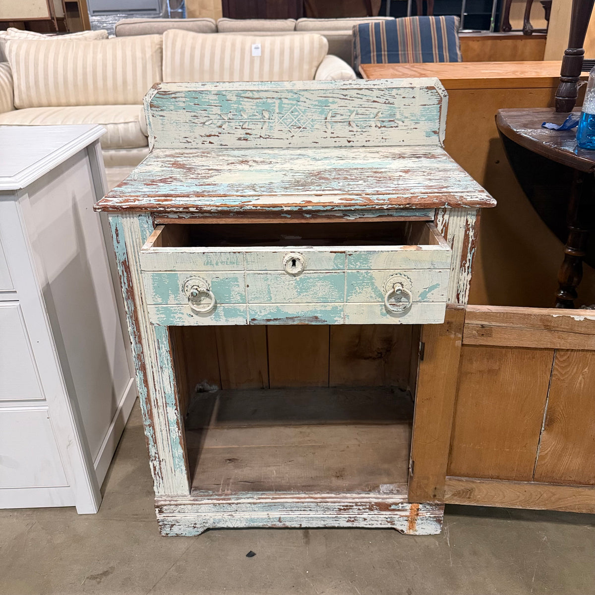 This product is a previously owned rustic farmhouse style storage cabinet. It contains a single drawer and ample storage space in the storage cabinet below. The finish is intentionally distressed.
