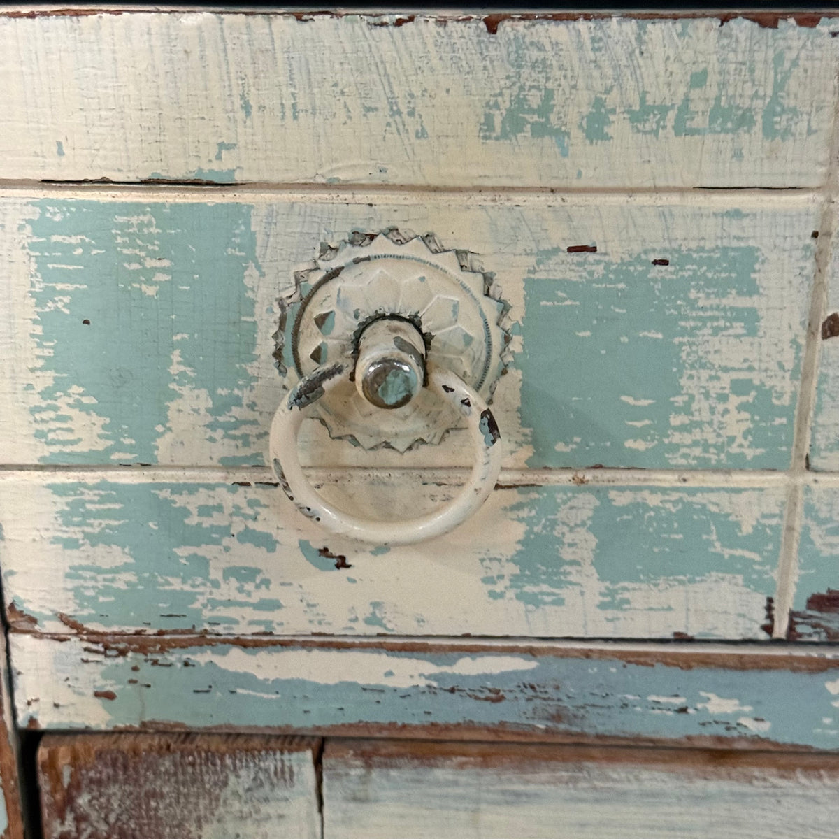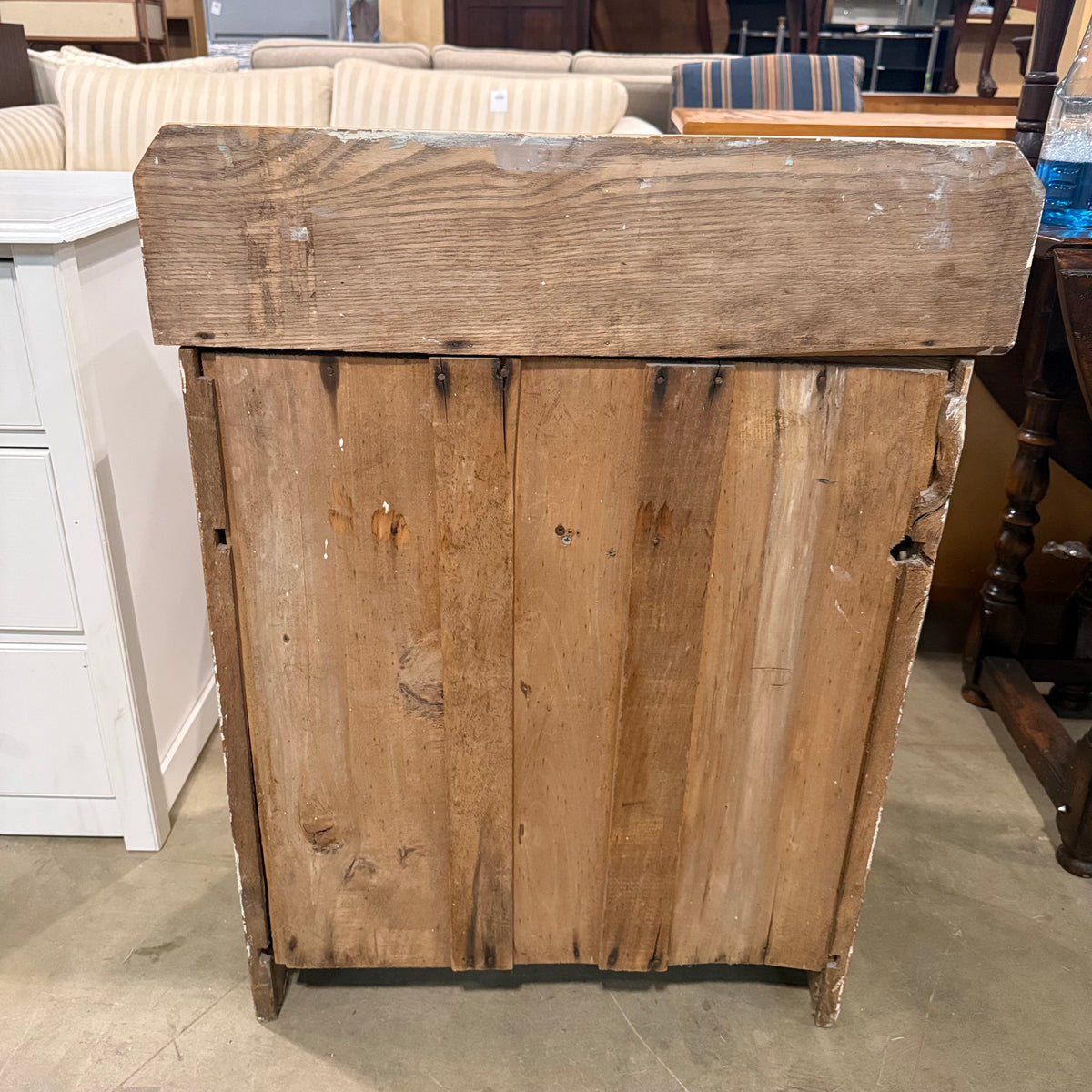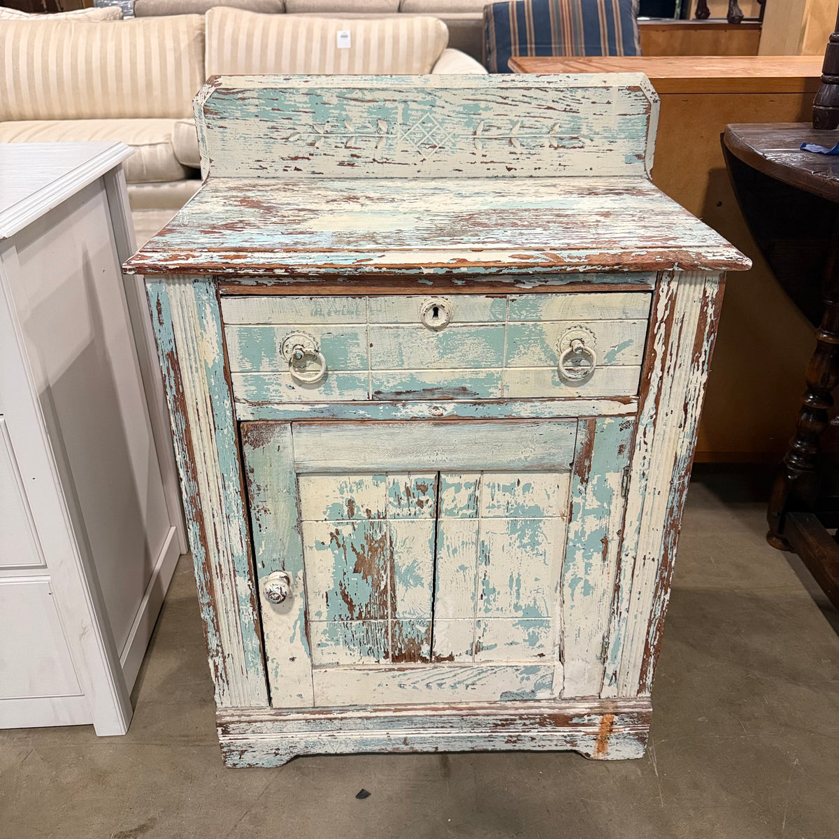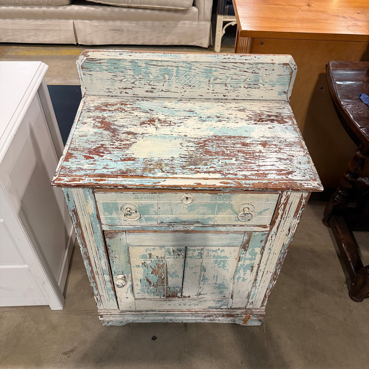 This product is a previously owned rustic farmhouse style storage cabinet. It contains a single drawer and ample storage space in the storage cabinet below. The finish is intentionally distressed.