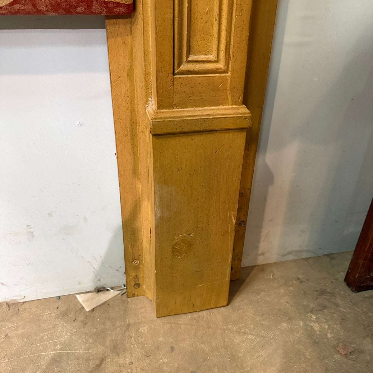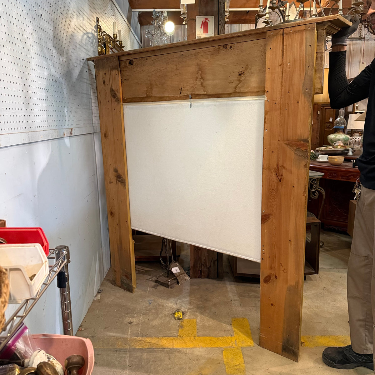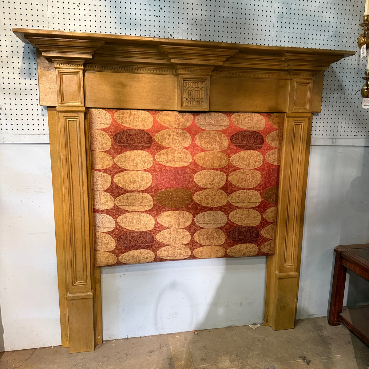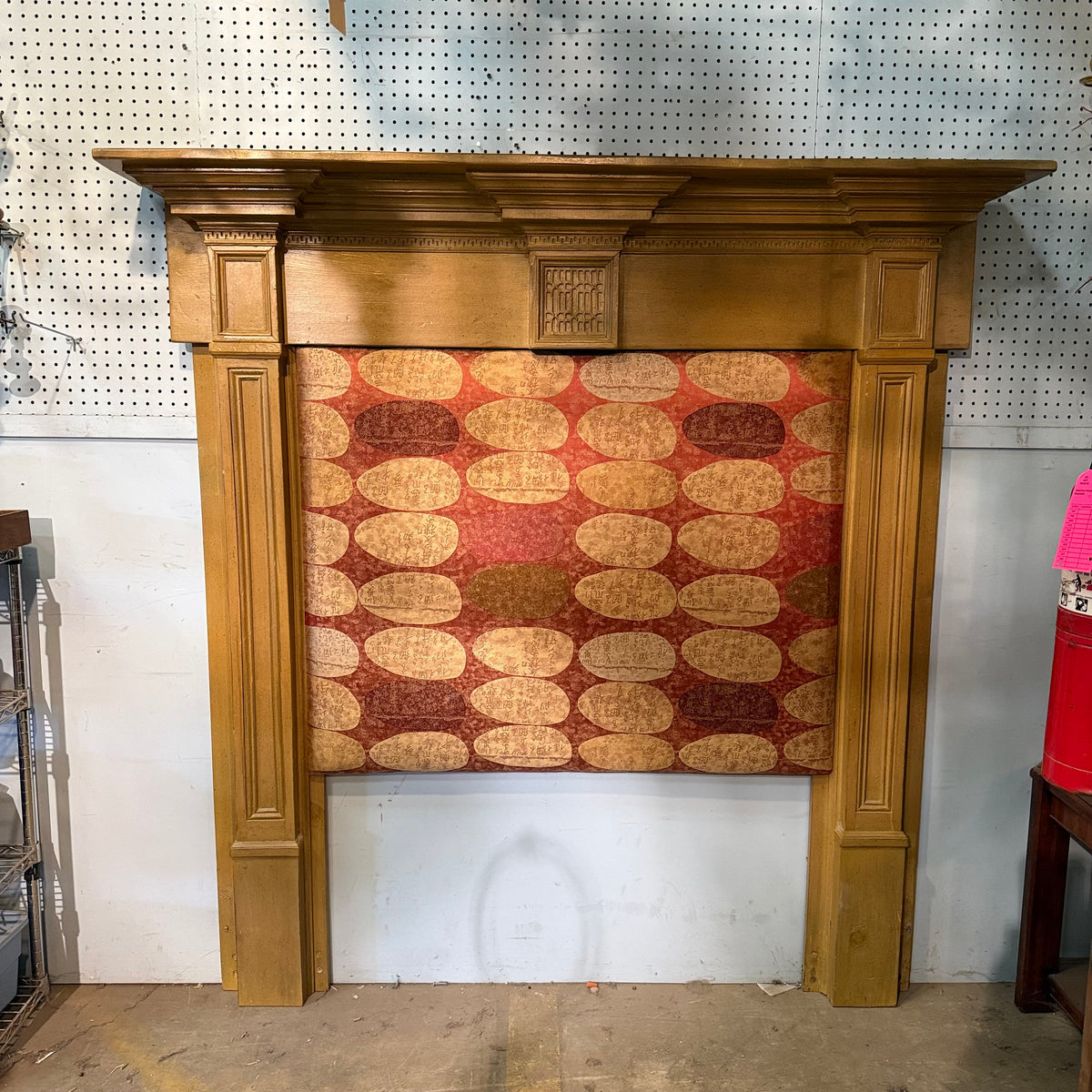This product is a previously owned salvaged fireplace mantel that's been turned into a functional headboard. It can be used as a headboard as it is or as a mantel if the fabric panel in the cutout space is removed.