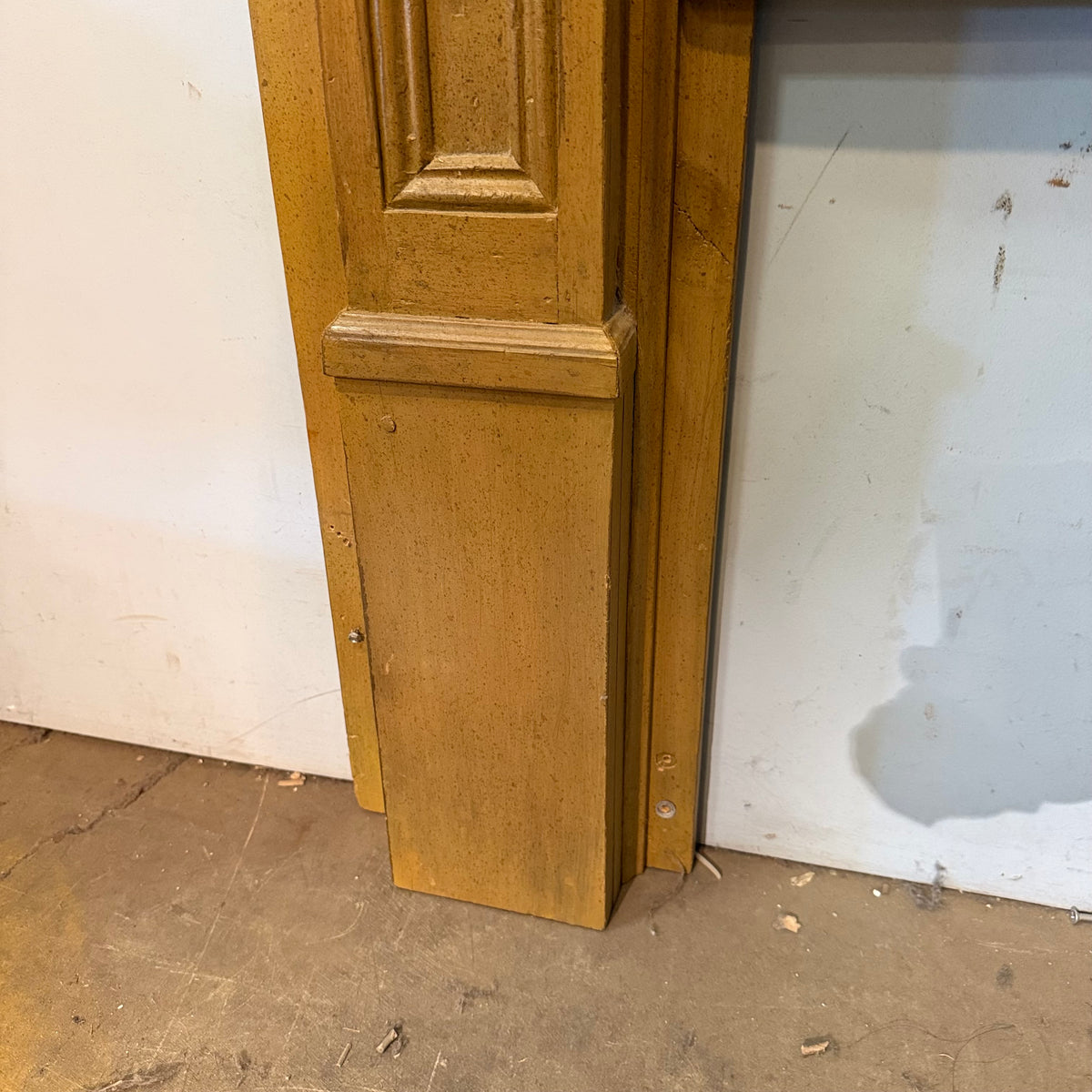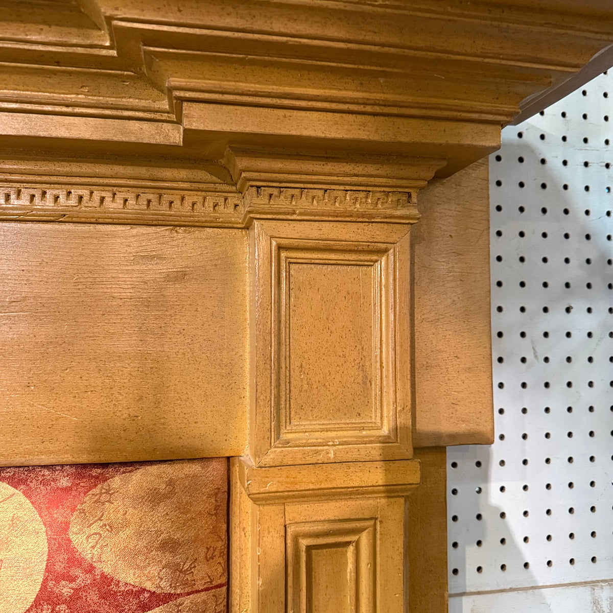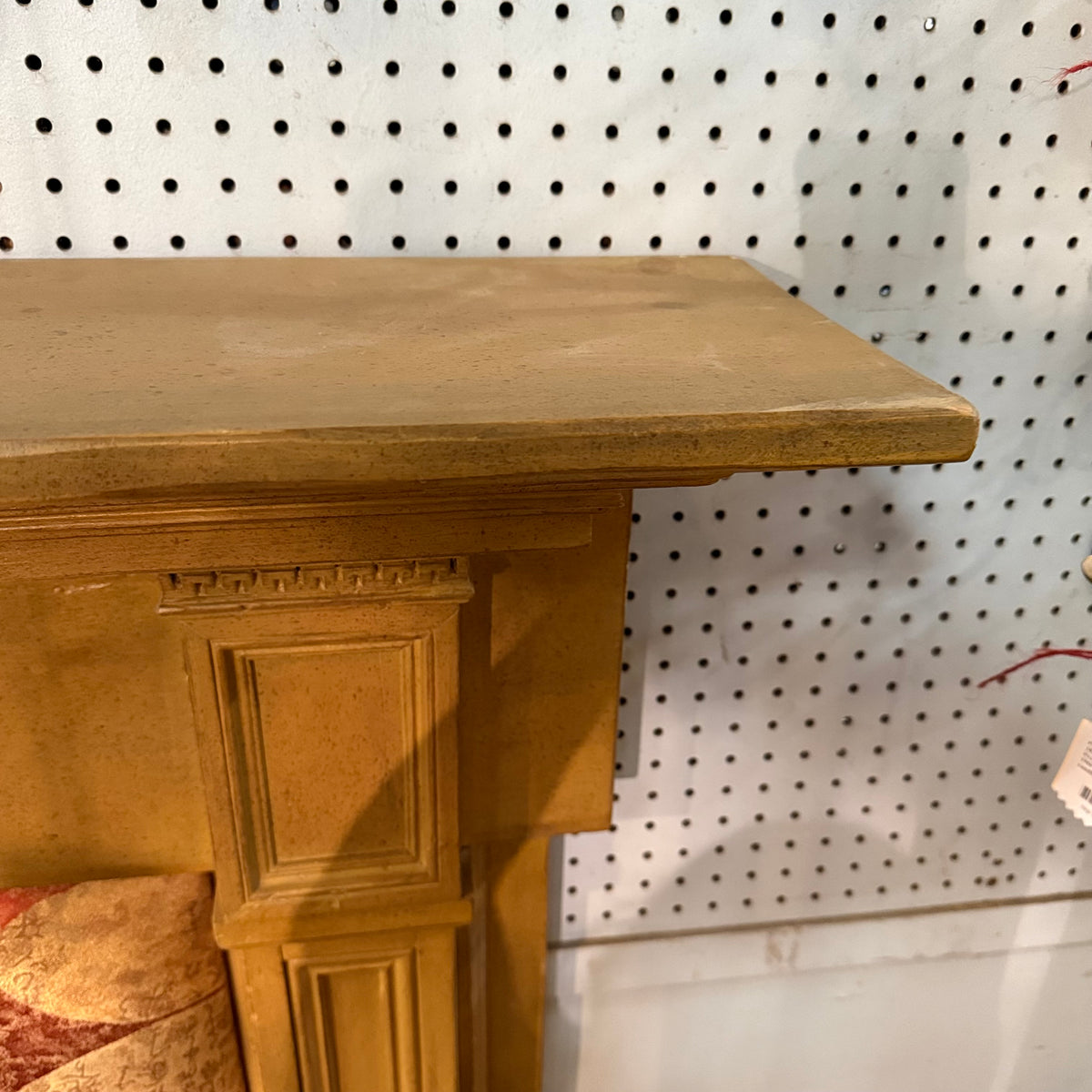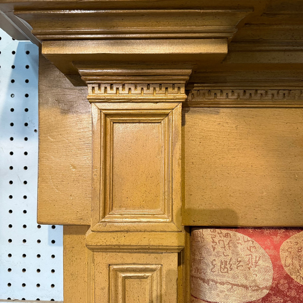 This product is a previously owned salvaged fireplace mantel that's been turned into a functional headboard. It can be used as a headboard as it is or as a mantel if the fabric panel in the cutout space is removed.