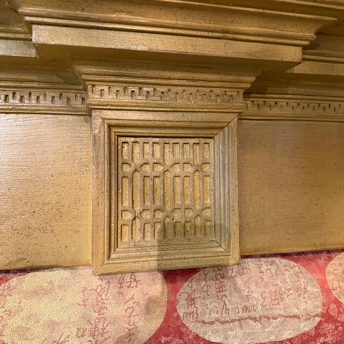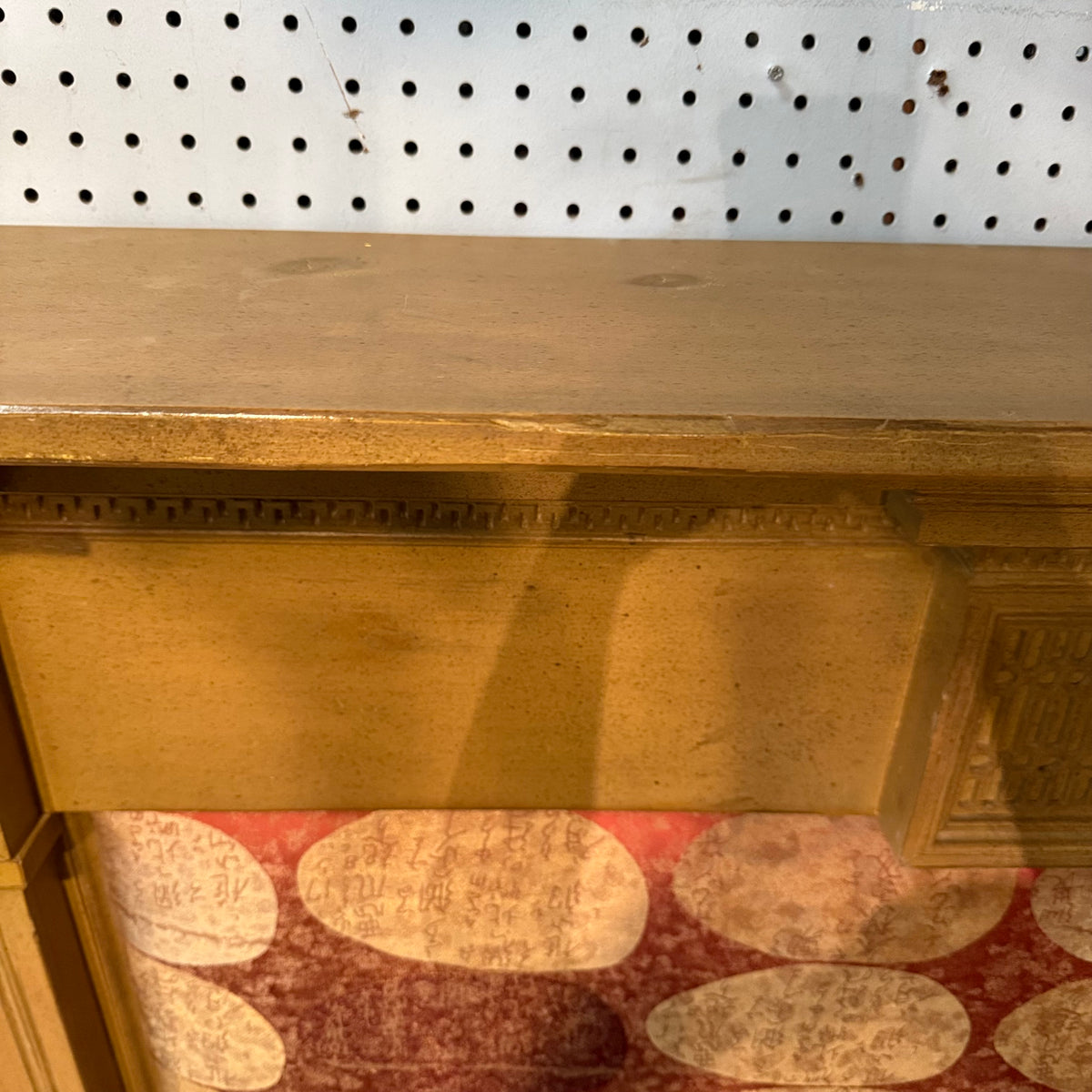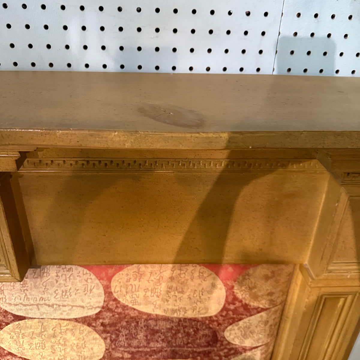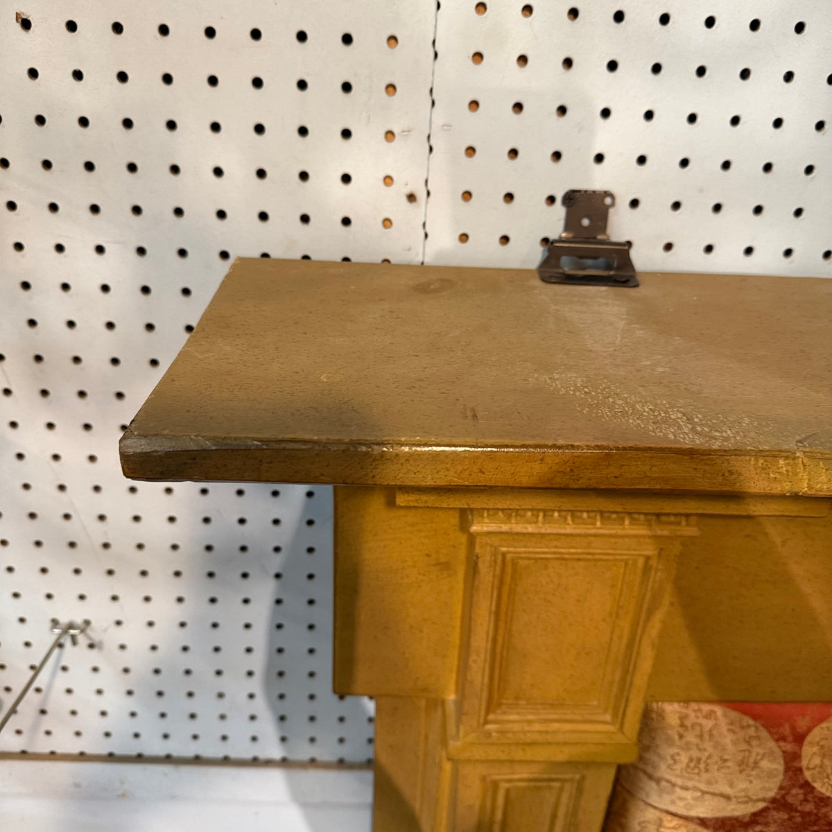 This product is a previously owned salvaged fireplace mantel that's been turned into a functional headboard. It can be used as a headboard as it is or as a mantel if the fabric panel in the cutout space is removed.