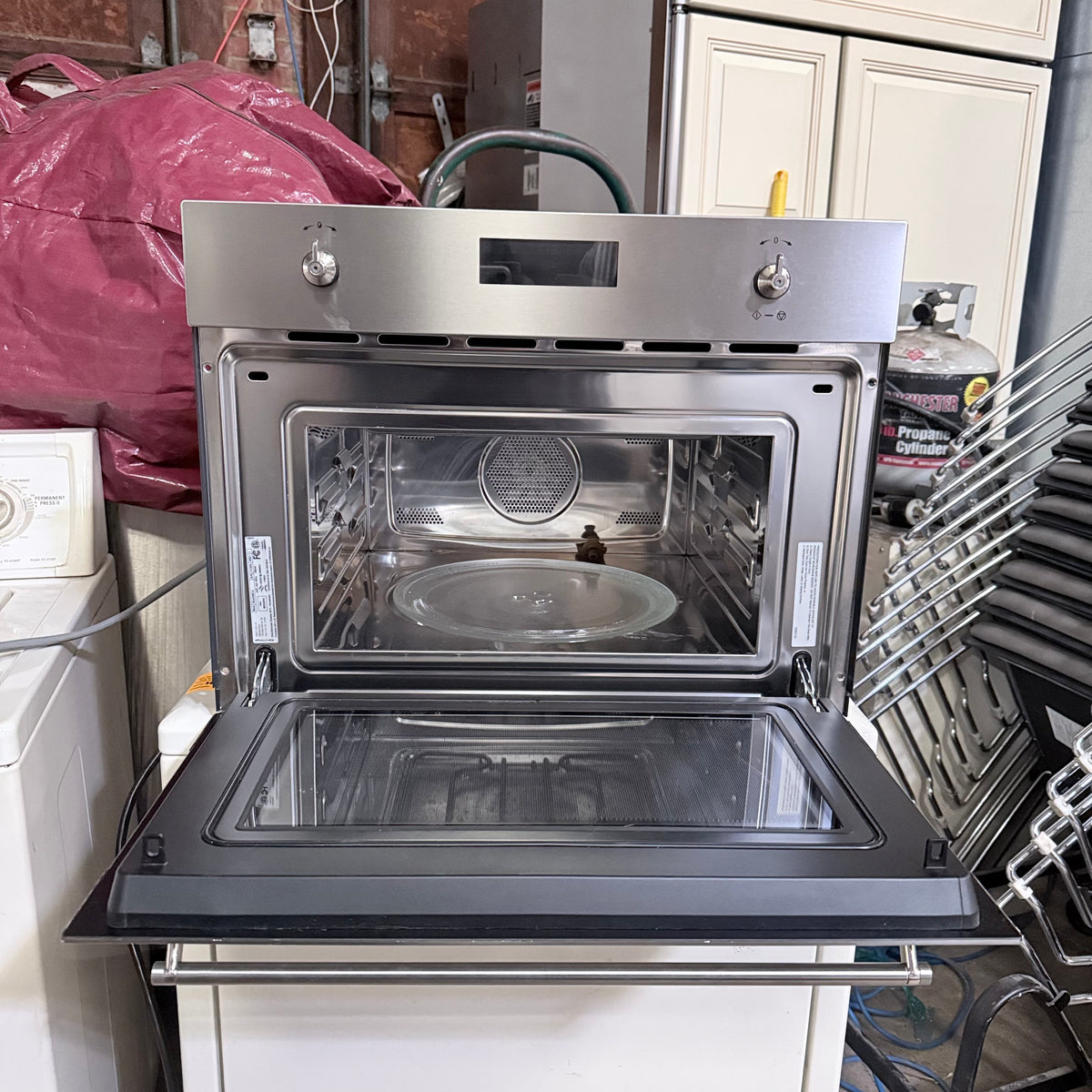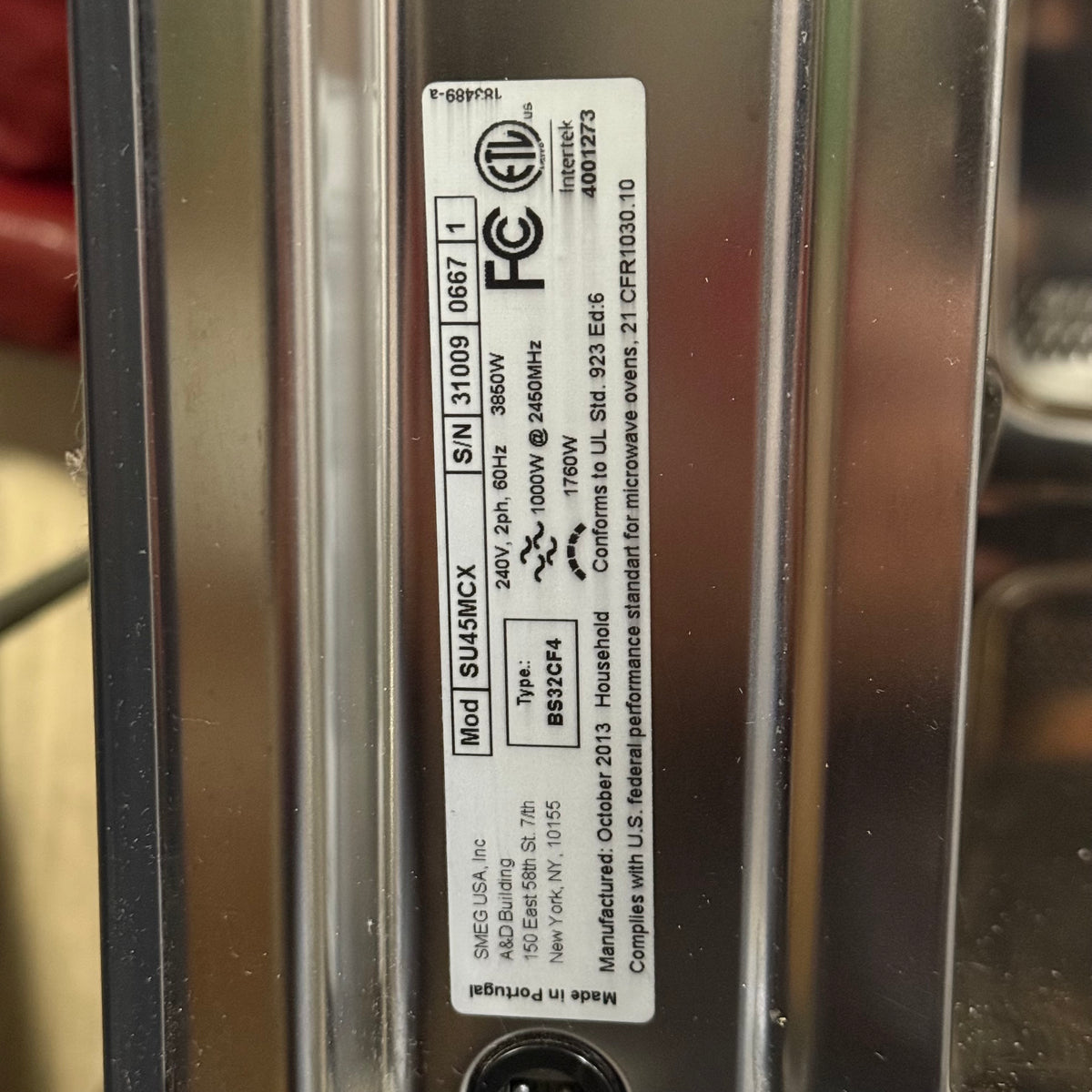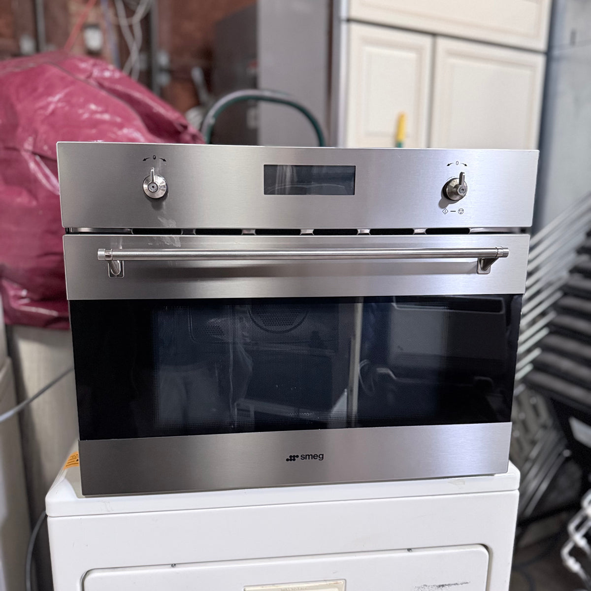 This product is a previously owned built-in electric speed oven with microwave by Smeg. Features: