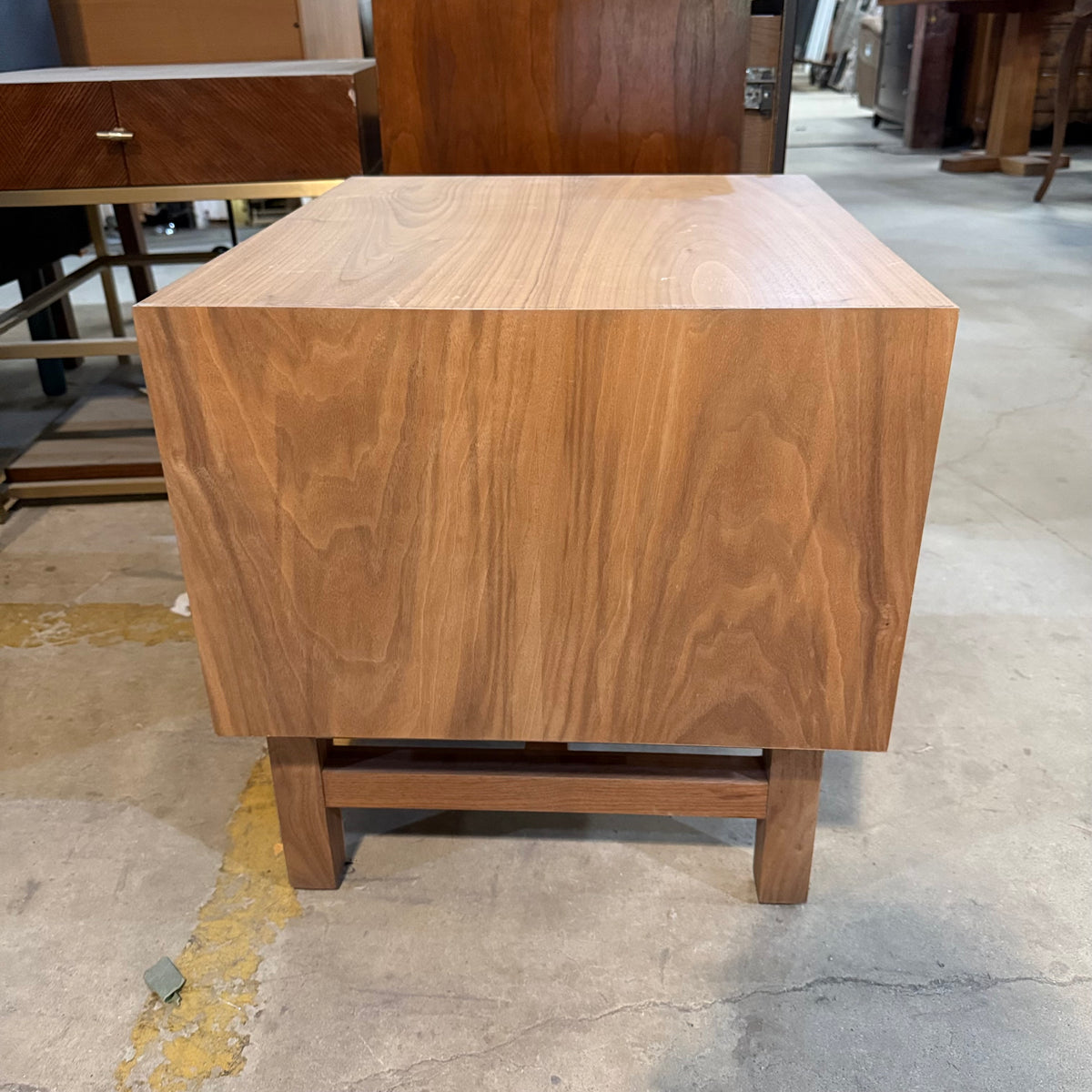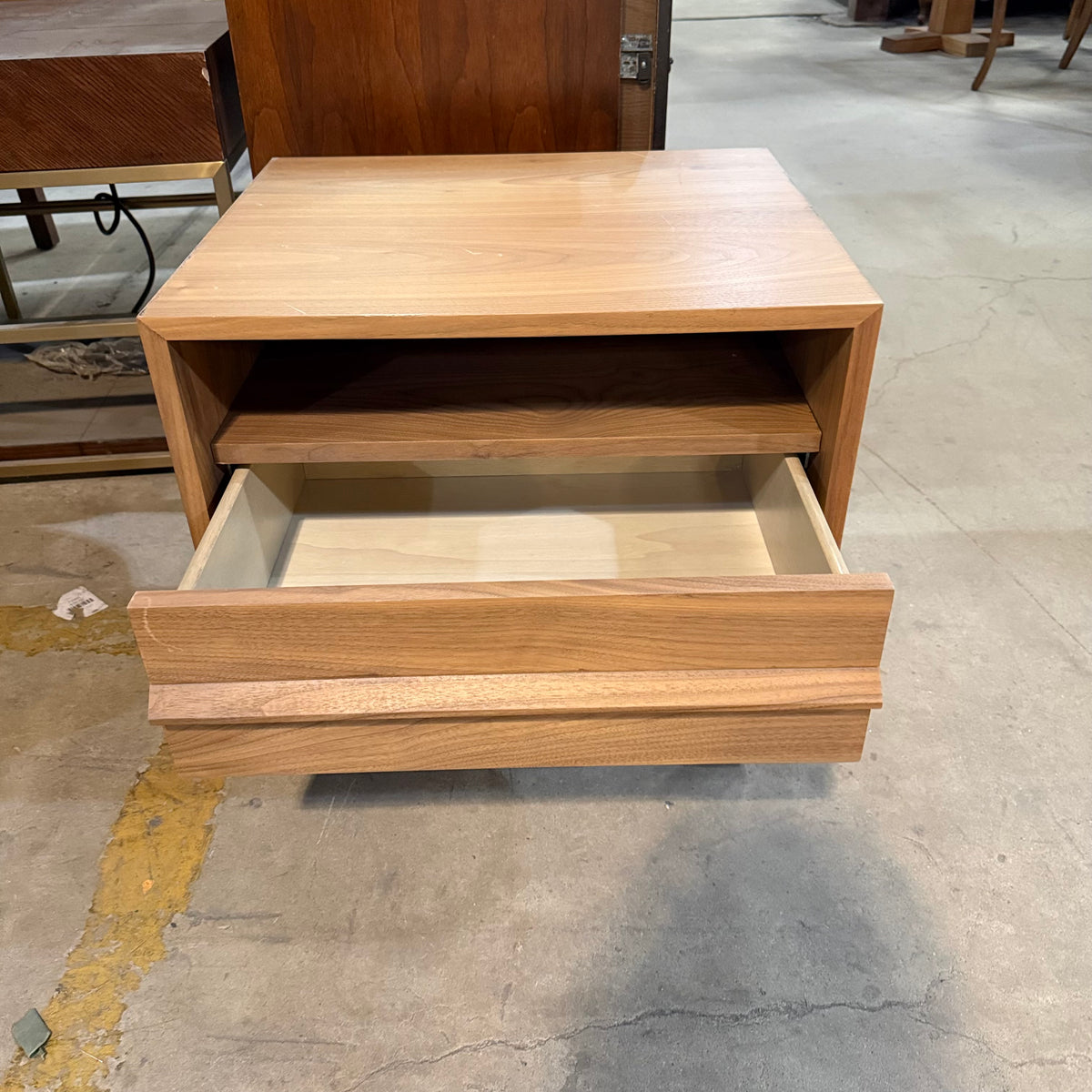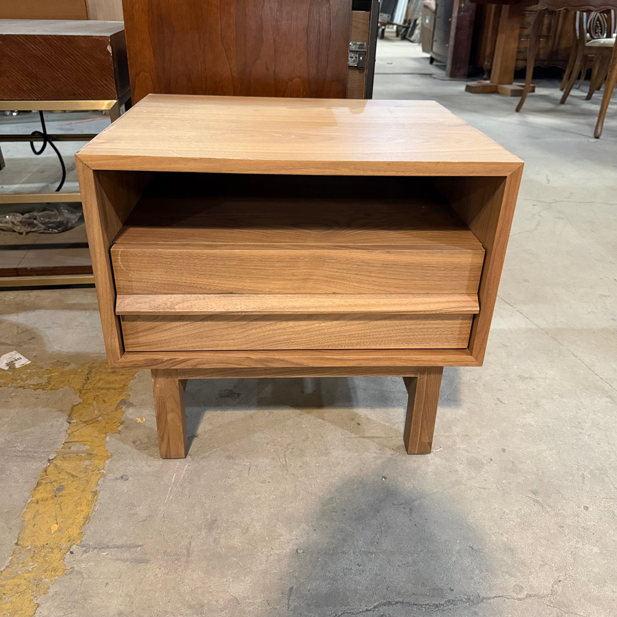 This product is a previously owned nightstand by Marcel from their 'EQ3' collection. It sits on straight feet joined by a stretcher and features an open shelf area up top and a single drawer below. It is constructed from solid oak wood and finished in a natural stain.