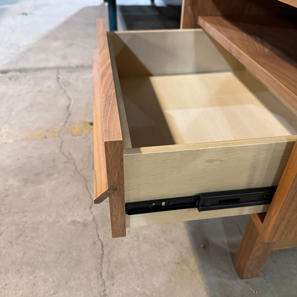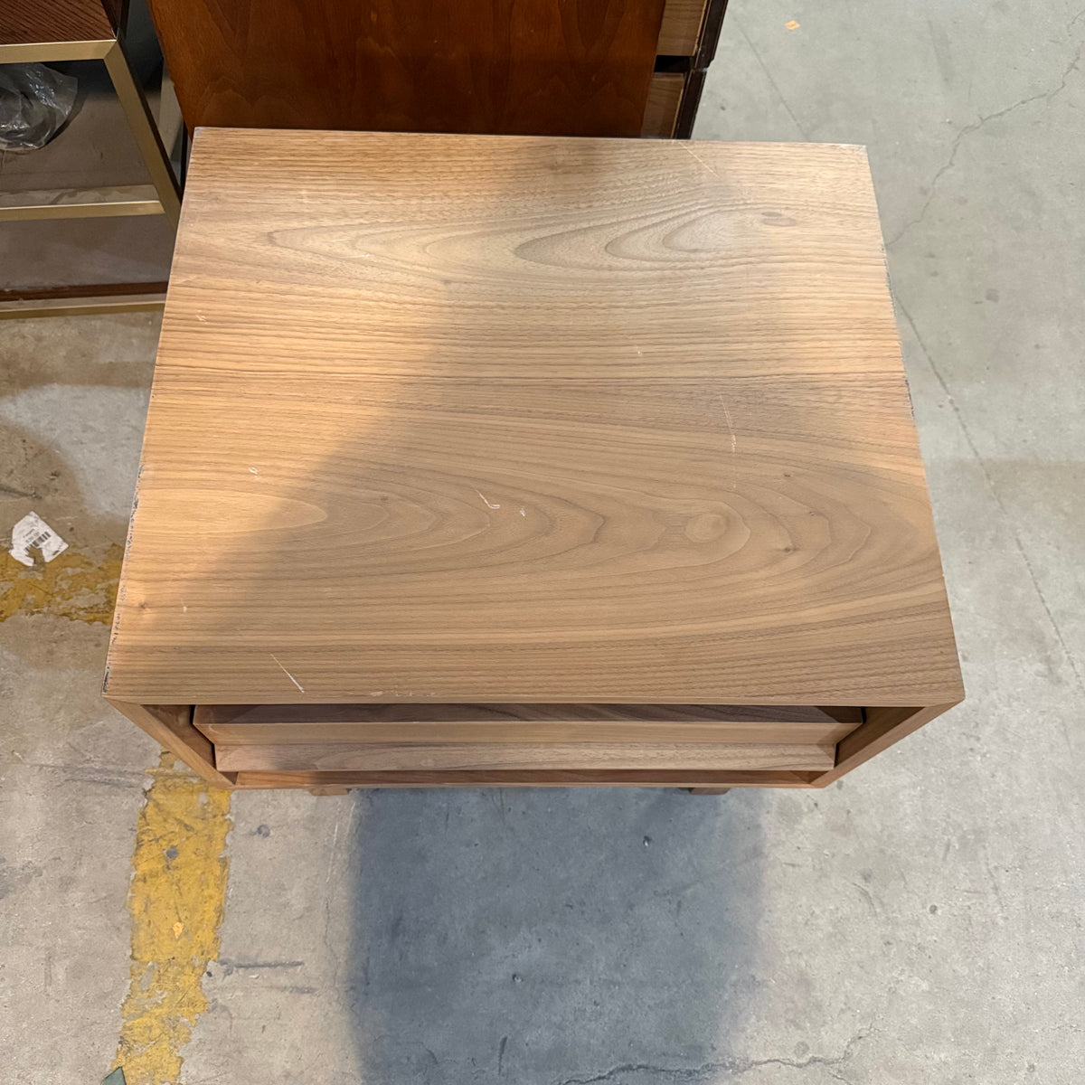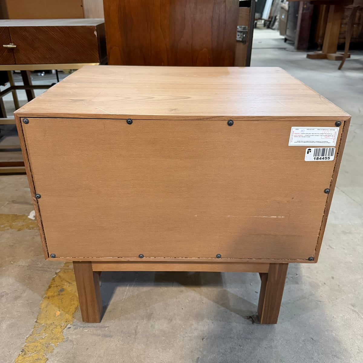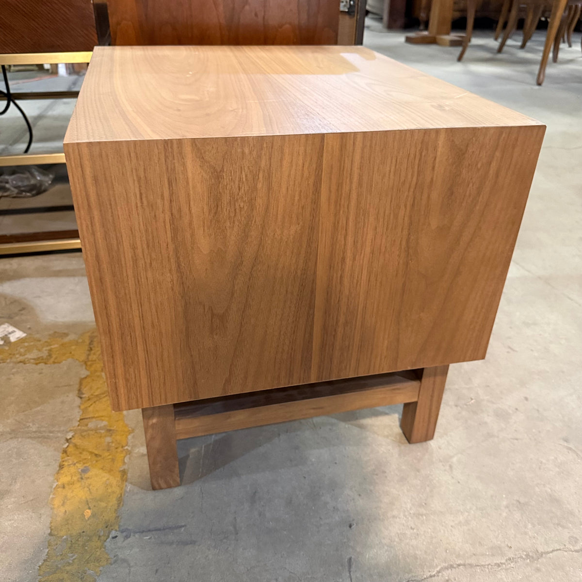 This product is a previously owned nightstand by Marcel from their 'EQ3' collection. It sits on straight feet joined by a stretcher and features an open shelf area up top and a single drawer below. It is constructed from solid oak wood and finished in a natural stain.