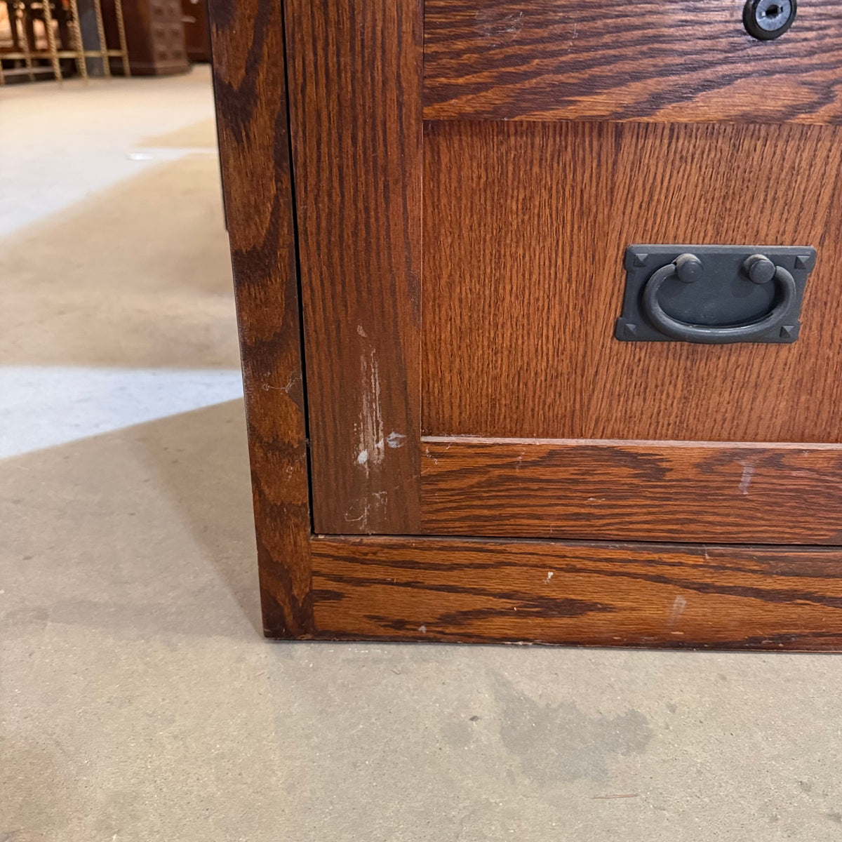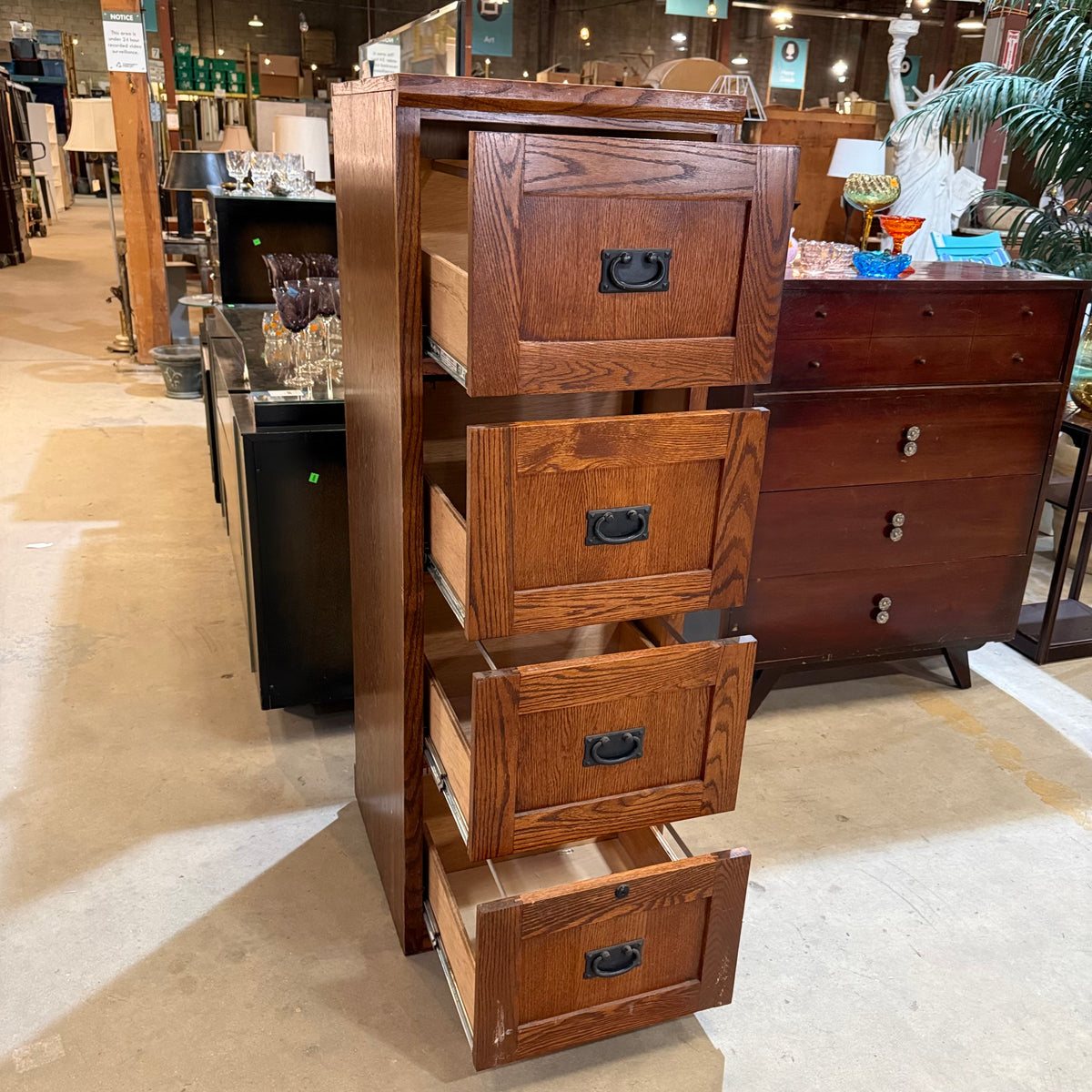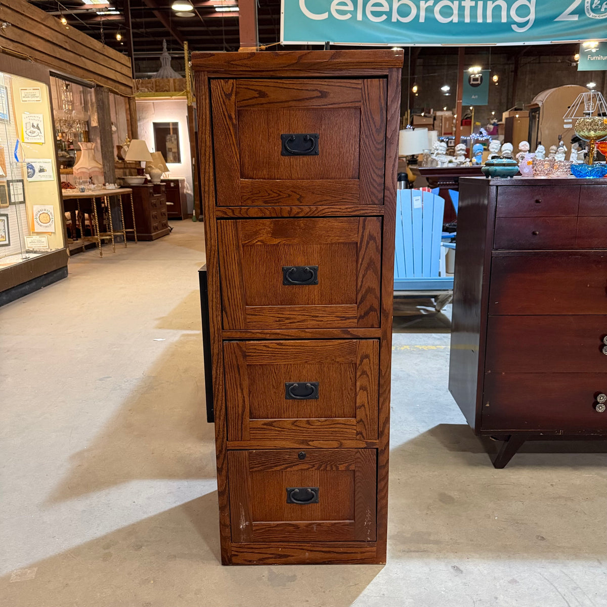 This contemporary Mission style solid oak filing cabinet features four, spacious drawers with reproduction drop bail pulls typical of the Mission style. This filing cabinet stands on a sturdy base with hidden caster wheels underneath. Three of the four drawers are lined with filing rails. There is no key included.