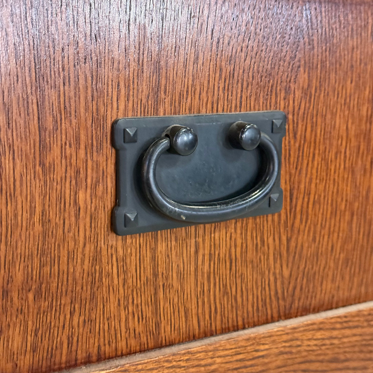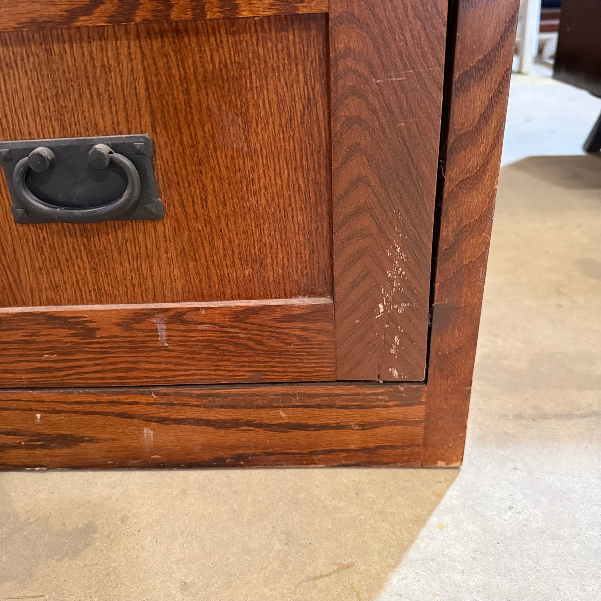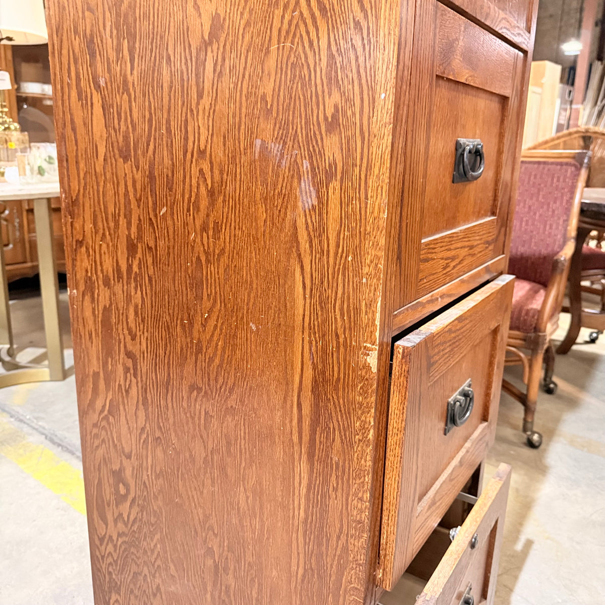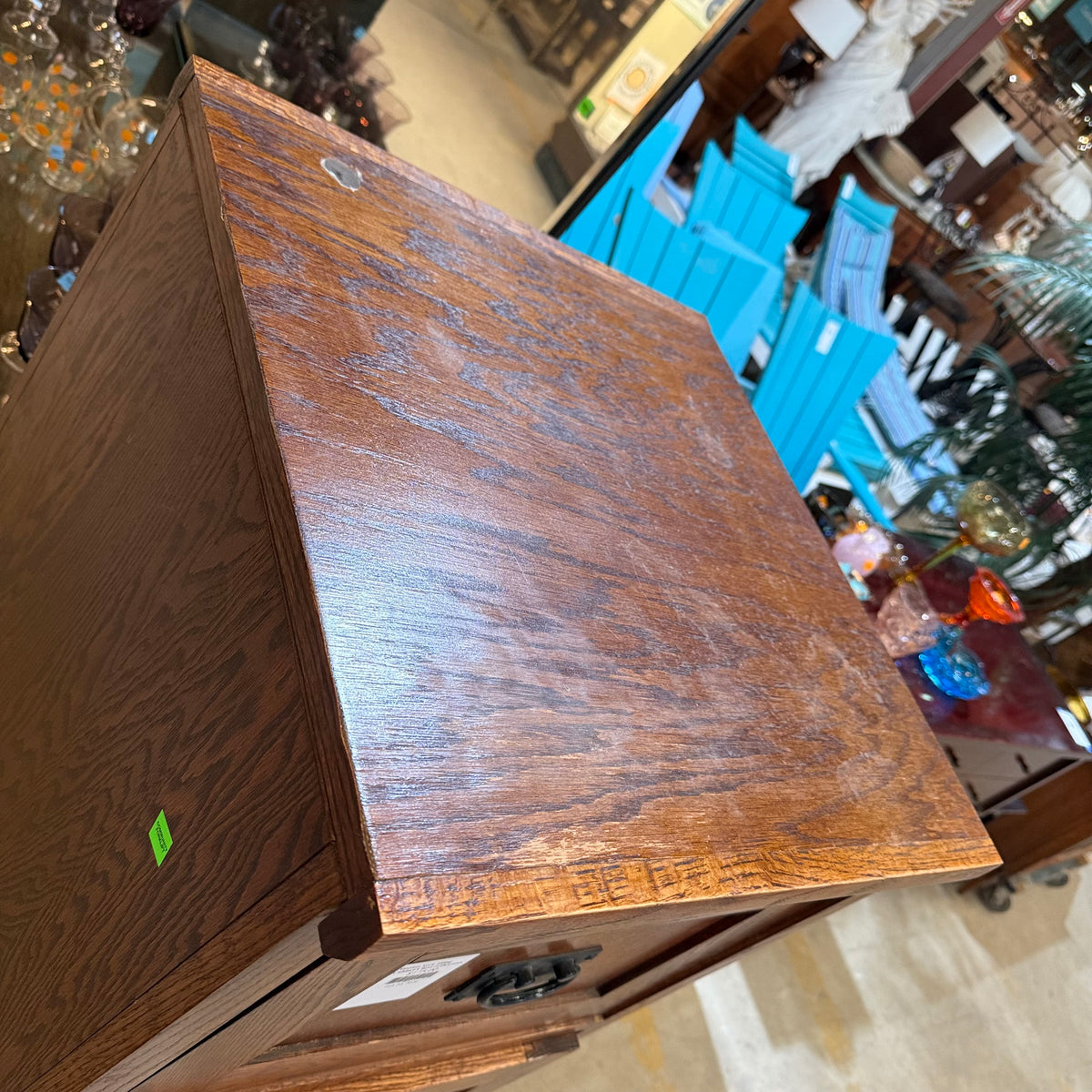 This contemporary Mission style solid oak filing cabinet features four, spacious drawers with reproduction drop bail pulls typical of the Mission style. This filing cabinet stands on a sturdy base with hidden caster wheels underneath. Three of the four drawers are lined with filing rails. There is no key included.