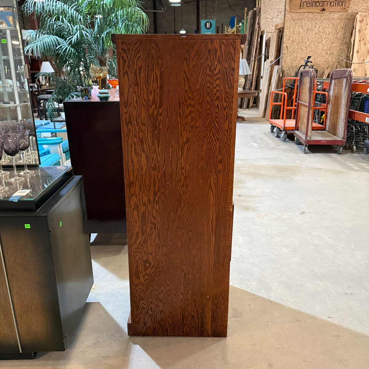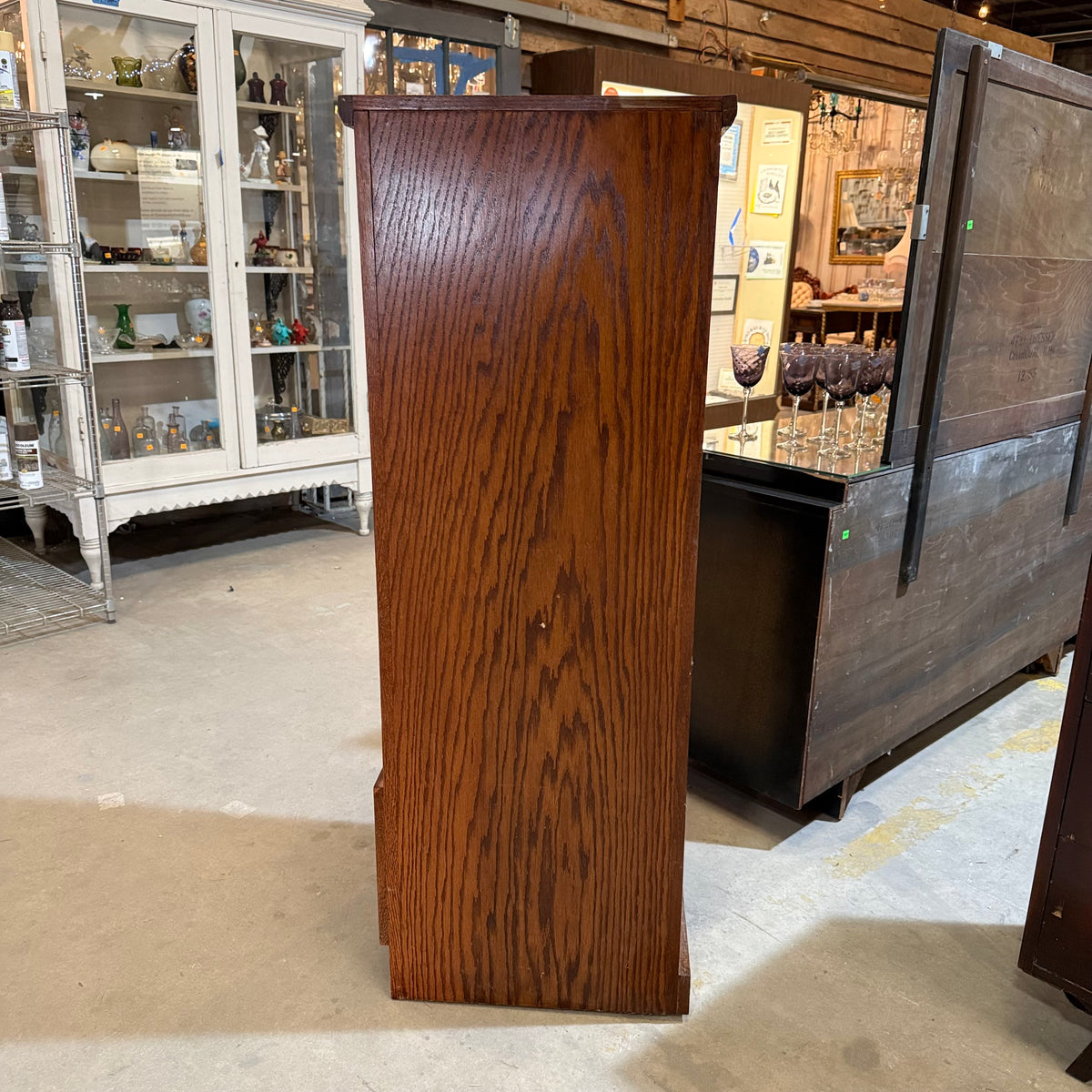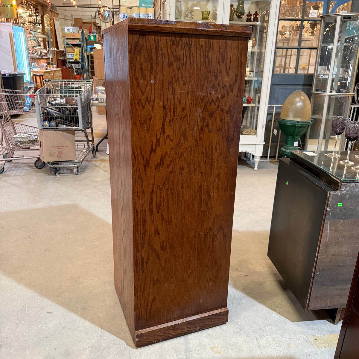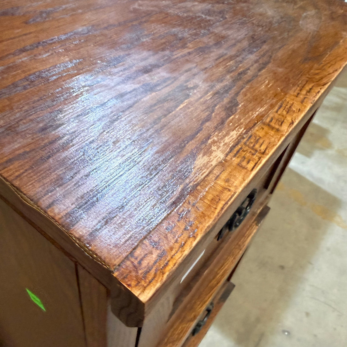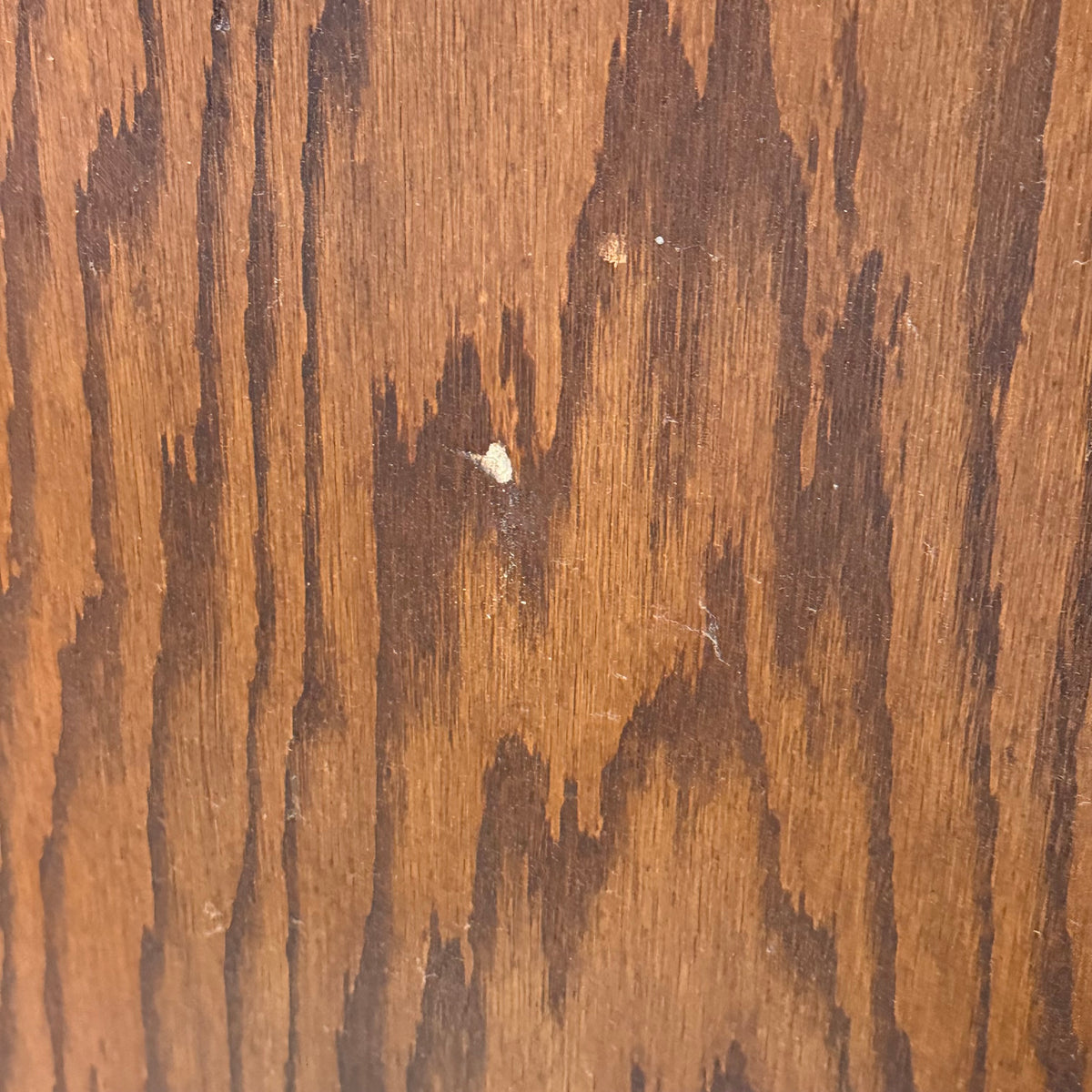 Please note, this filing cabinet has caster wheels underneath, but one of the wheels is damaged, causing the last two drawers slowly slide out at times from standing slightly unevenly. Please also note, there a few small chips, nicks and scuff marks to the front of this filing cabinet and on both sides. There is also some fading and overall wear to the finish along the surface top (see photos).
