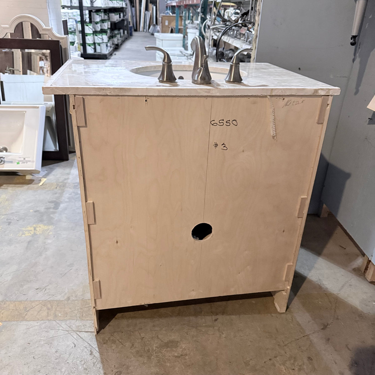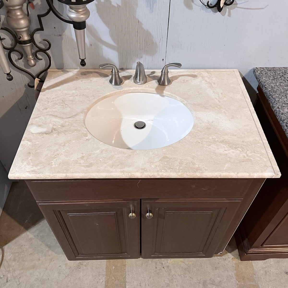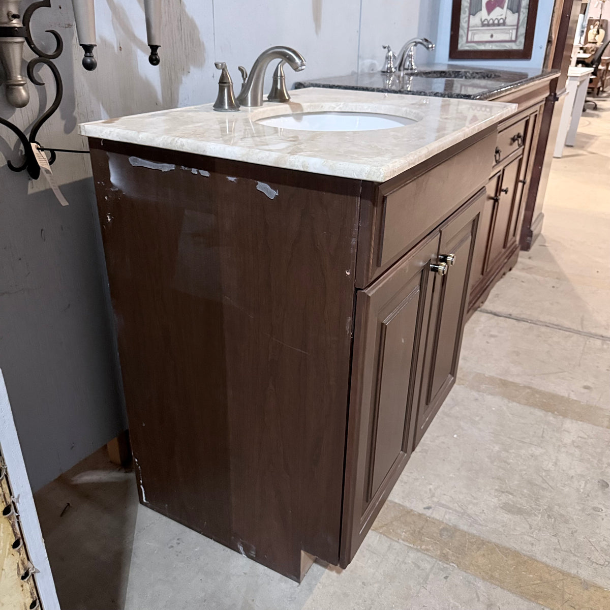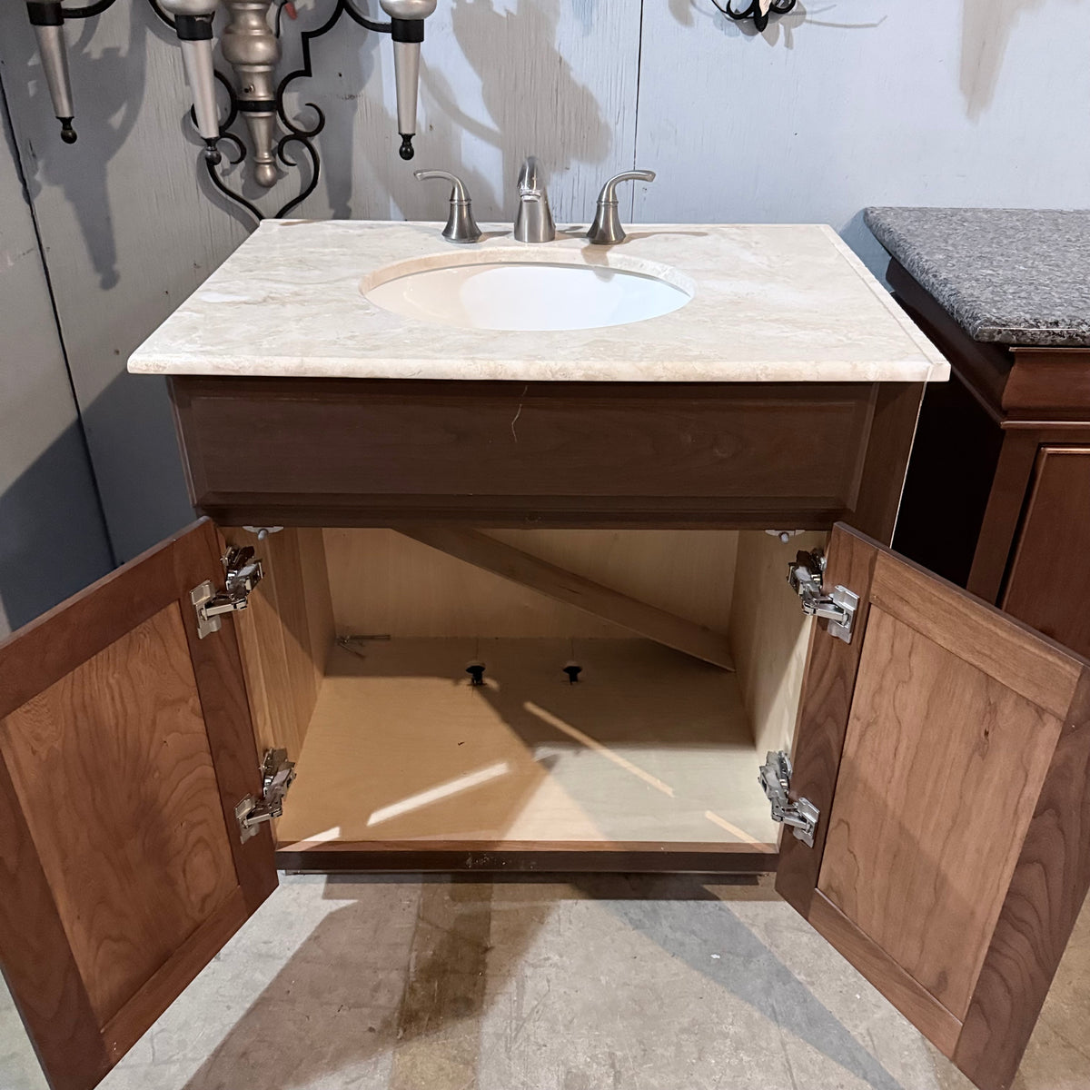 This previously owned, freestanding single bathroom vanity features a naturally stained base with a cream colored stone countertop and an undermount sink installed. The sink comes with Kohler brushed nickel faucet and draining hardware. The base contains ample storage space in the cabinet below behind the double doors. The right side of this vanity is unfinished but the left side is finished.