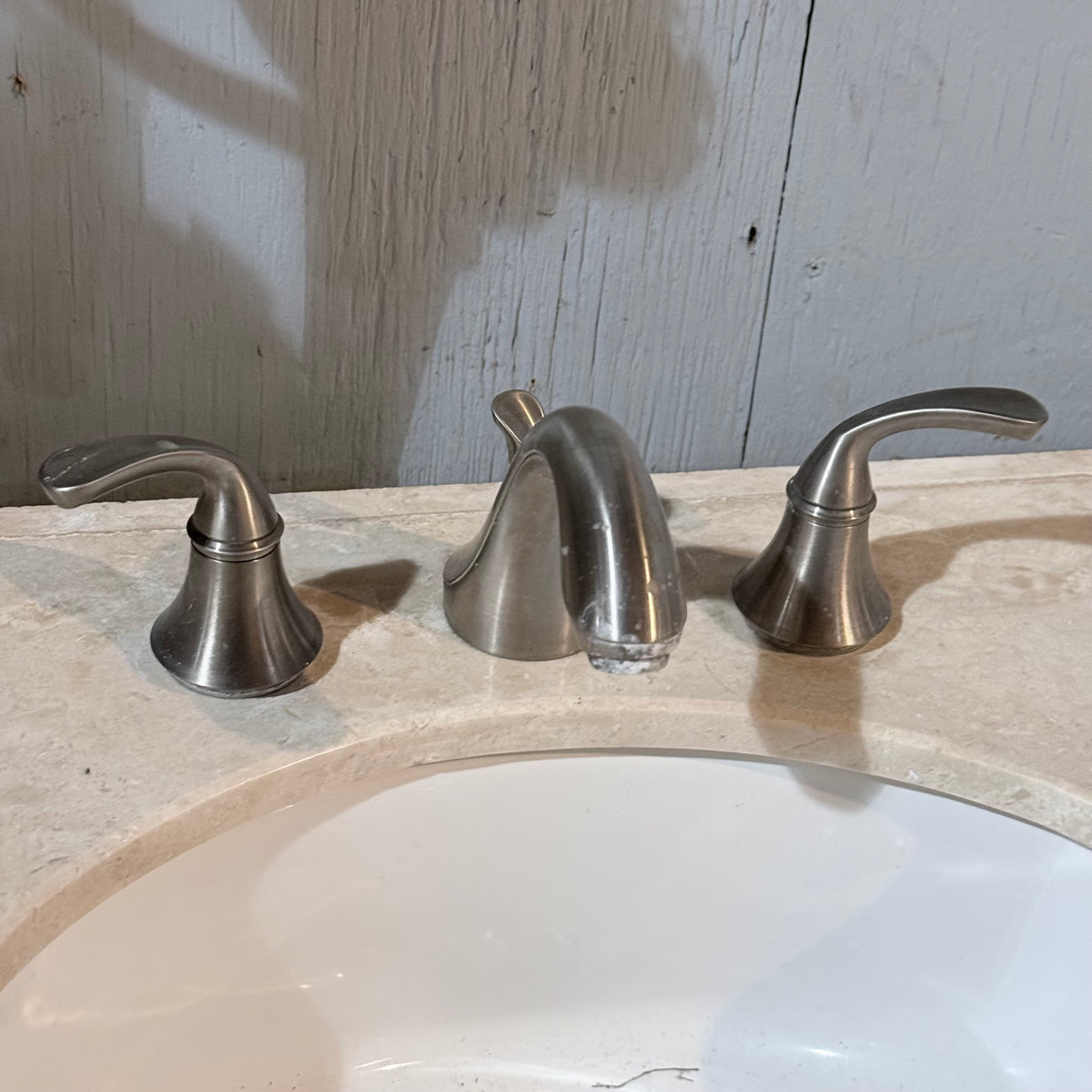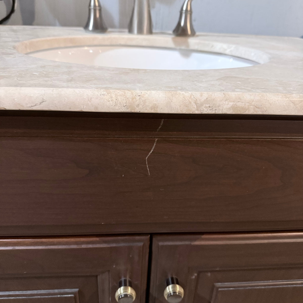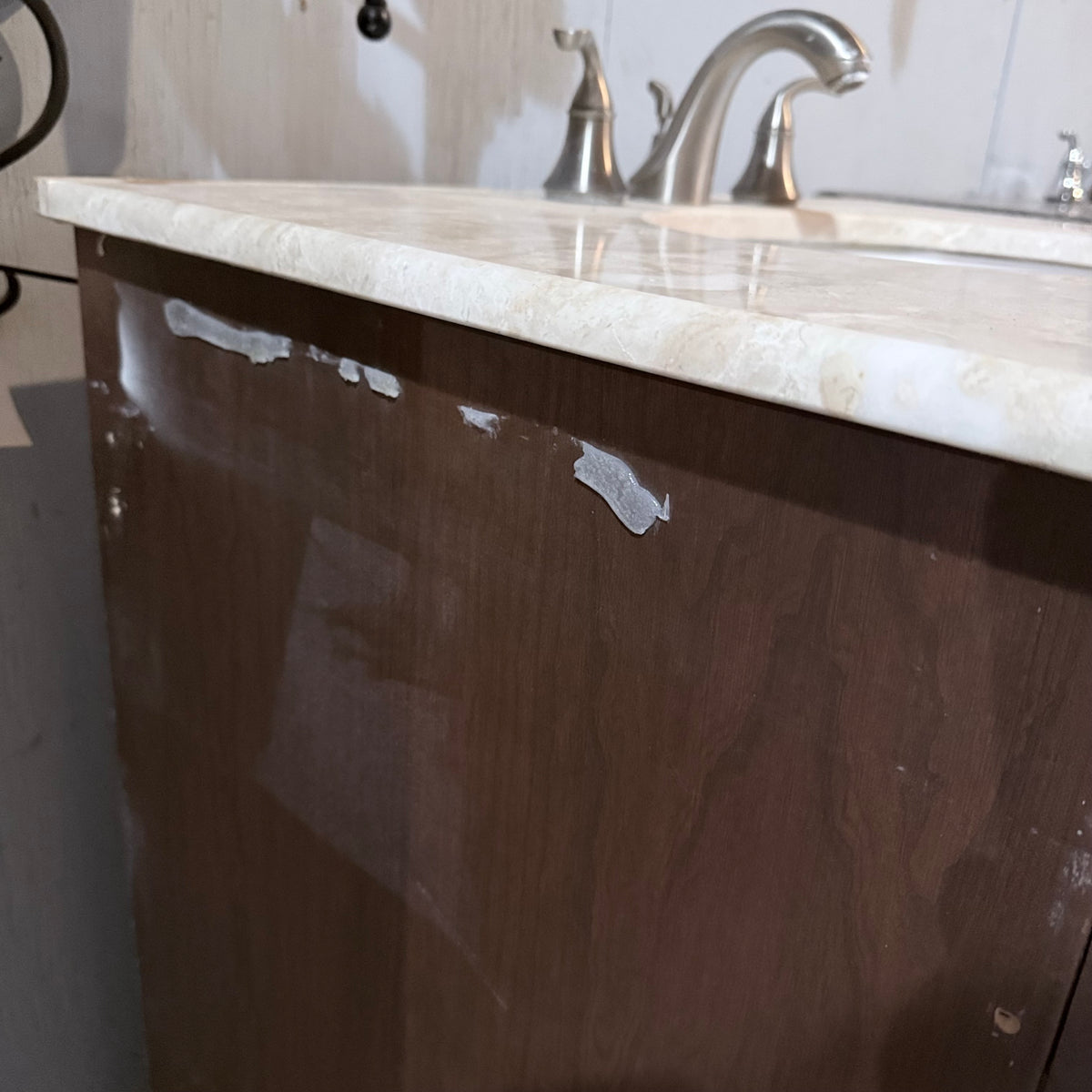 Please note, the draining hardware is incomplete and missing the drain cover. There is also a small but noticeable scratch to the front of this vanity and some gunk/residue along the left side from deinstallation (see photos).