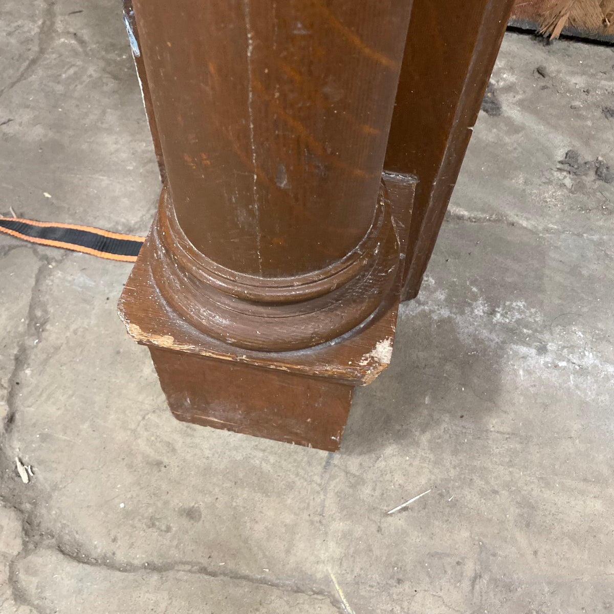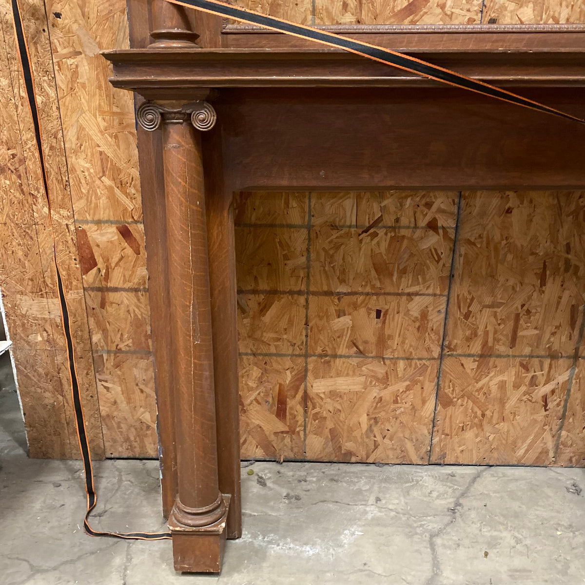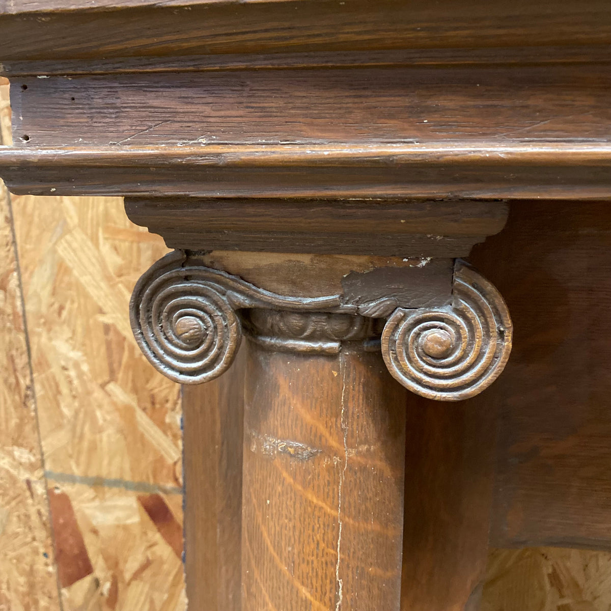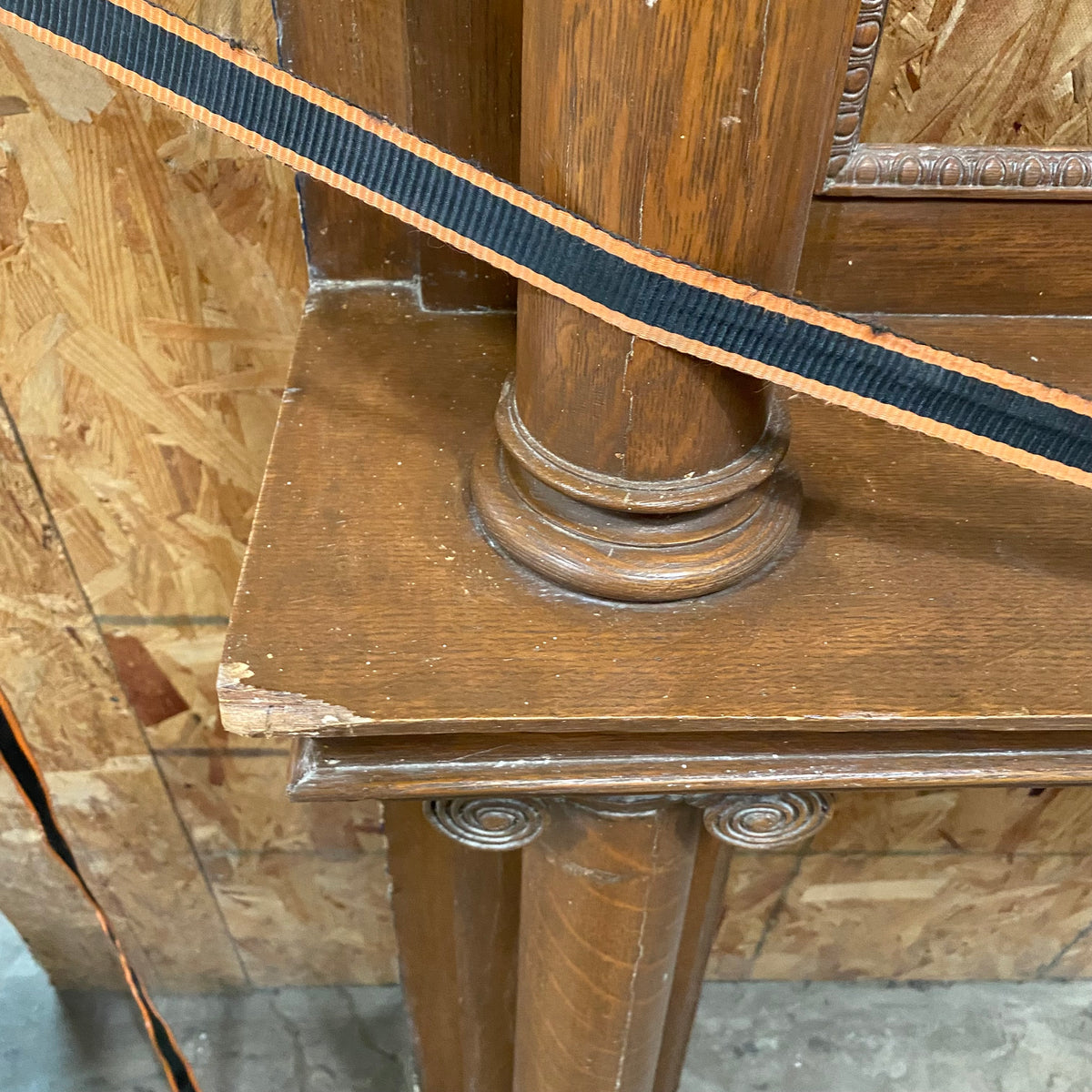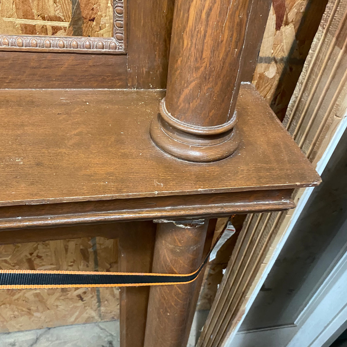 Please note, there are chip and gouges to the wood in several places, particularly to the edges of the second mantel ledge shelf at the bottom and damage to most of the ionic capitals (see photos). There are also chips and gouges to the wood towards the column's bases (see photos).