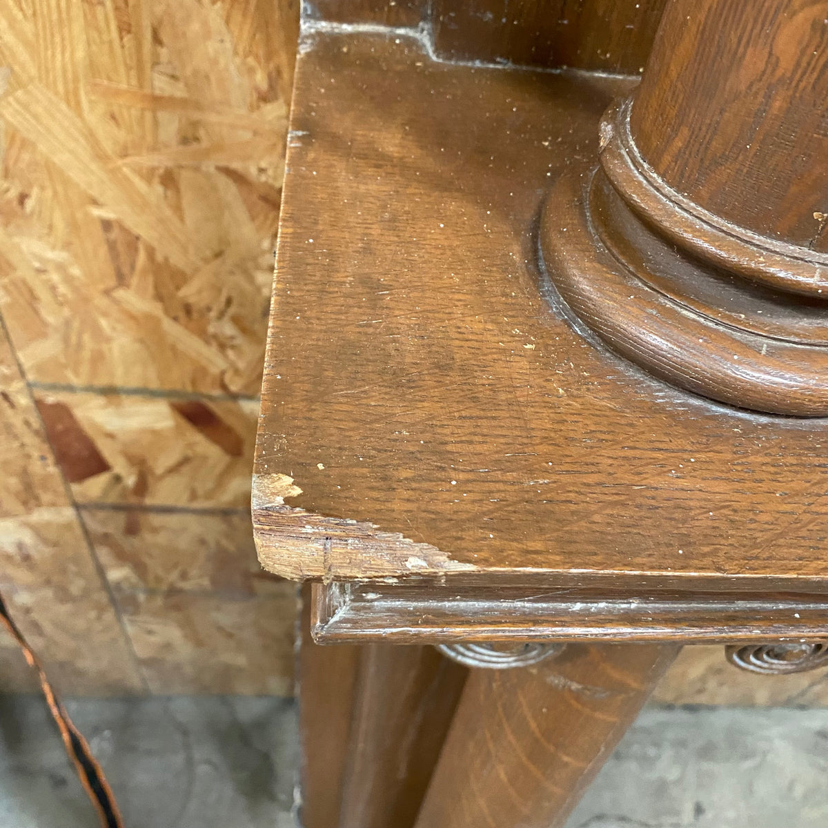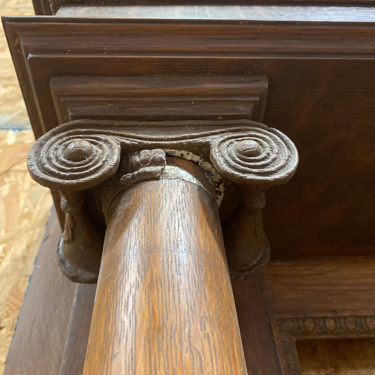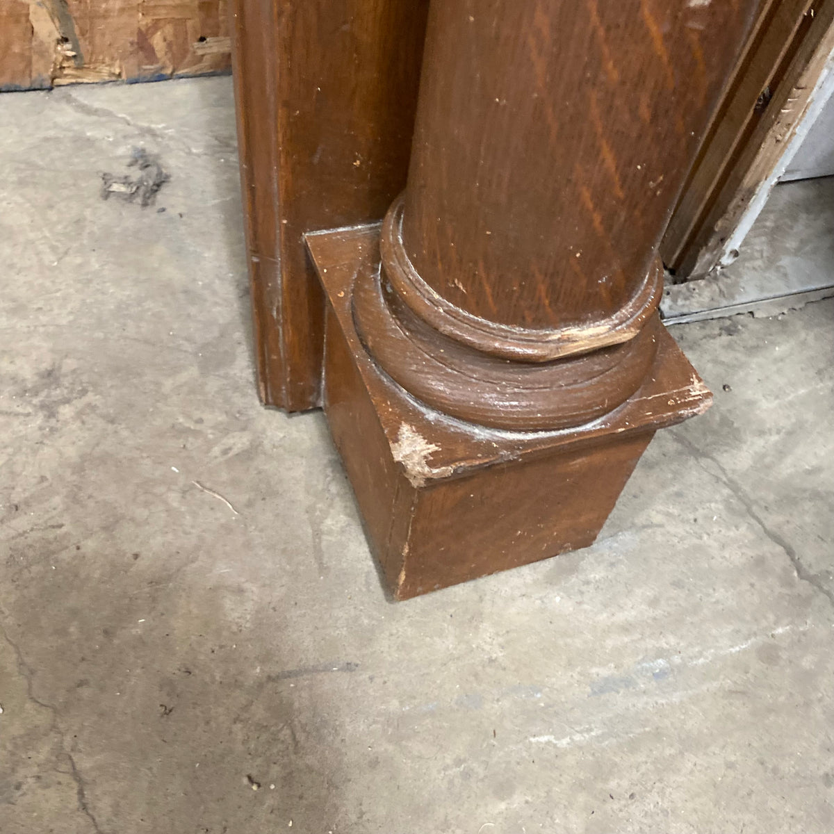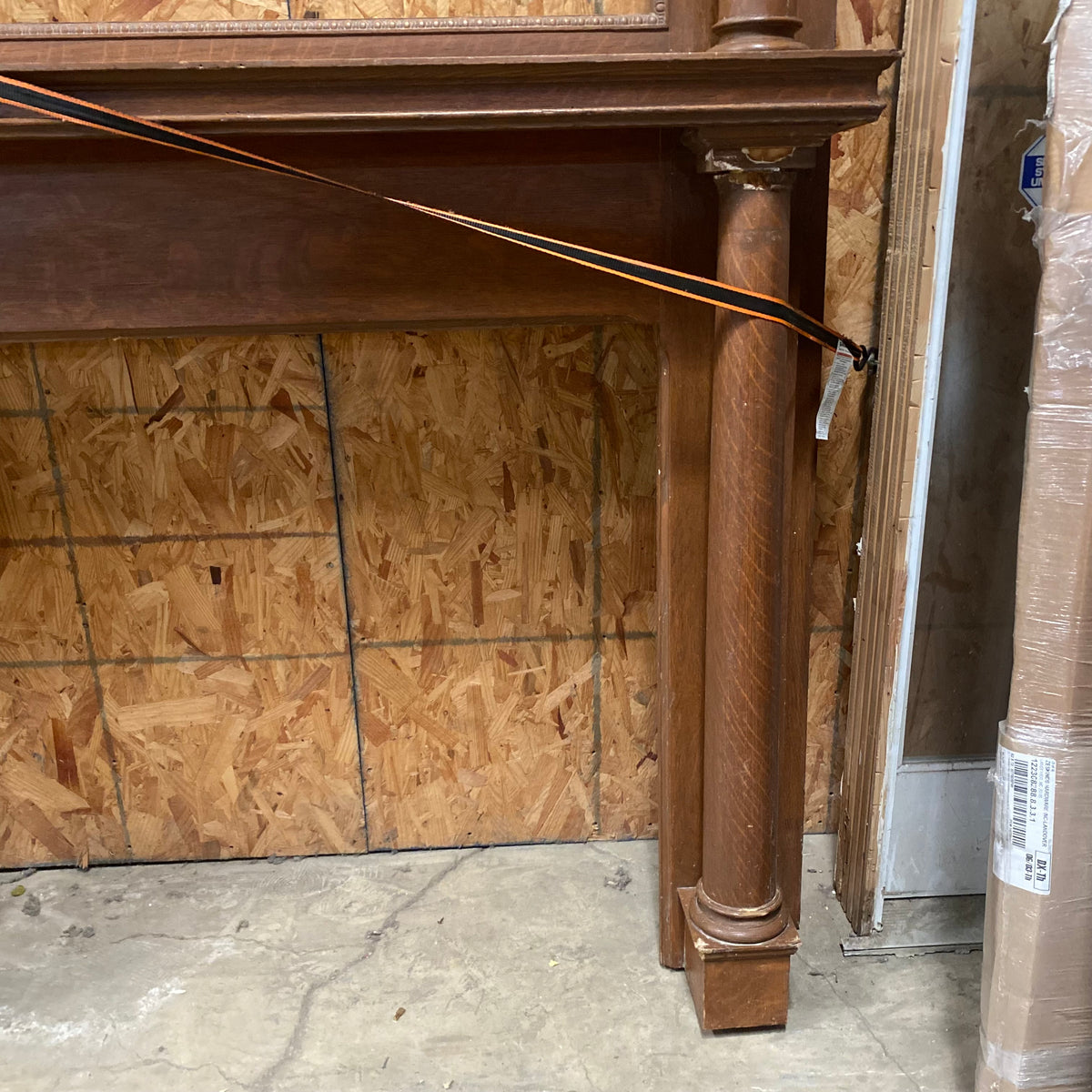 Please note, there are chip and gouges to the wood in several places, particularly to the edges of the second mantel ledge shelf at the bottom and damage to most of the ionic capitals (see photos). There are also chips and gouges to the wood towards the column's bases (see photos).