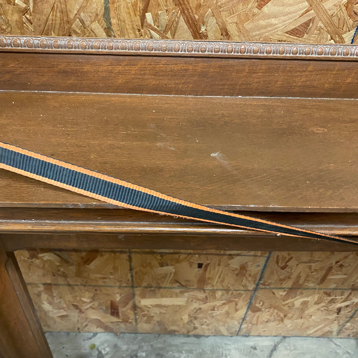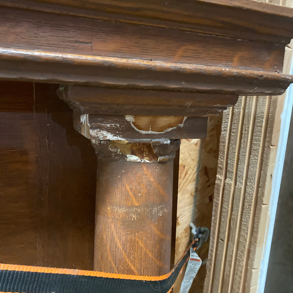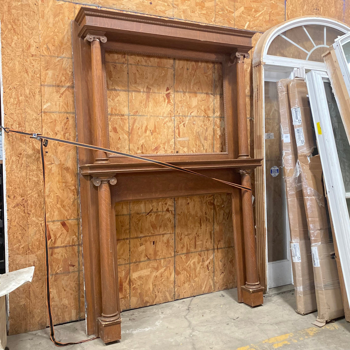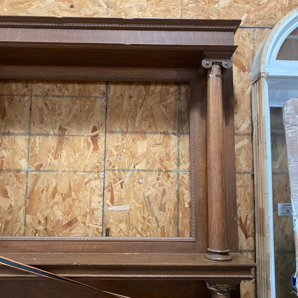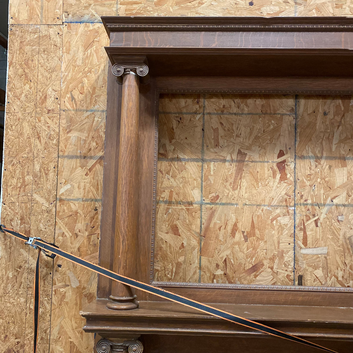 Please note, there are chip and gouges to the wood in several places, particularly to the edges of the second mantel ledge shelf at the bottom and damage to most of the ionic capitals (see photos). There are also chips and gouges to the wood towards the column's bases (see photos).