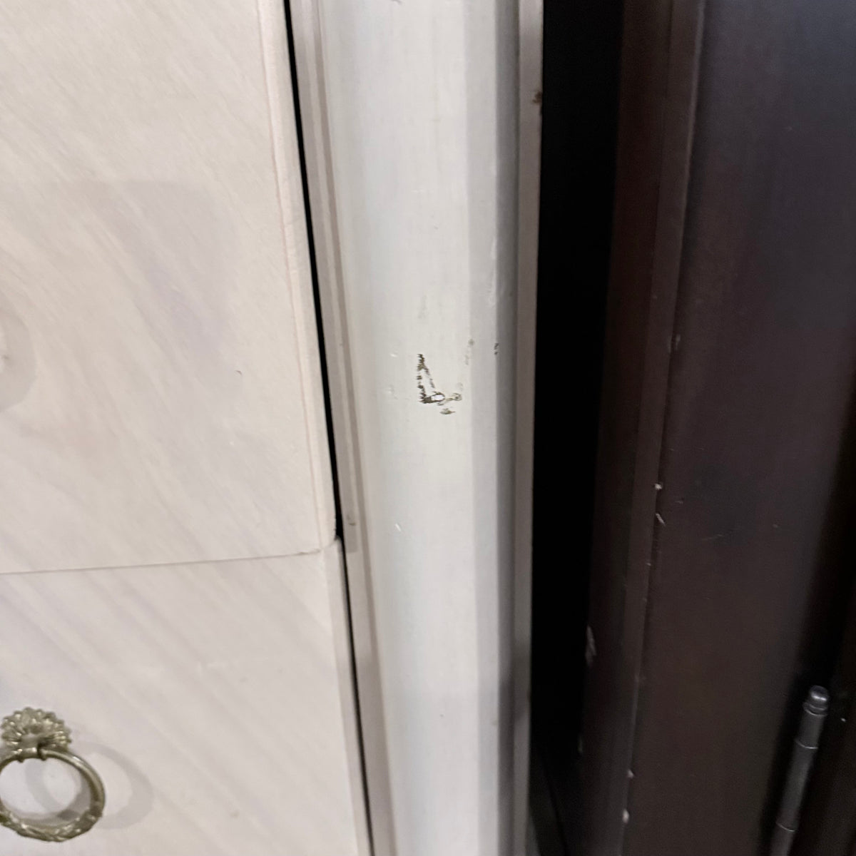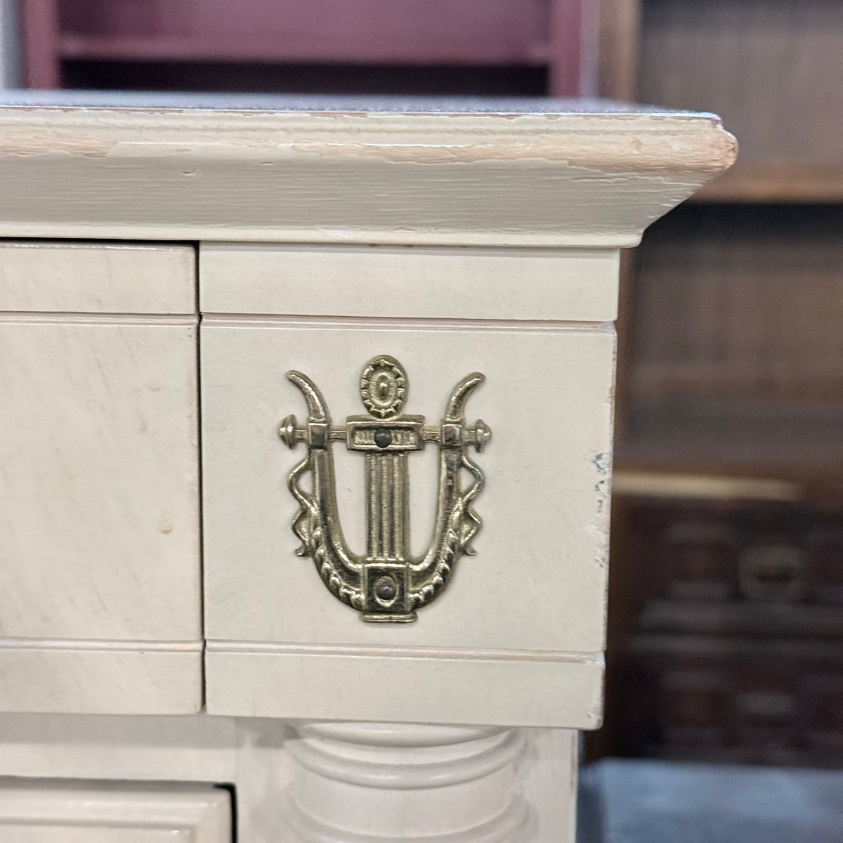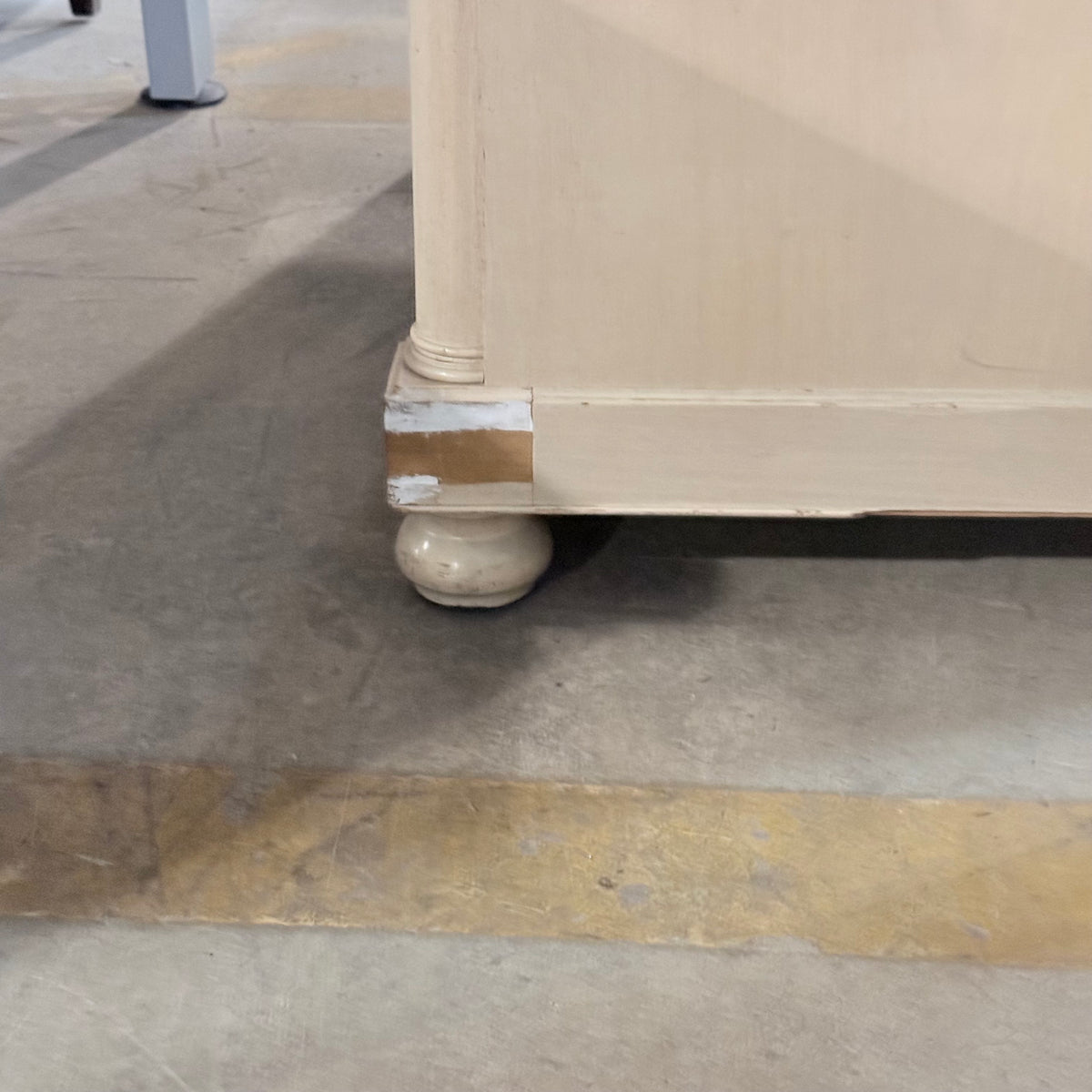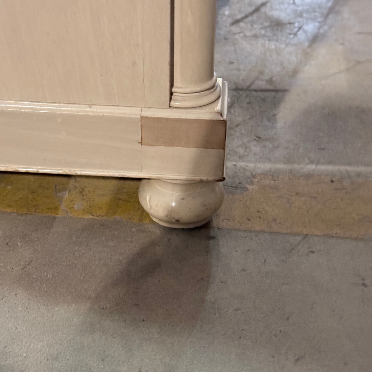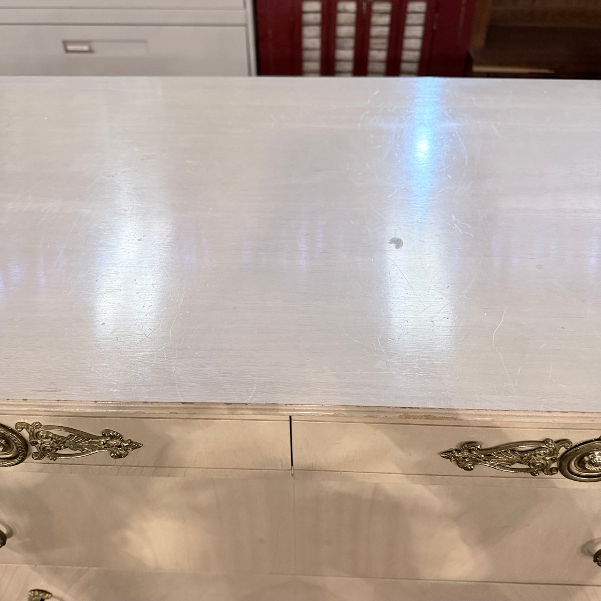 Please note, there are many scratches to the surface top of this dresser. There are also chips and small trim pieces missing towards some of the feet along the base (see photos).