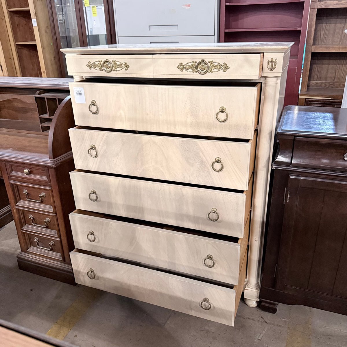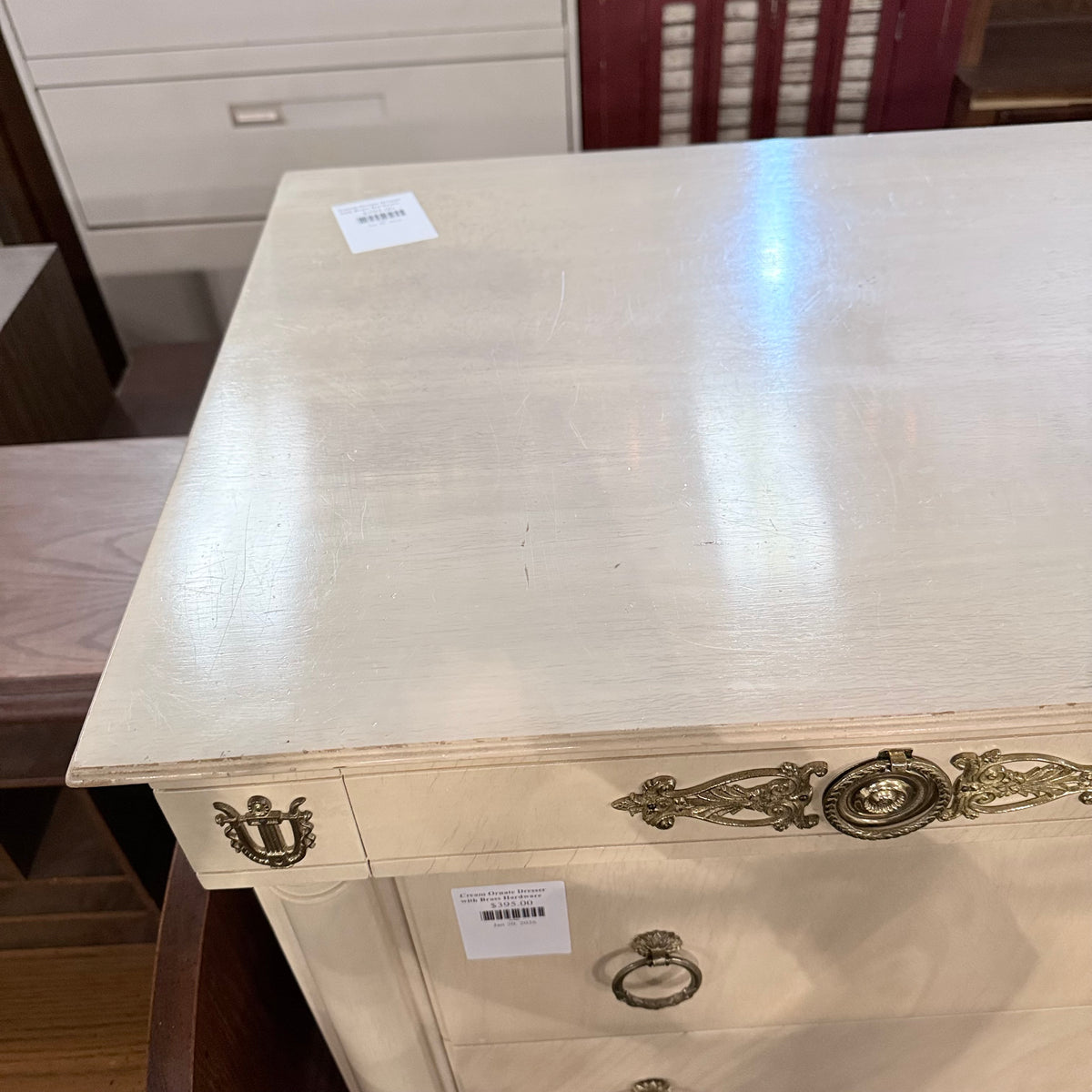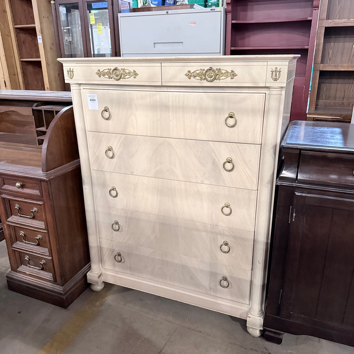 This product is a previously owned tall, ornate, cream painted dresser. It sits on bun feet and features a total of seven drawers constructed with dovetail joints and finished with brass drop ring pulls and matching hardware accents.