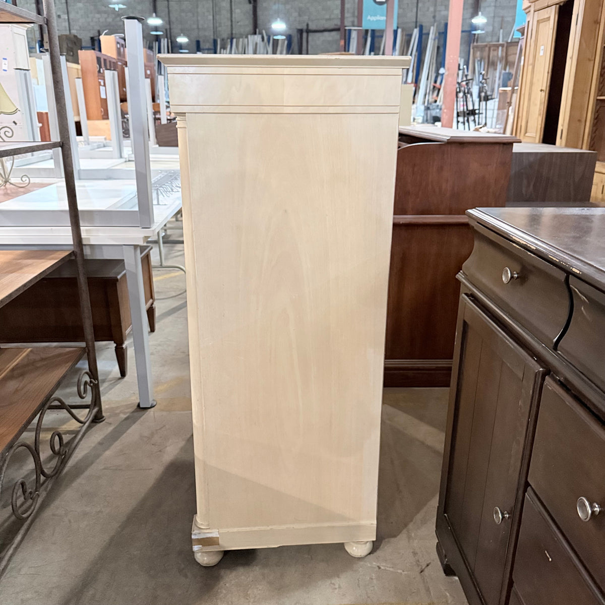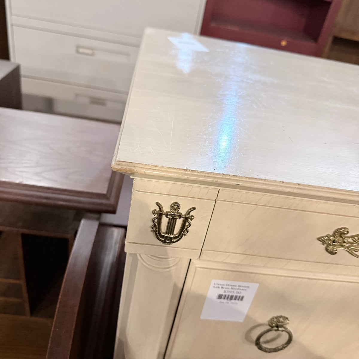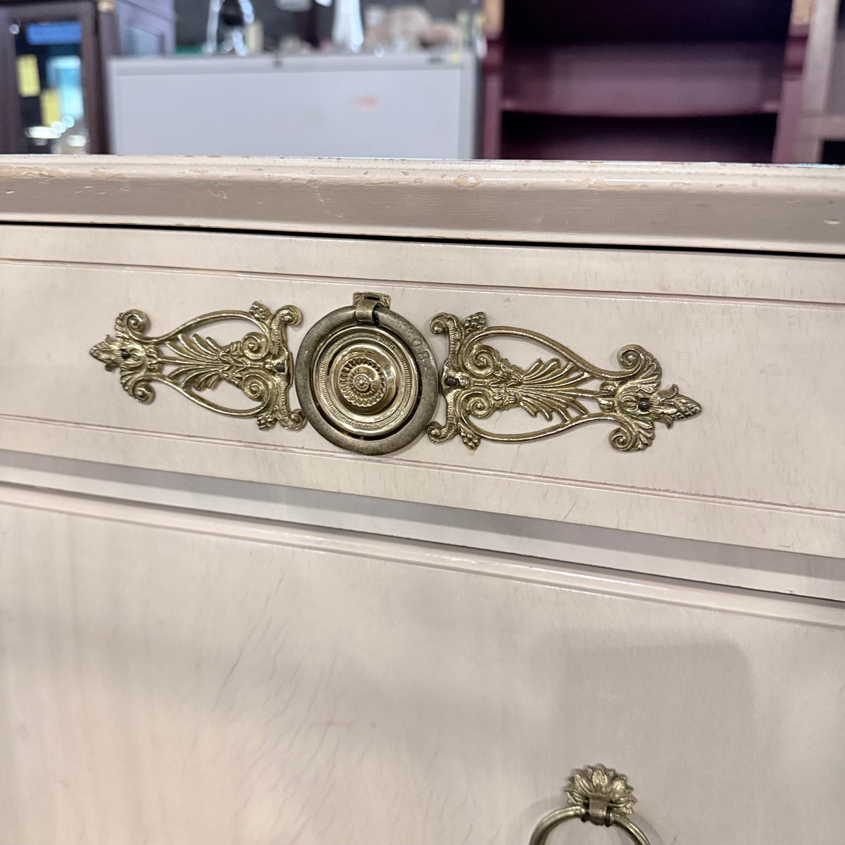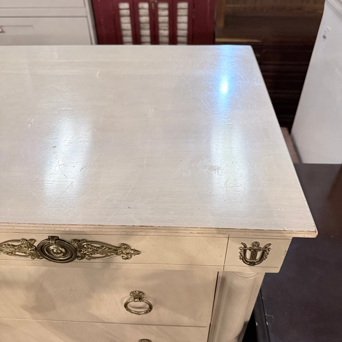 This product is a previously owned tall, ornate, cream painted dresser. It sits on bun feet and features a total of seven drawers constructed with dovetail joints and finished with brass drop ring pulls and matching hardware accents.