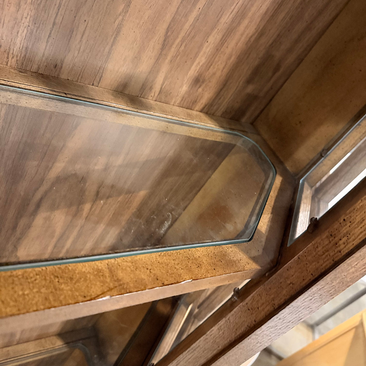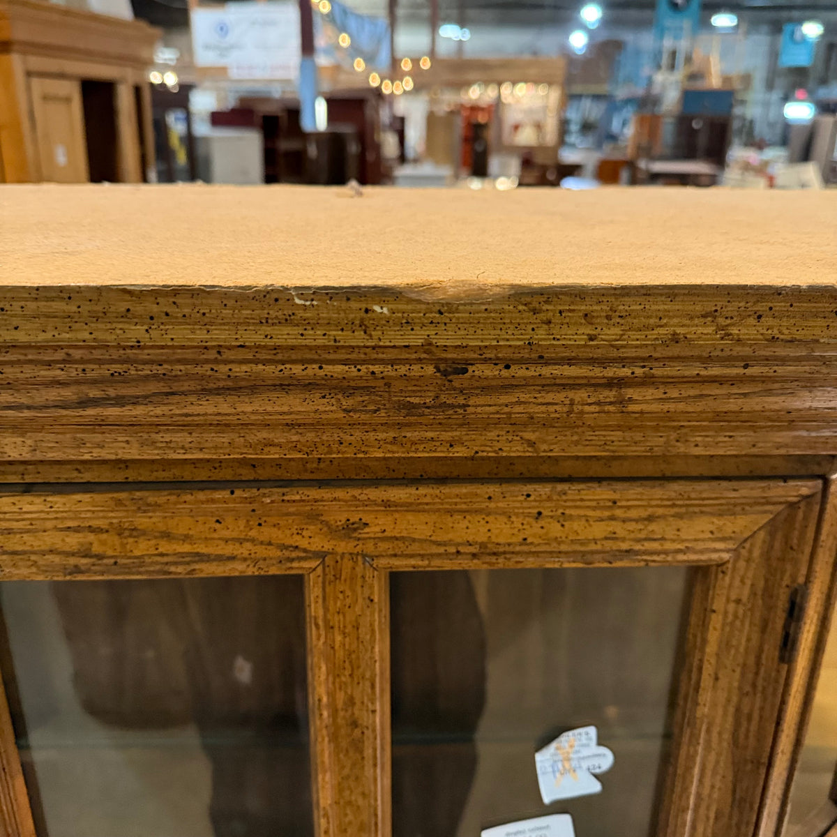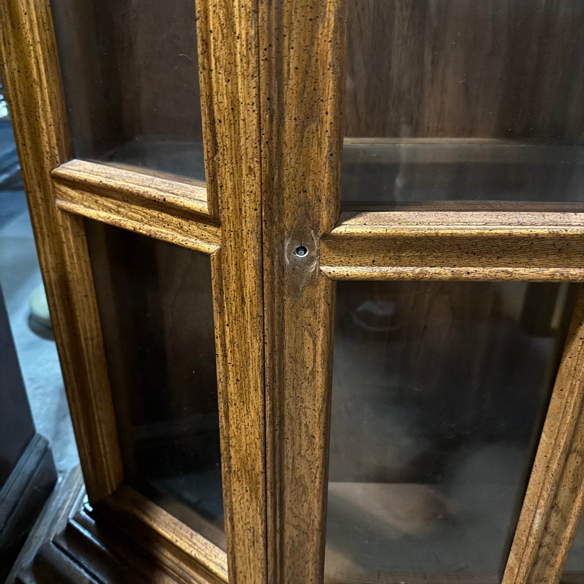 Please note, the knob pull to the bottom door is missing. There is a chip towards the top front portion of the display cabinet and there are also a few smaller chips towards the top along the crown moulding and near the display cabinet's base (see photos).