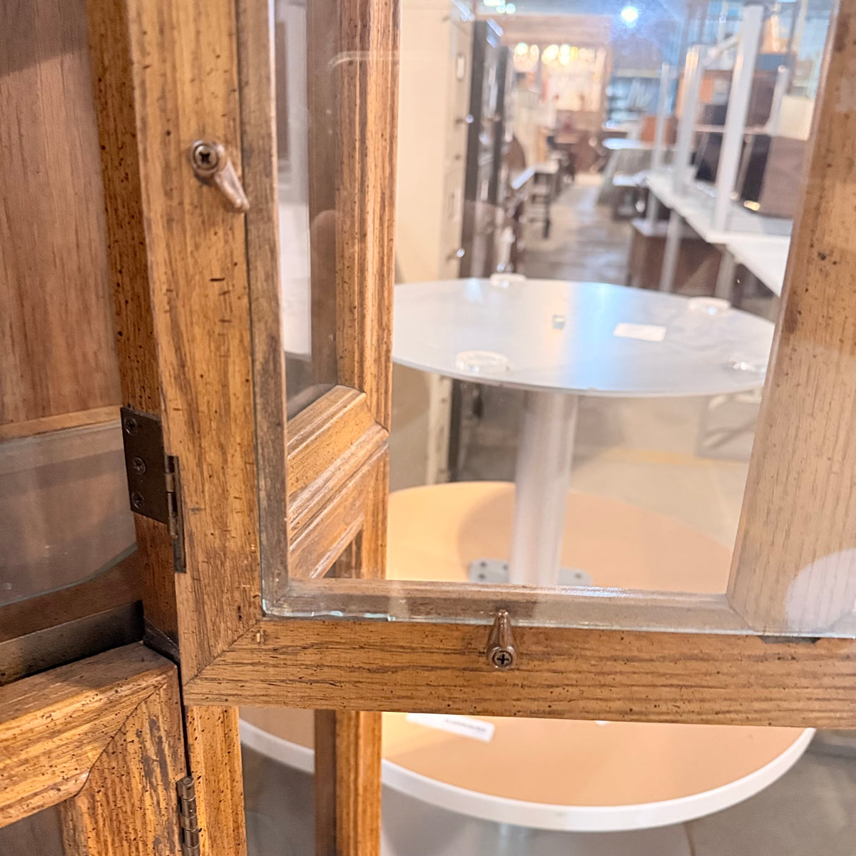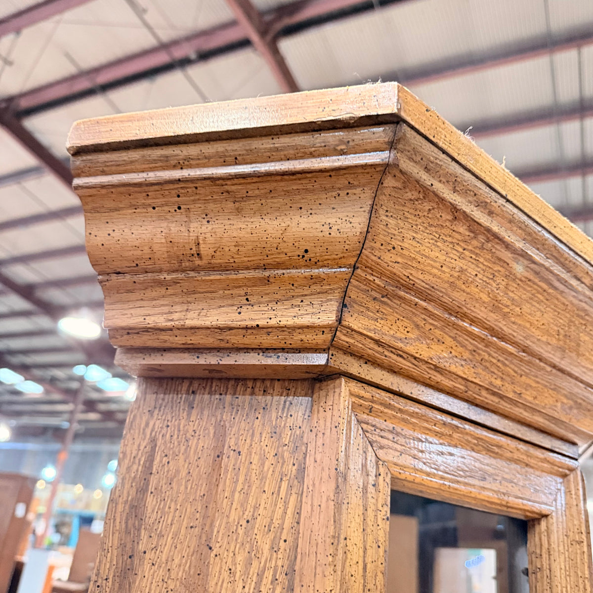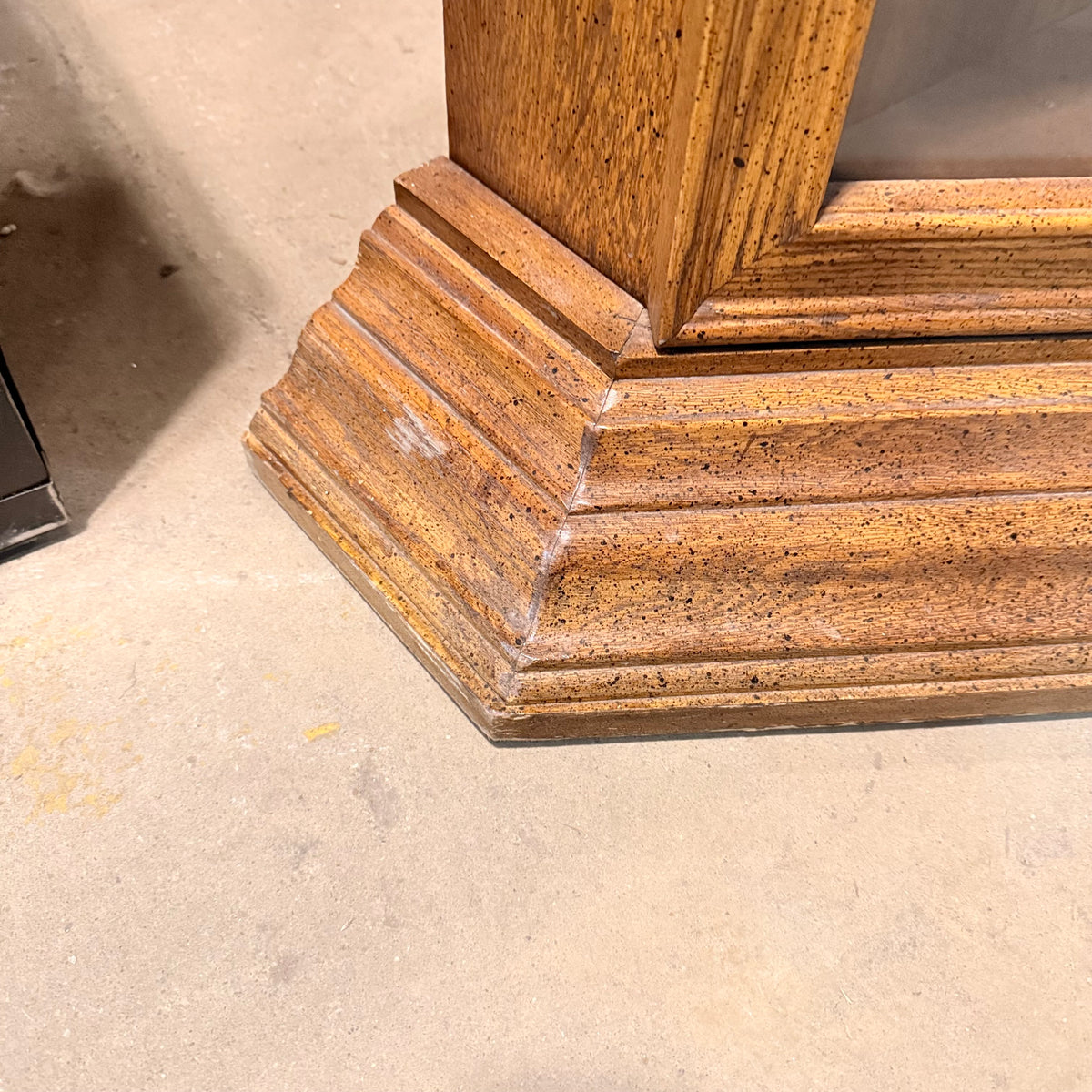 Please note, the knob pull to the bottom door is missing. There is a chip towards the top front portion of the display cabinet and there are also a few smaller chips towards the top along the crown moulding and near the display cabinet's base (see photos).
