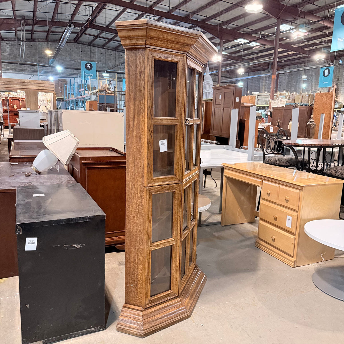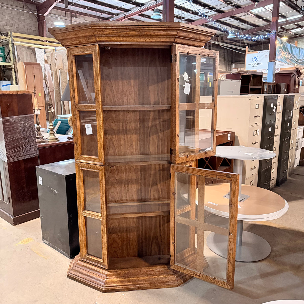 This product is a previously owned tall solid wood lighted curio cabinet, It features three affixed wooden and glass insert shelves behind glass panel doors and has a light up top to light the interior display area.