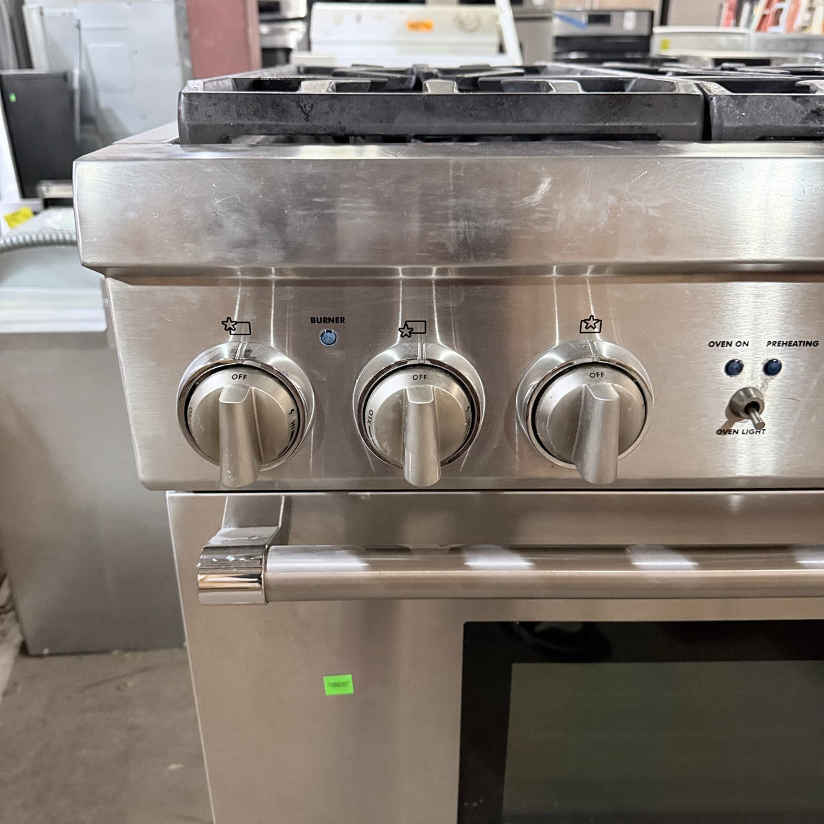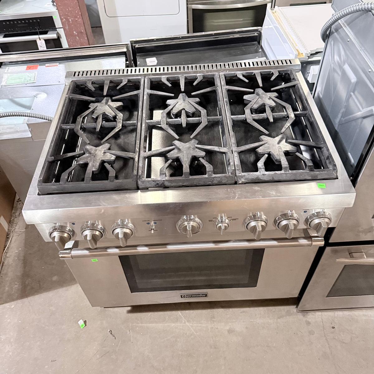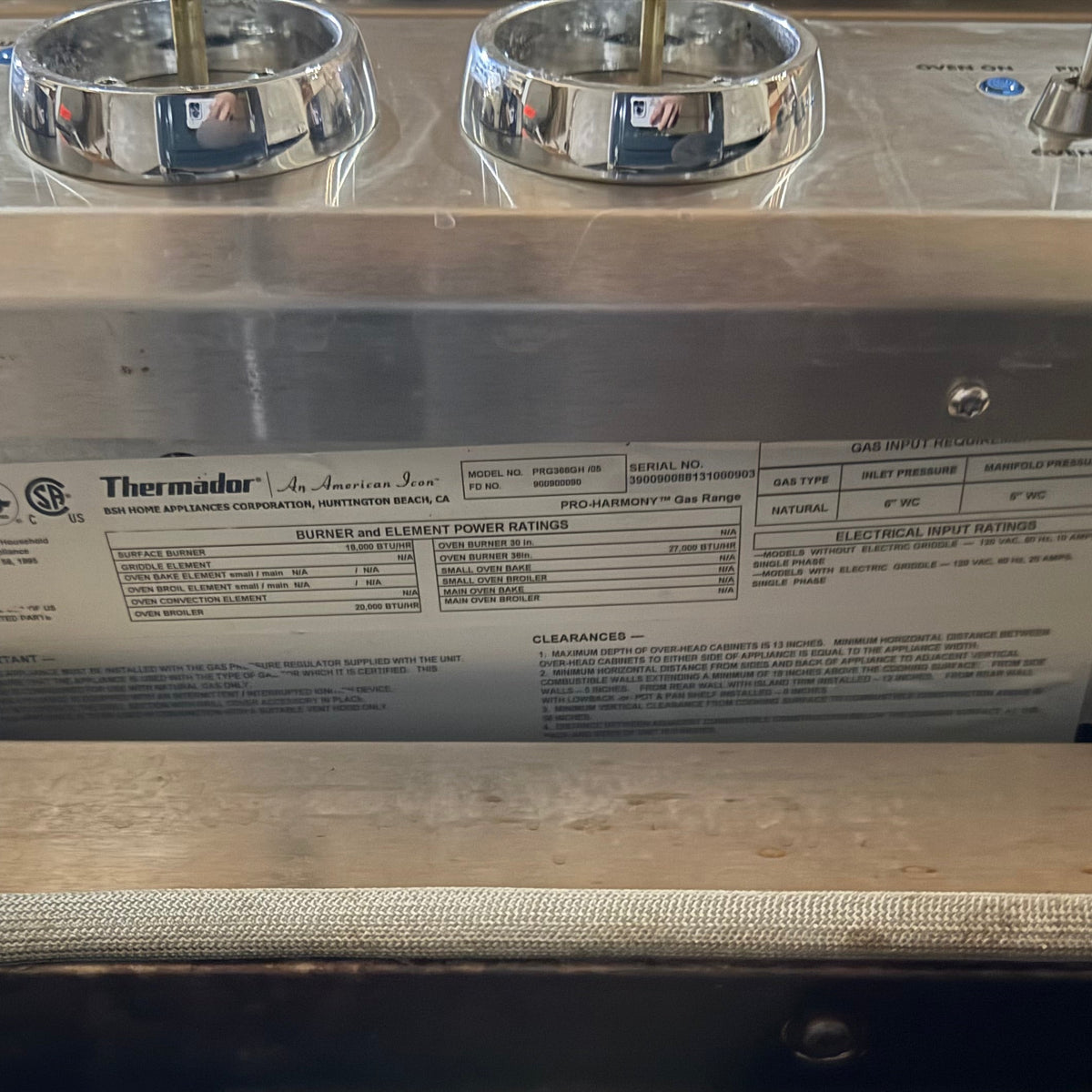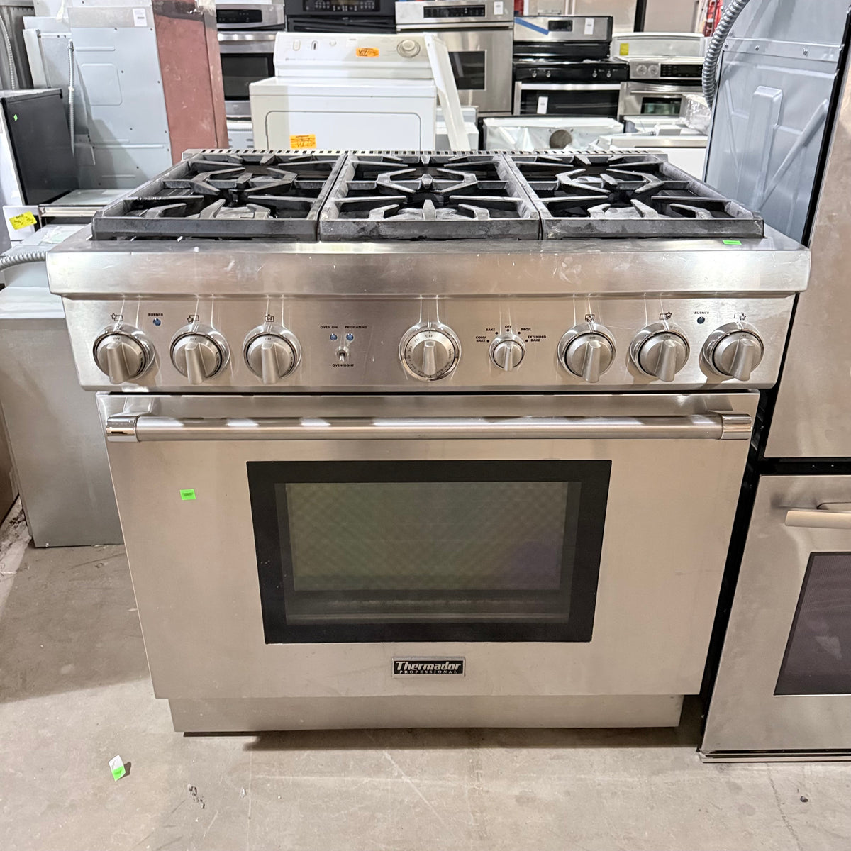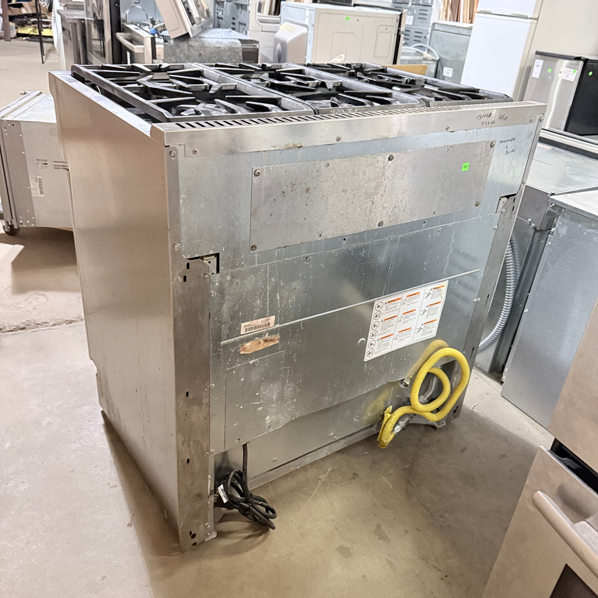This product is a previously owned Thermador Professional Series 36-inch sealed burner gas range. Features: