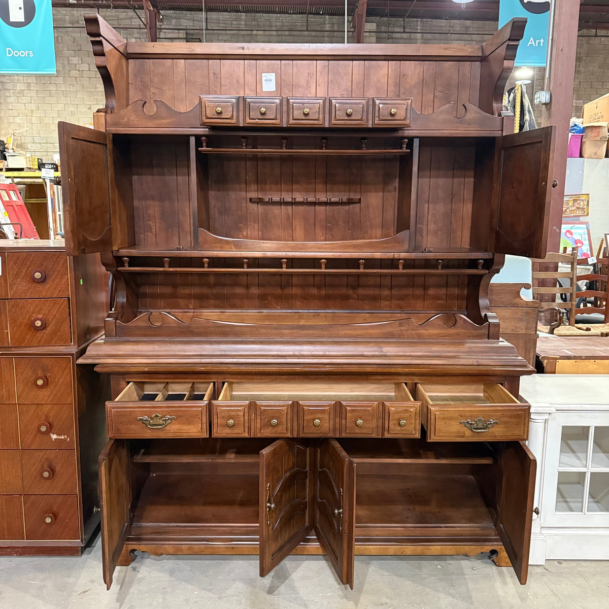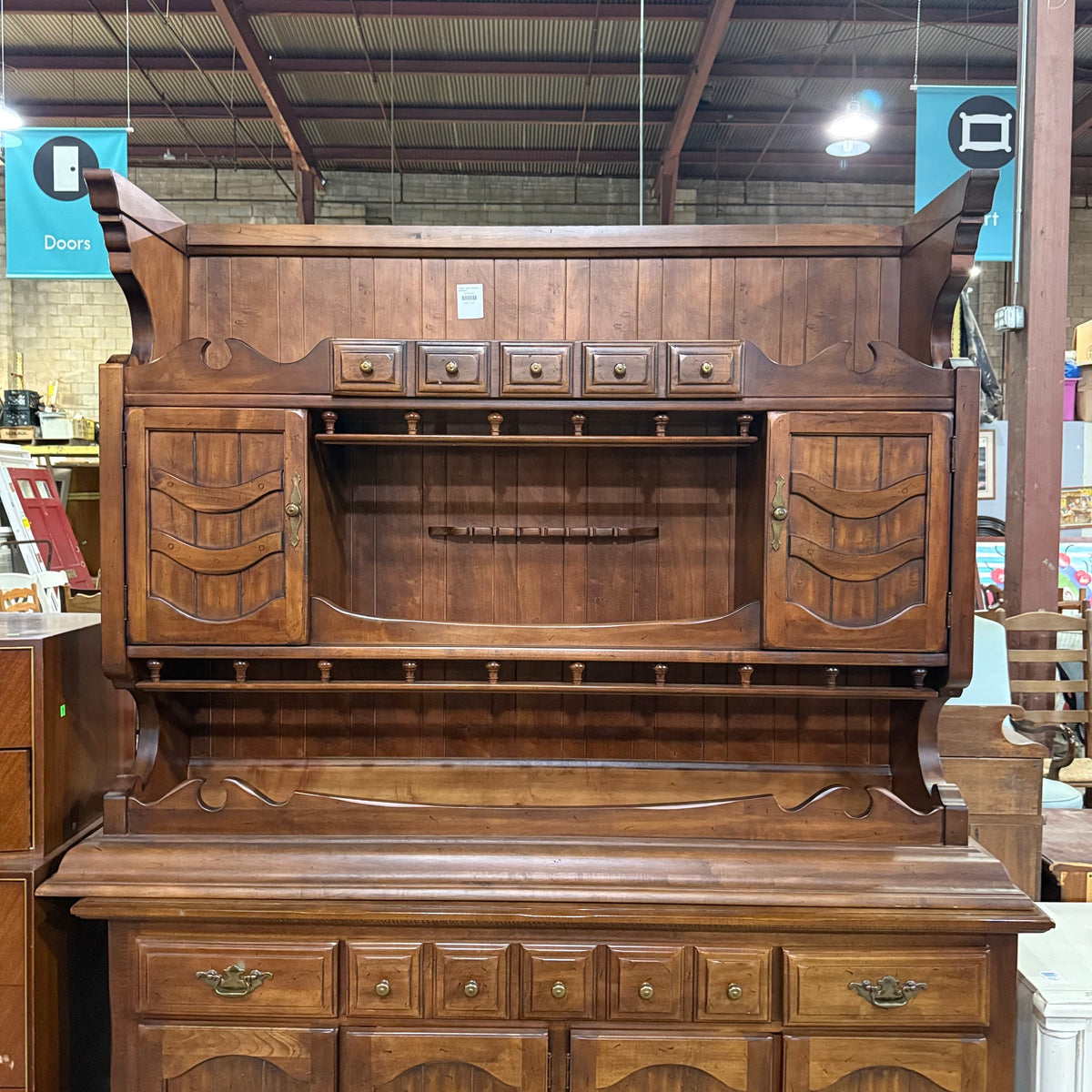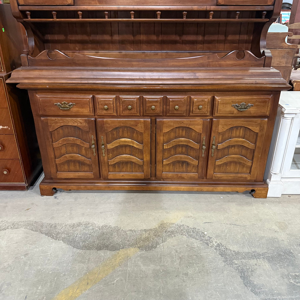 This previously owned cherry stained early American style 2-piece hutch and sideboard cabinet by Thomasville Furniture Industries offers plenty of storage. The top compartment is photographed and stored upside down in this listing for safety purposes. The top compartment consists of an upper cupboard section with bead board backing, an open overhead space with an enclosed gallery, and in the lower section a separate open space in the center with a large single drawer below and a storage cabinet at either side. The bottom compartment features a total of three spacious drawers and ample storage space below two sets of ornately decorated double doors. The drawers are finished with ornate brass knobs and matching brass batwing pulls.
