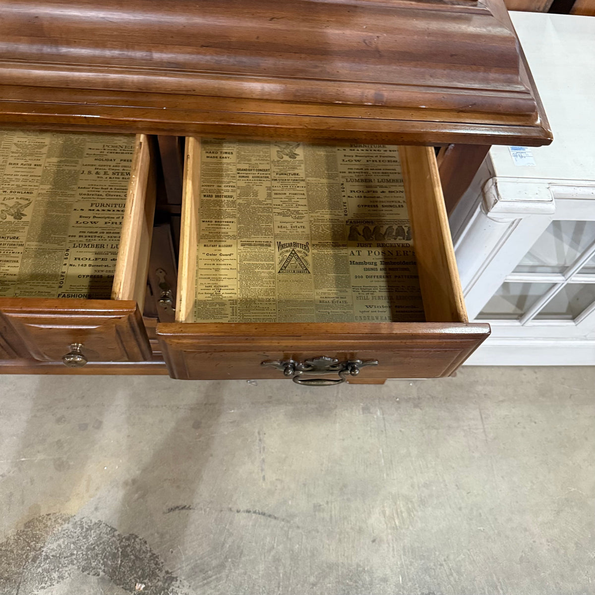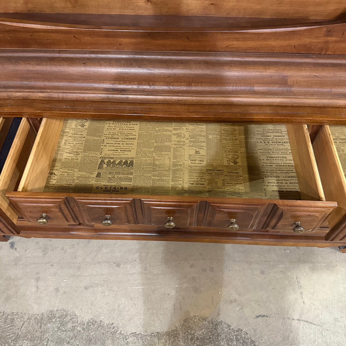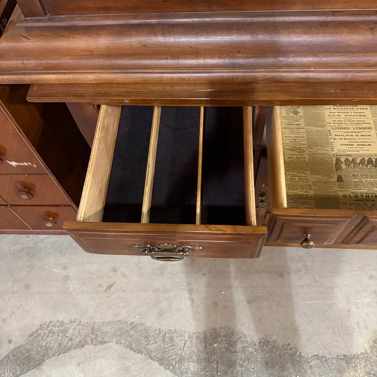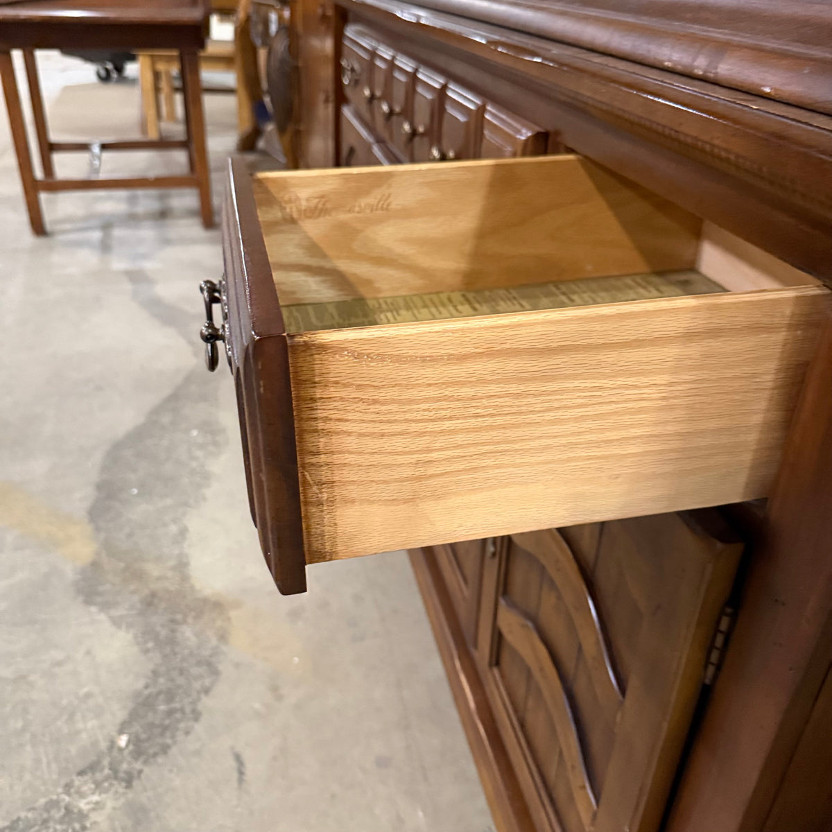 This previously owned cherry stained early American style 2-piece hutch and sideboard cabinet by Thomasville Furniture Industries offers plenty of storage. The top compartment is photographed and stored upside down in this listing for safety purposes. The top compartment consists of an upper cupboard section with bead board backing, an open overhead space with an enclosed gallery, and in the lower section a separate open space in the center with a large single drawer below and a storage cabinet at either side. The bottom compartment features a total of three spacious drawers and ample storage space below two sets of ornately decorated double doors. The drawers are finished with ornate brass knobs and matching brass batwing pulls.
