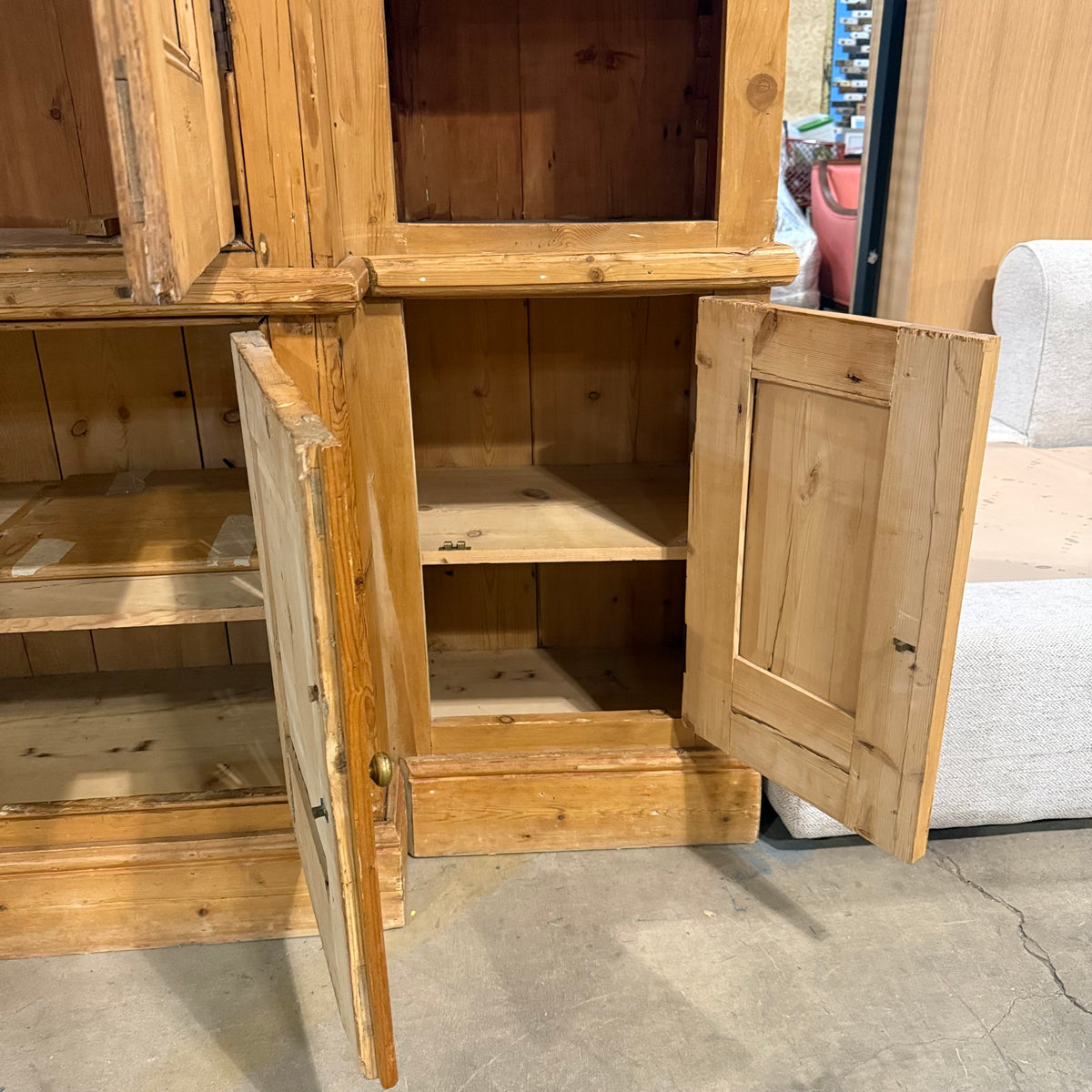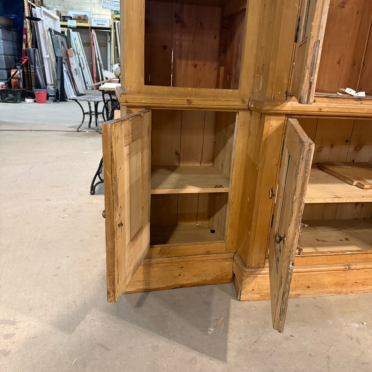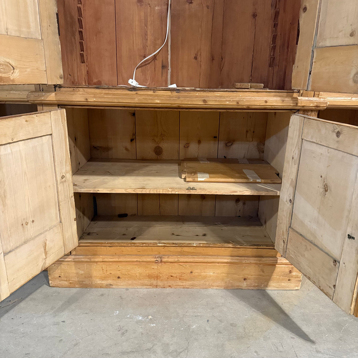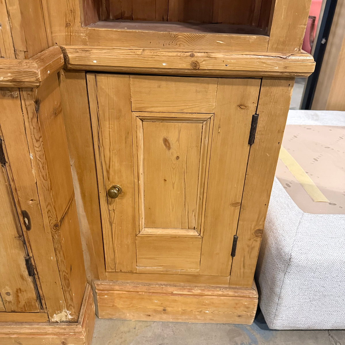This product is a previously owned very large, vintage display cabinet constructed from solid pine wood. It is made up of six individual pieces, two open display shelf top compartments, a middle storage cabinet behind double doors, two base storage cabinet pieces and a base middle storage cabinet behind the double doors. The middle top compartment is also equipped with an interior light. The shelves are adjustable and slot in between custom-made wooden notches. There are no shelves included for the middle cabinet compartment only for the two display open shelves at either side.