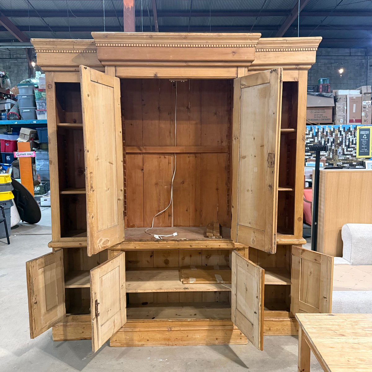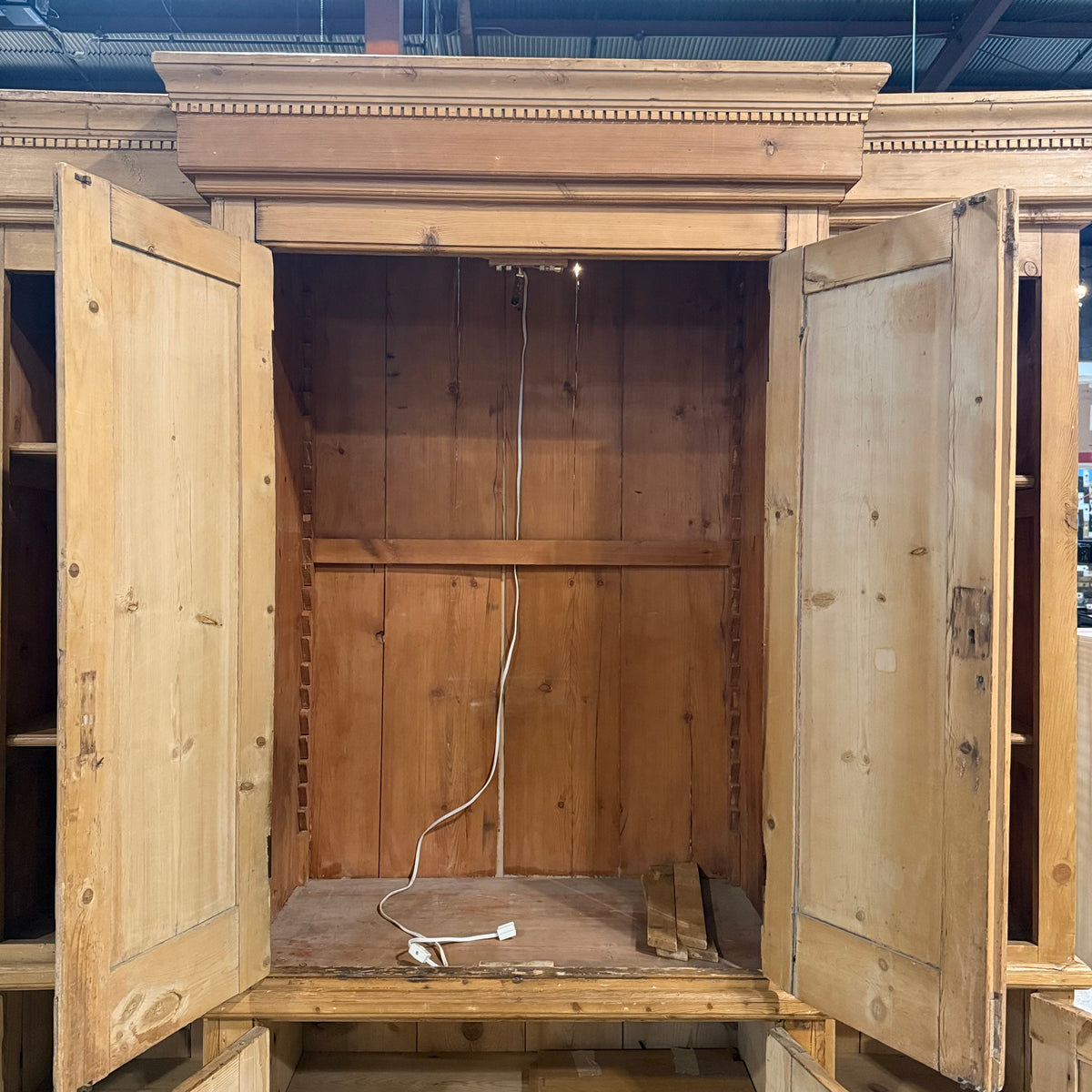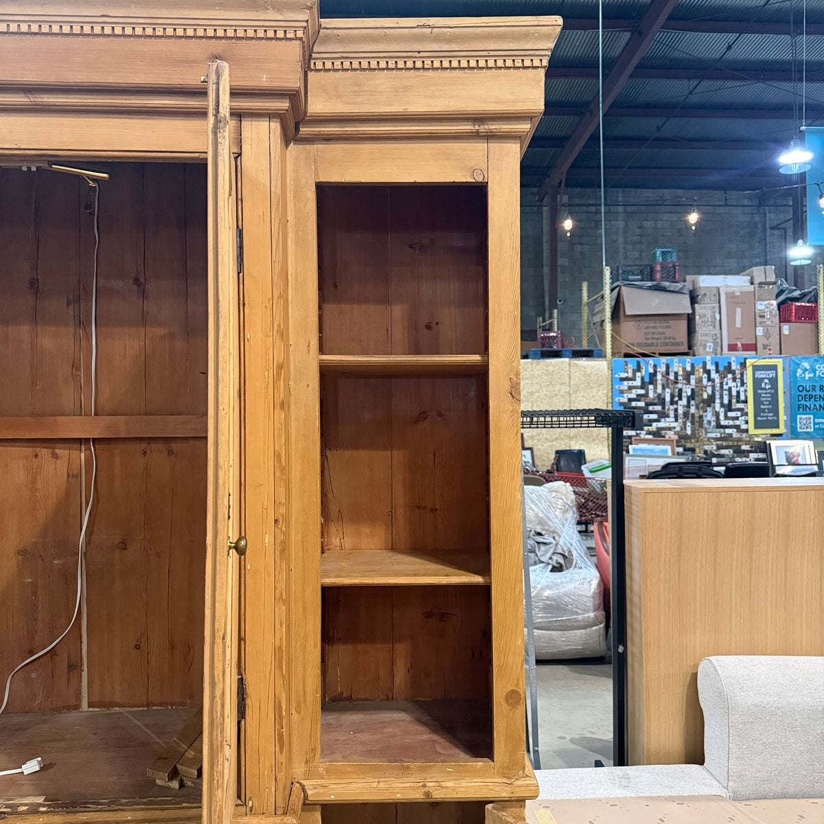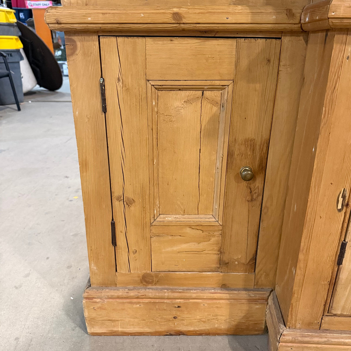 This product is a previously owned very large, vintage display cabinet constructed from solid pine wood. It is made up of six individual pieces, two open display shelf top compartments, a middle storage cabinet behind double doors, two base storage cabinet pieces and a base middle storage cabinet behind the double doors. The middle top compartment is also equipped with an interior light. The shelves are adjustable and slot in between custom-made wooden notches. There are no shelves included for the middle cabinet compartment only for the two display open shelves at either side.