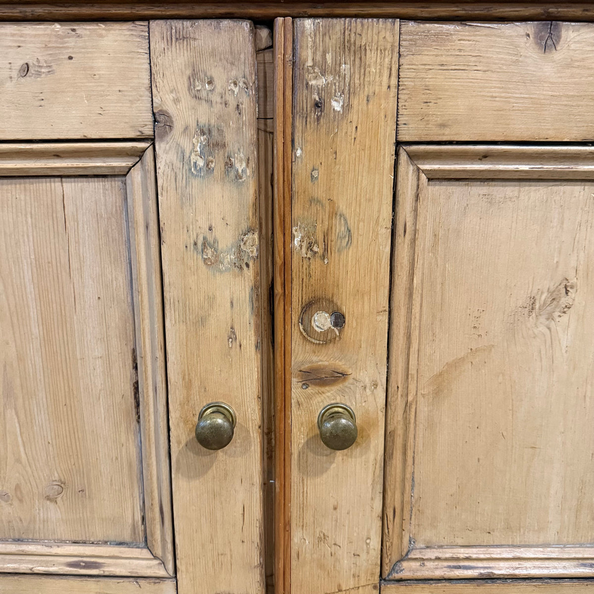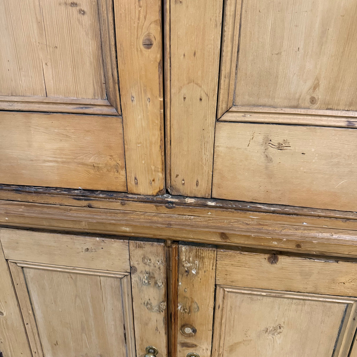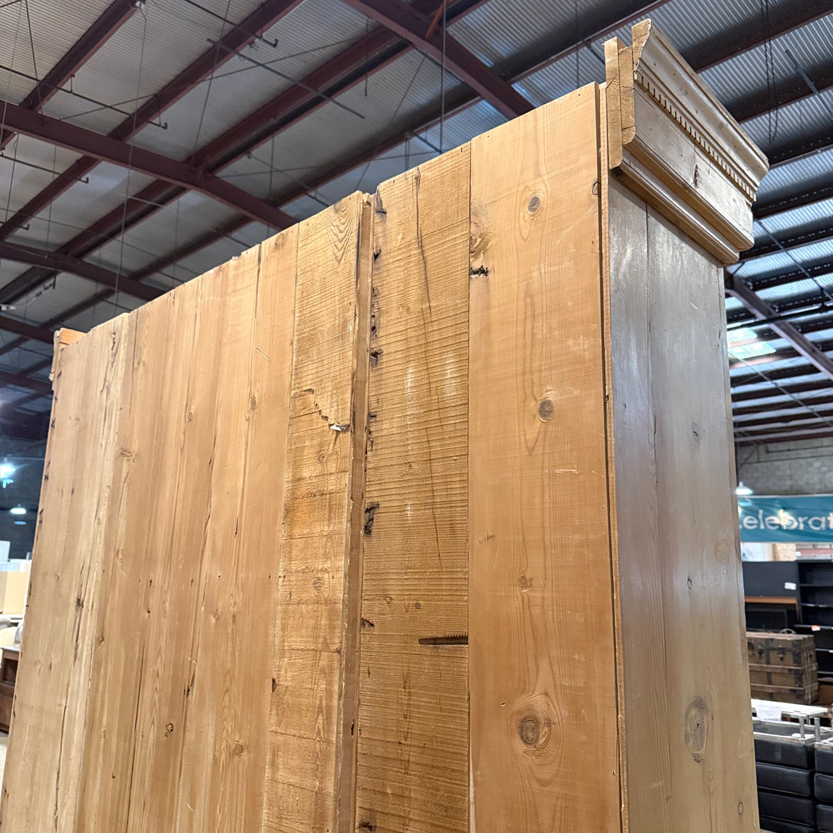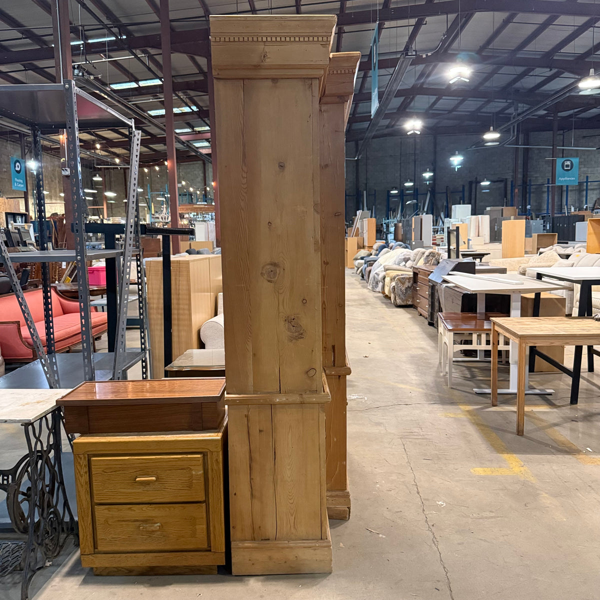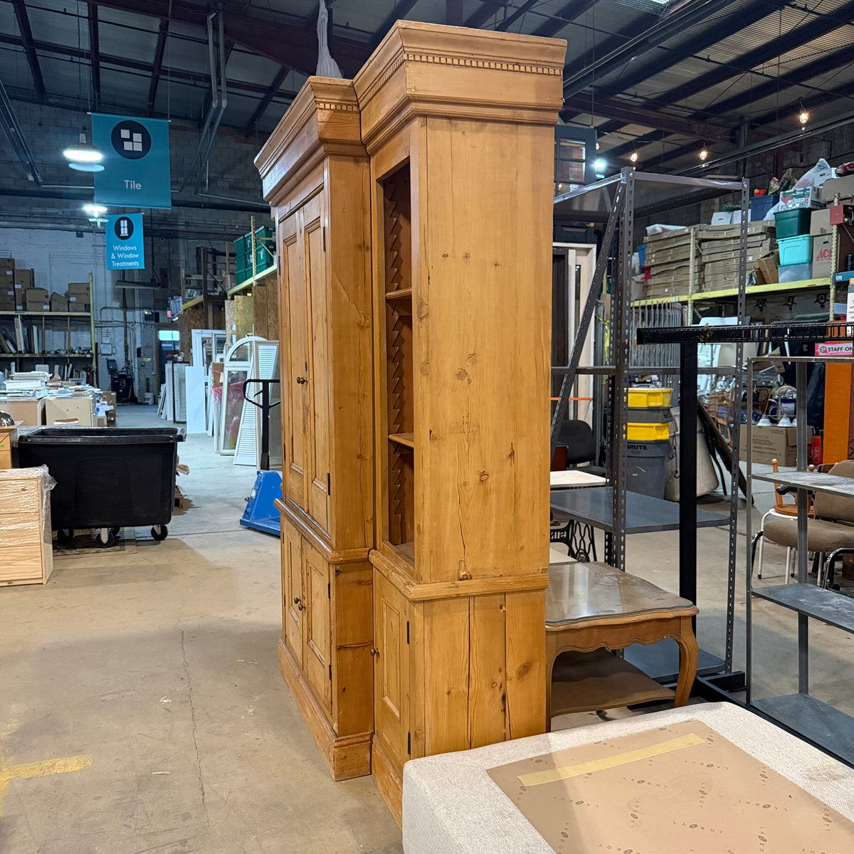 This product is a previously owned very large, vintage display cabinet constructed from solid pine wood. It is made up of six individual pieces, two open display shelf top compartments, a middle storage cabinet behind double doors, two base storage cabinet pieces and a base middle storage cabinet behind the double doors. The middle top compartment is also equipped with an interior light. The shelves are adjustable and slot in between custom-made wooden notches. There are no shelves included for the middle cabinet compartment only for the two display open shelves at either side.