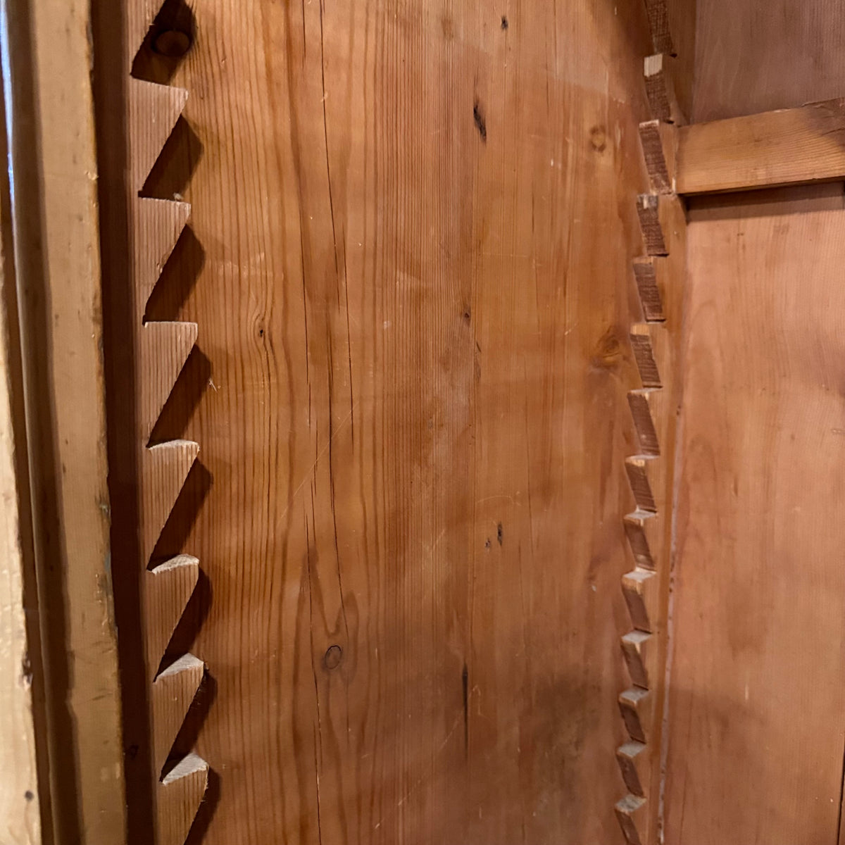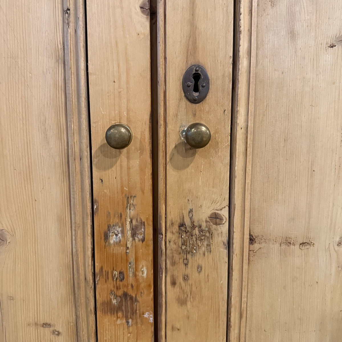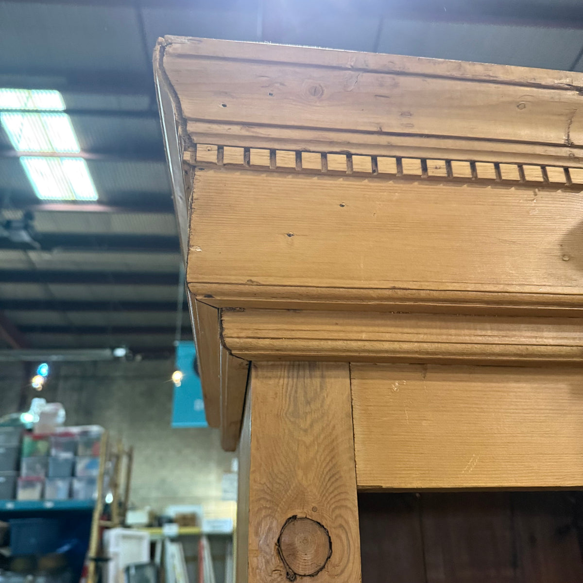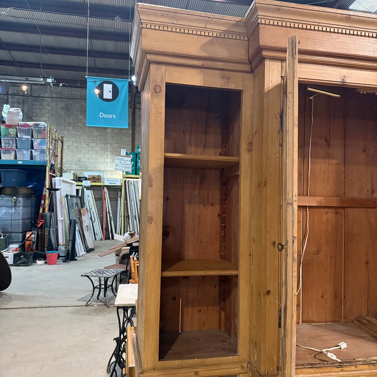 This product is a previously owned very large, vintage display cabinet constructed from solid pine wood. It is made up of six individual pieces, two open display shelf top compartments, a middle storage cabinet behind double doors, two base storage cabinet pieces and a base middle storage cabinet behind the double doors. The middle top compartment is also equipped with an interior light. The shelves are adjustable and slot in between custom-made wooden notches. There are no shelves included for the middle cabinet compartment only for the two display open shelves at either side.