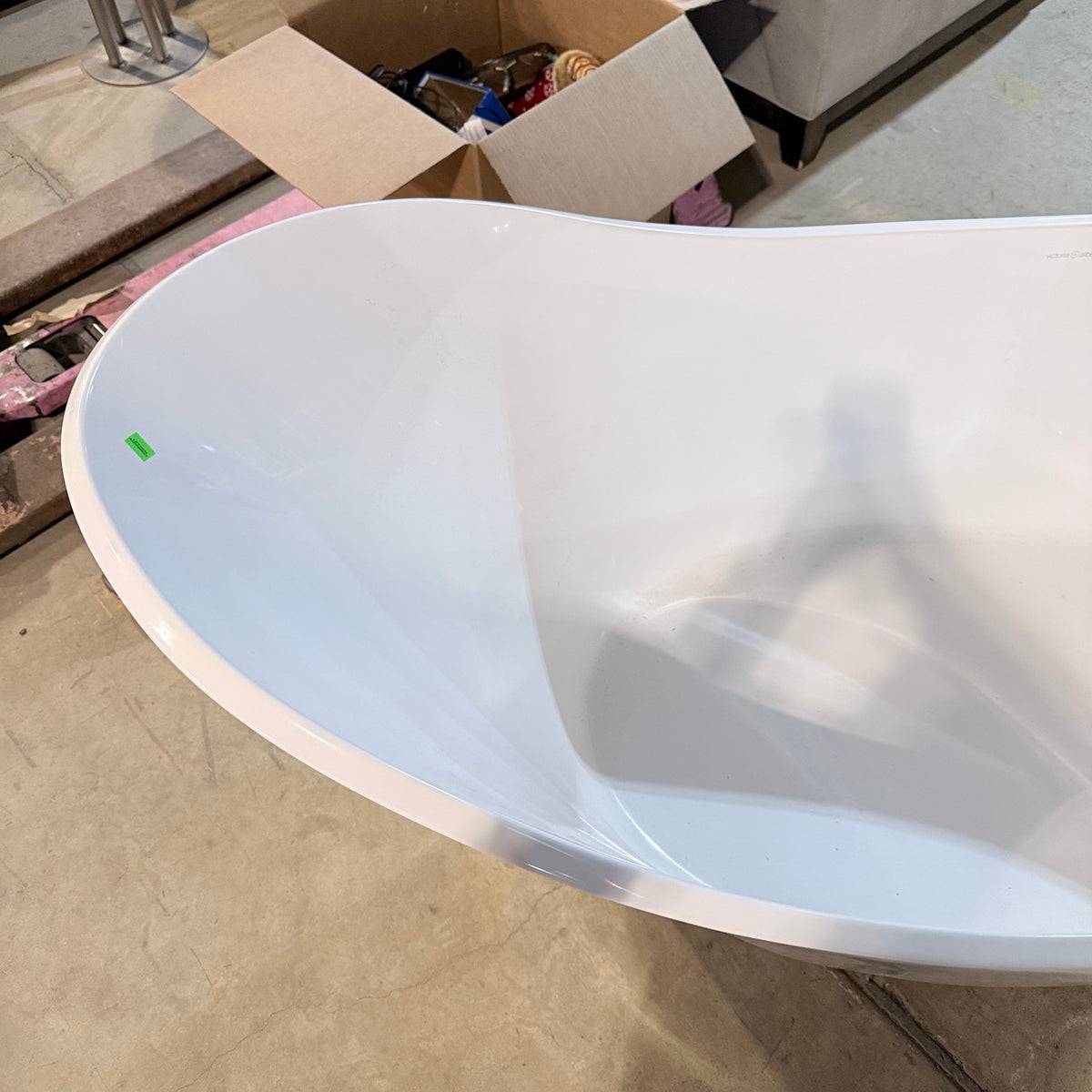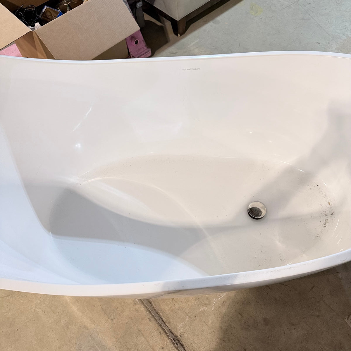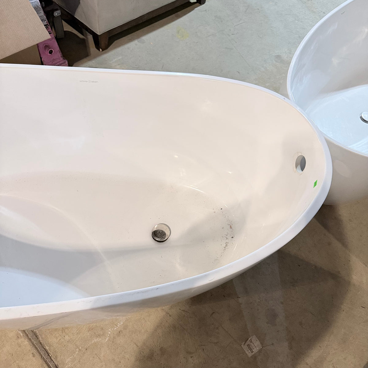 This is a previously owned Victoria + Albert 'Amalfi' collection contemporary slipper bath tub. It is made from ENGLISHCAST® which consists of naturally bright white Volcanic Limestone™ mixed with resin. It is finished in a glossy white and has softly contoured sides and a high back on one side for taking a luxurious soak. It has an overflow hole and a push-button drain stopper installed, both located at one end. This style of tub is designed for use with a wall-mounted or floor-mounted tub filler faucet. Faucet and additional drain hardware are not included.