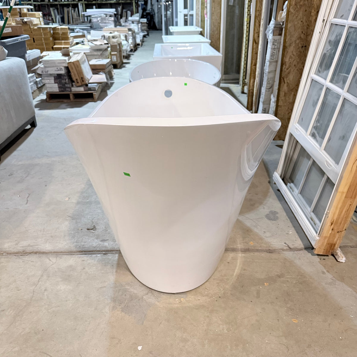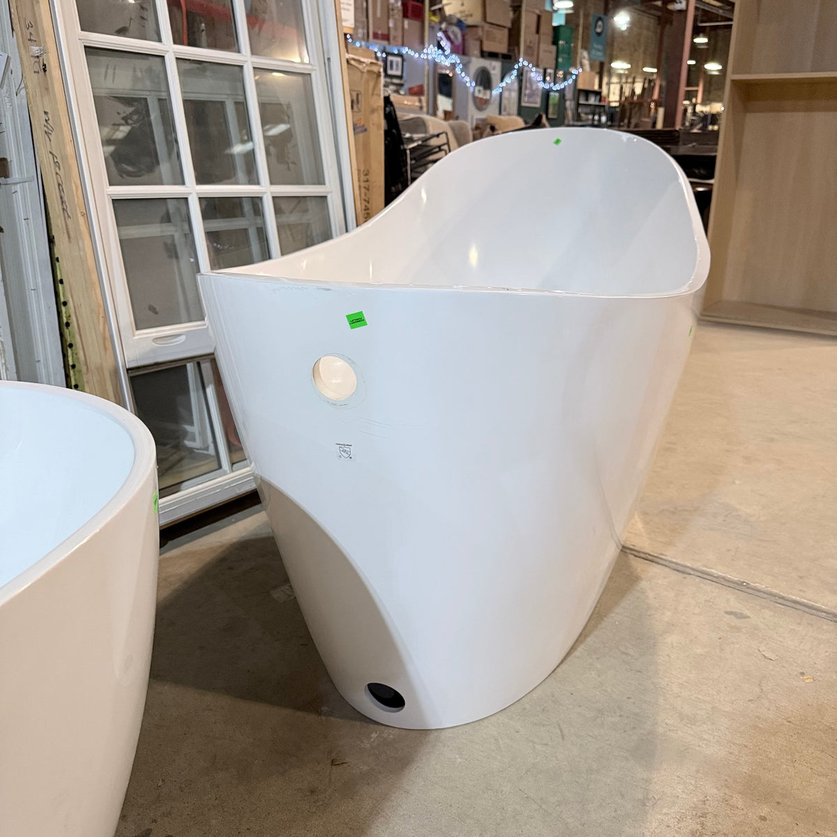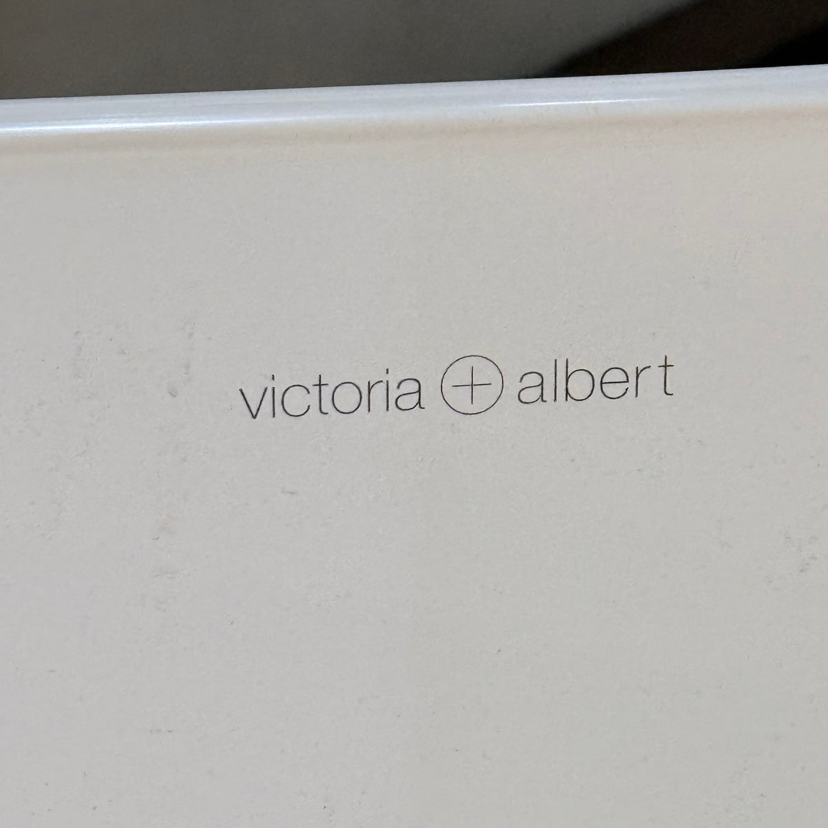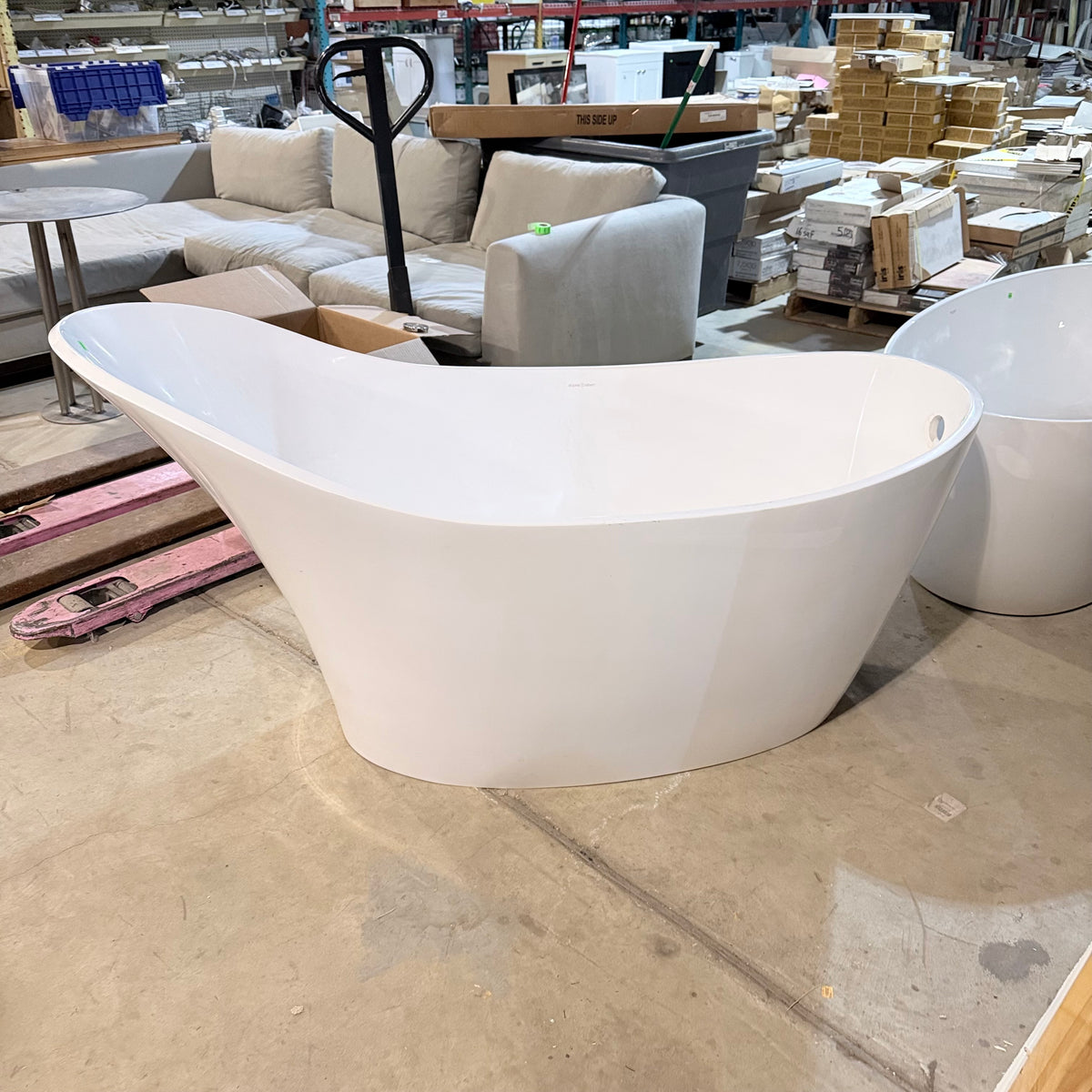 This is a previously owned Victoria + Albert 'Amalfi' collection contemporary slipper bath tub. It is made from ENGLISHCAST® which consists of naturally bright white Volcanic Limestone™ mixed with resin. It is finished in a glossy white and has softly contoured sides and a high back on one side for taking a luxurious soak. It has an overflow hole and a push-button drain stopper installed, both located at one end. This style of tub is designed for use with a wall-mounted or floor-mounted tub filler faucet. Faucet and additional drain hardware are not included.