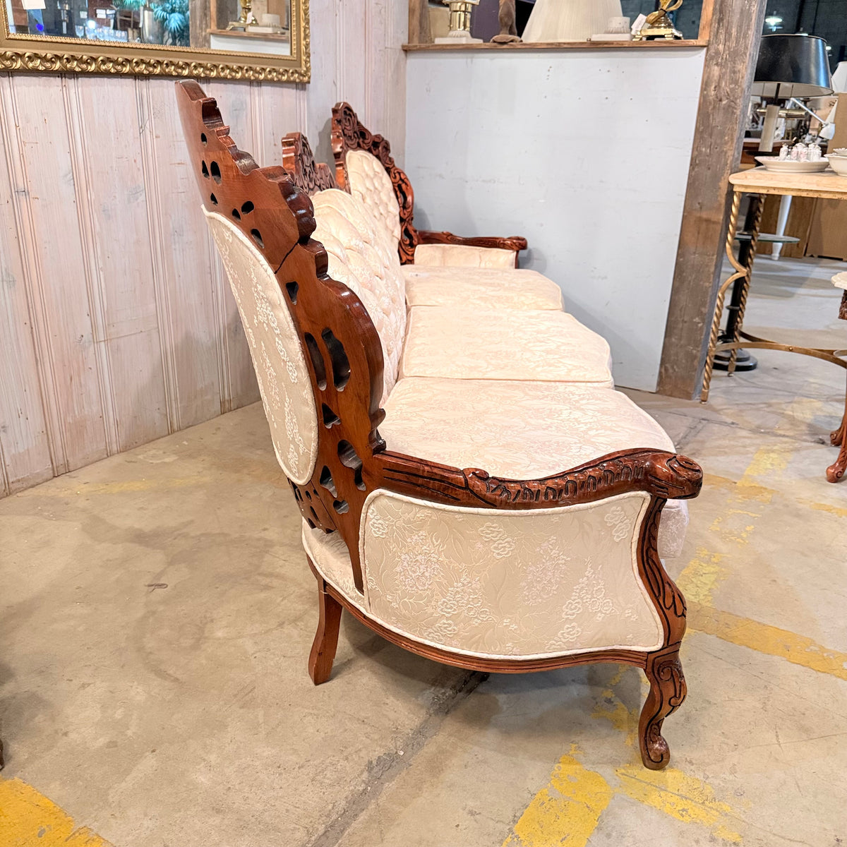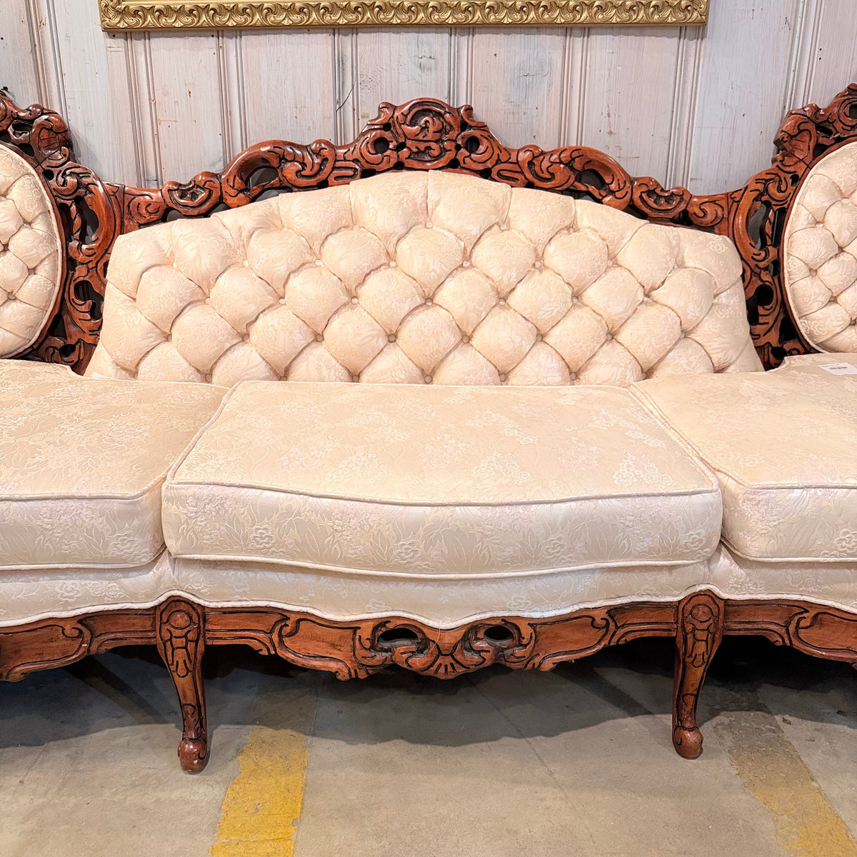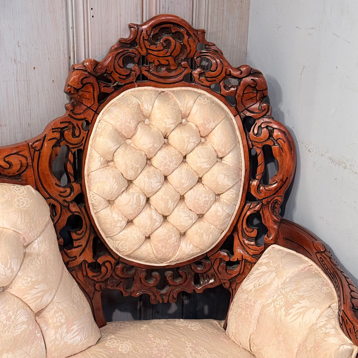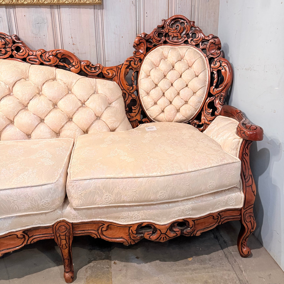 This product is a previously owned Victorian, wooden carved vintage floral sofa. It features a deep, button-tufted back with a carved crest rail along the back and a large seating area with removable seat cushions. It has a carved wooden frame with pierced foliate carving throughout and finished in a warm stain. It sits on a frame supported by straight, carved feet and is upholstered in a cream colored, Damask patterned fabric. The seat feels like it is constructed with springs. Free of rips or tears.