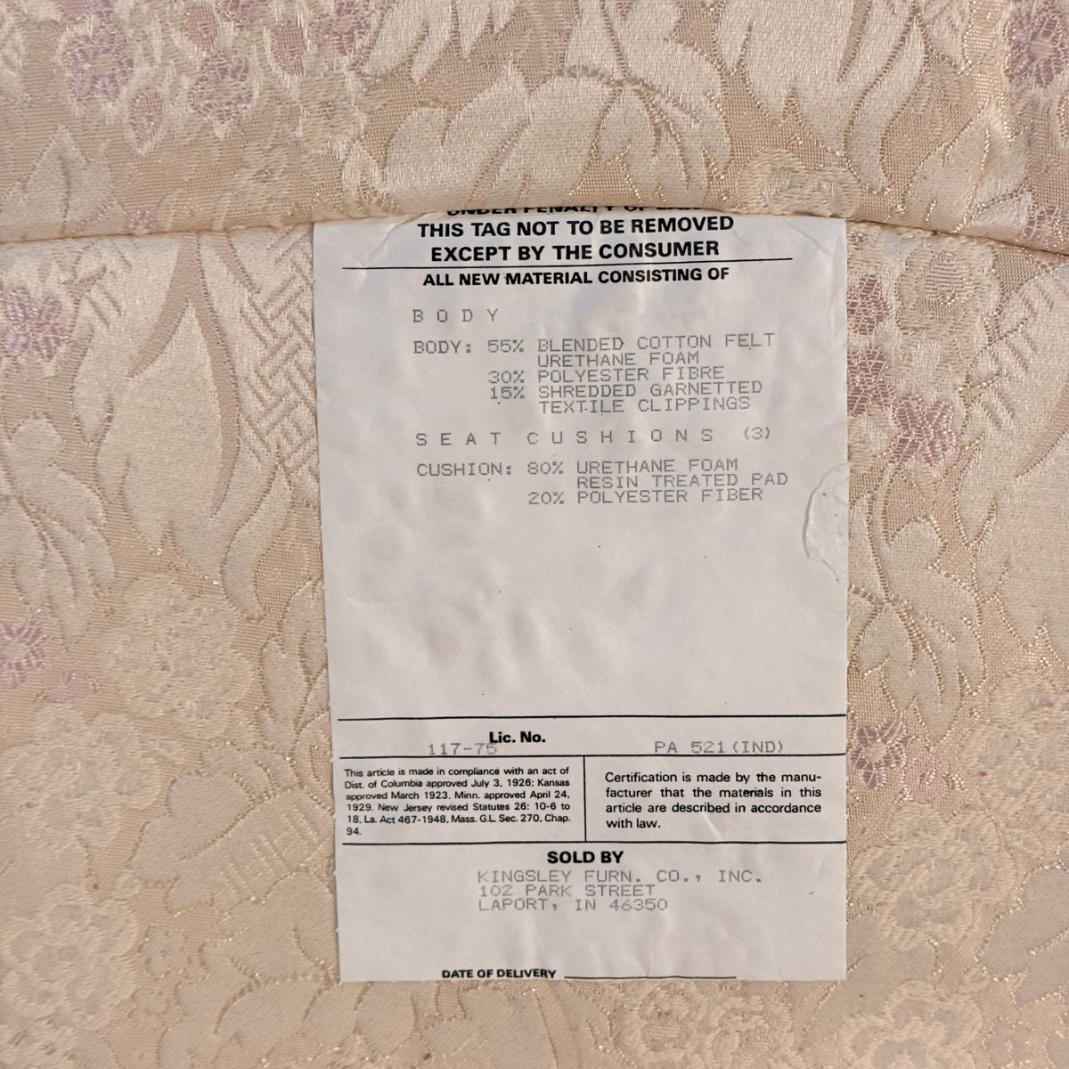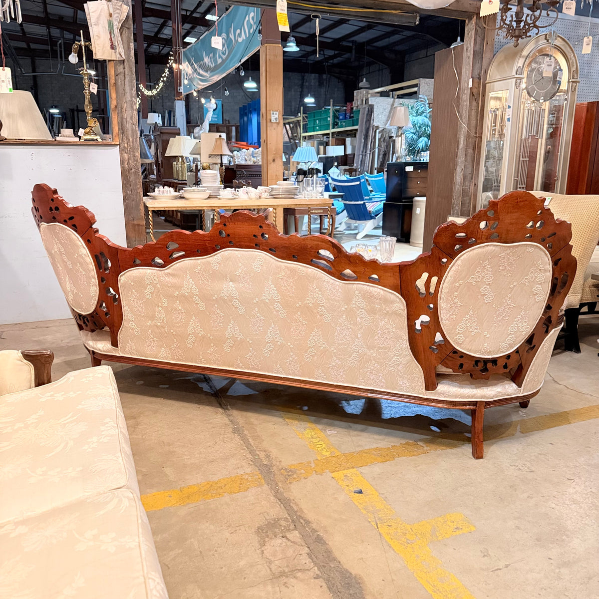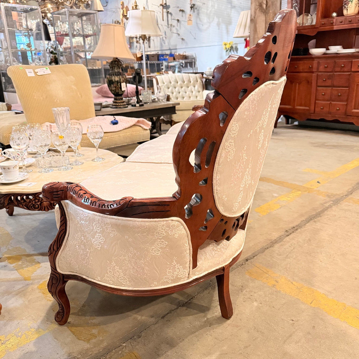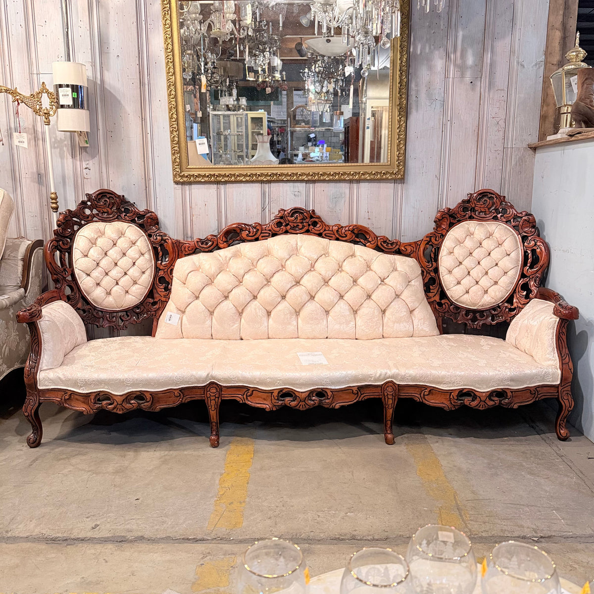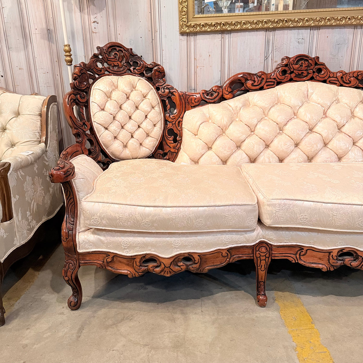 This product is a previously owned Victorian, wooden carved vintage floral sofa. It features a deep, button-tufted back with a carved crest rail along the back and a large seating area with removable seat cushions. It has a carved wooden frame with pierced foliate carving throughout and finished in a warm stain. It sits on a frame supported by straight, carved feet and is upholstered in a cream colored, Damask patterned fabric. The seat feels like it is constructed with springs. Free of rips or tears.