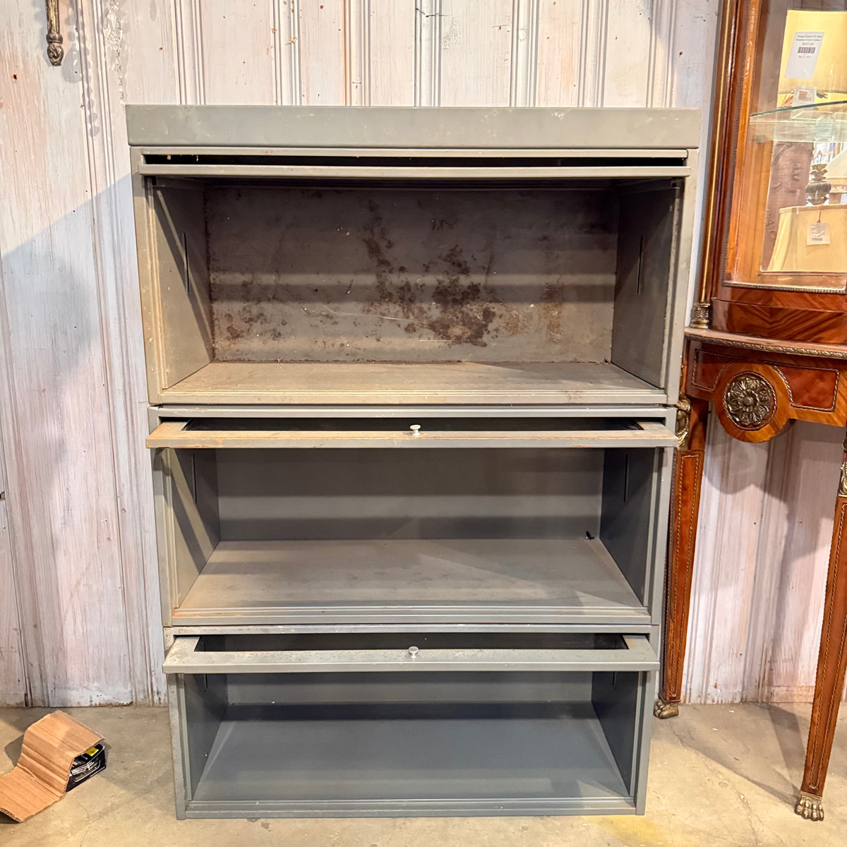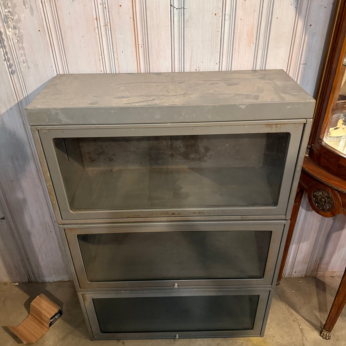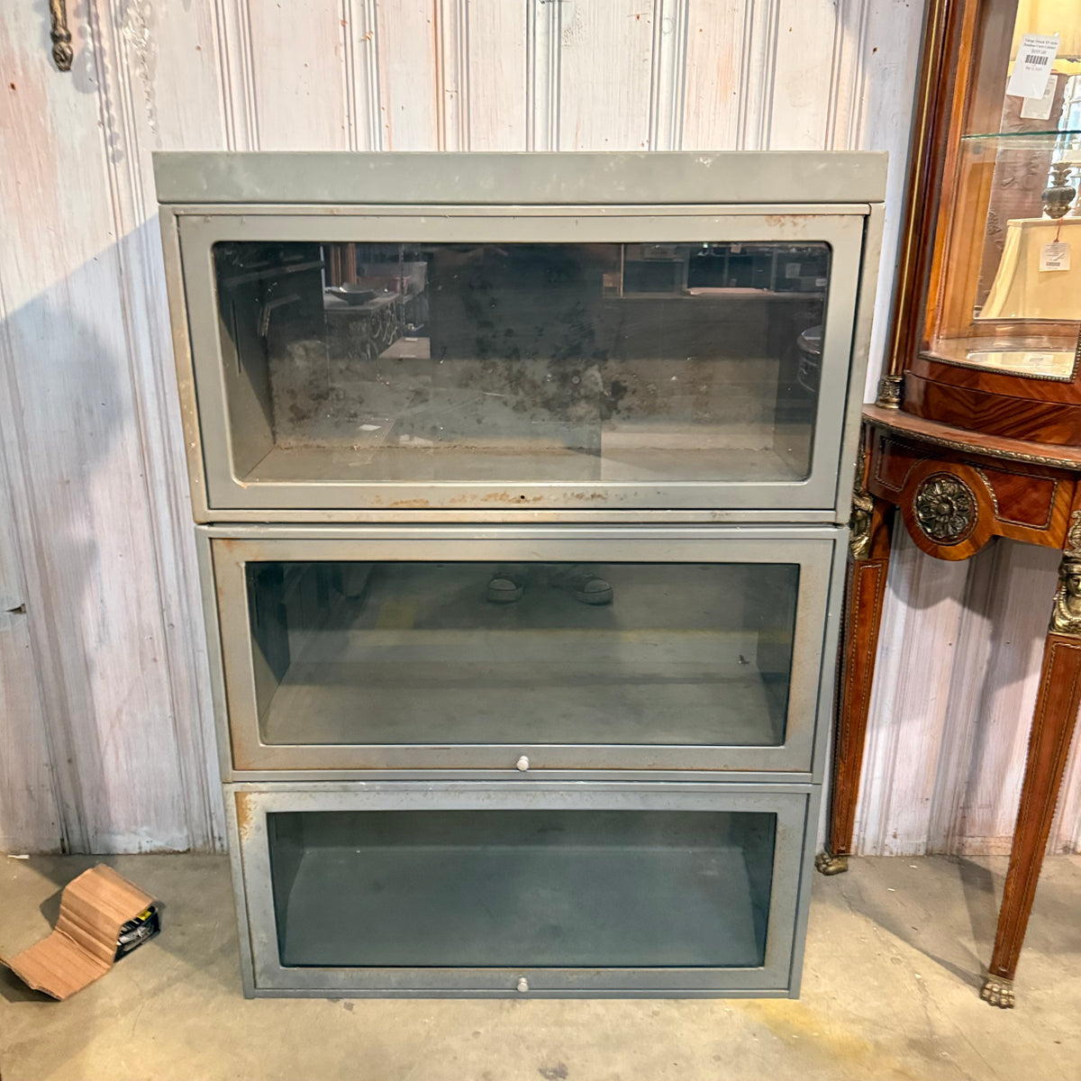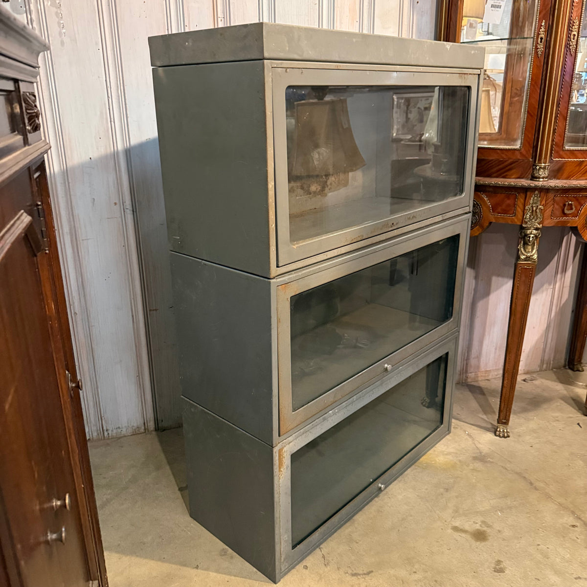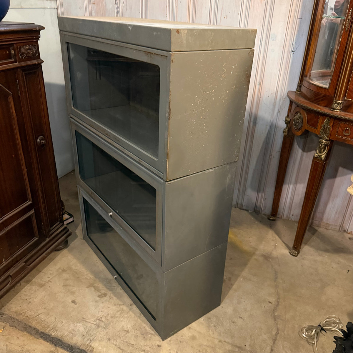 This vintage metal barrister bookcase consists of three stacked compartments with glass doors, and a top. The bookcase is made of metal and the glass is in good condition.