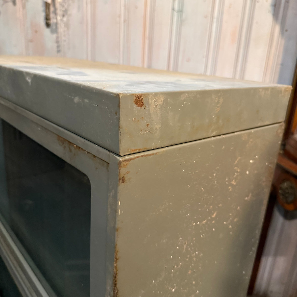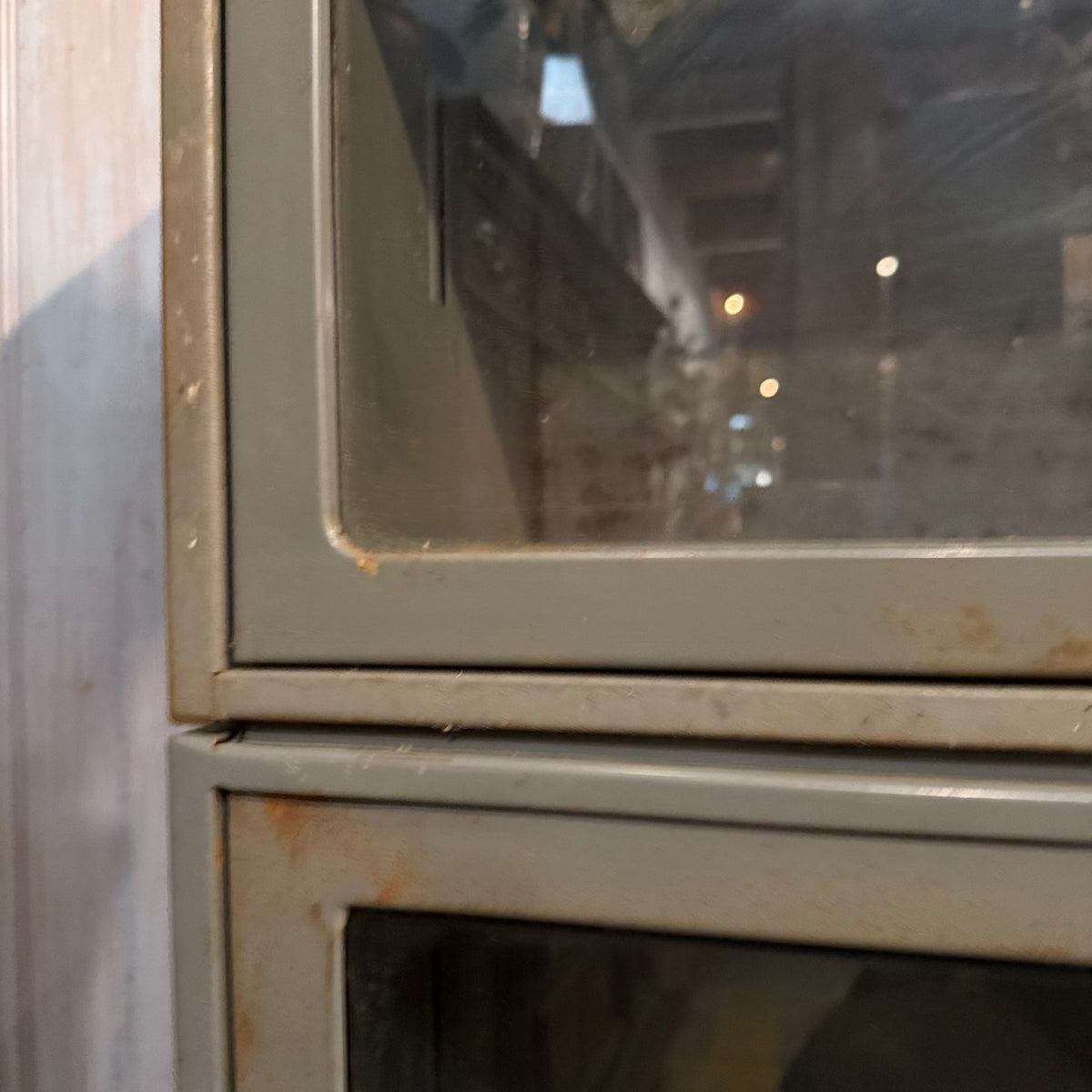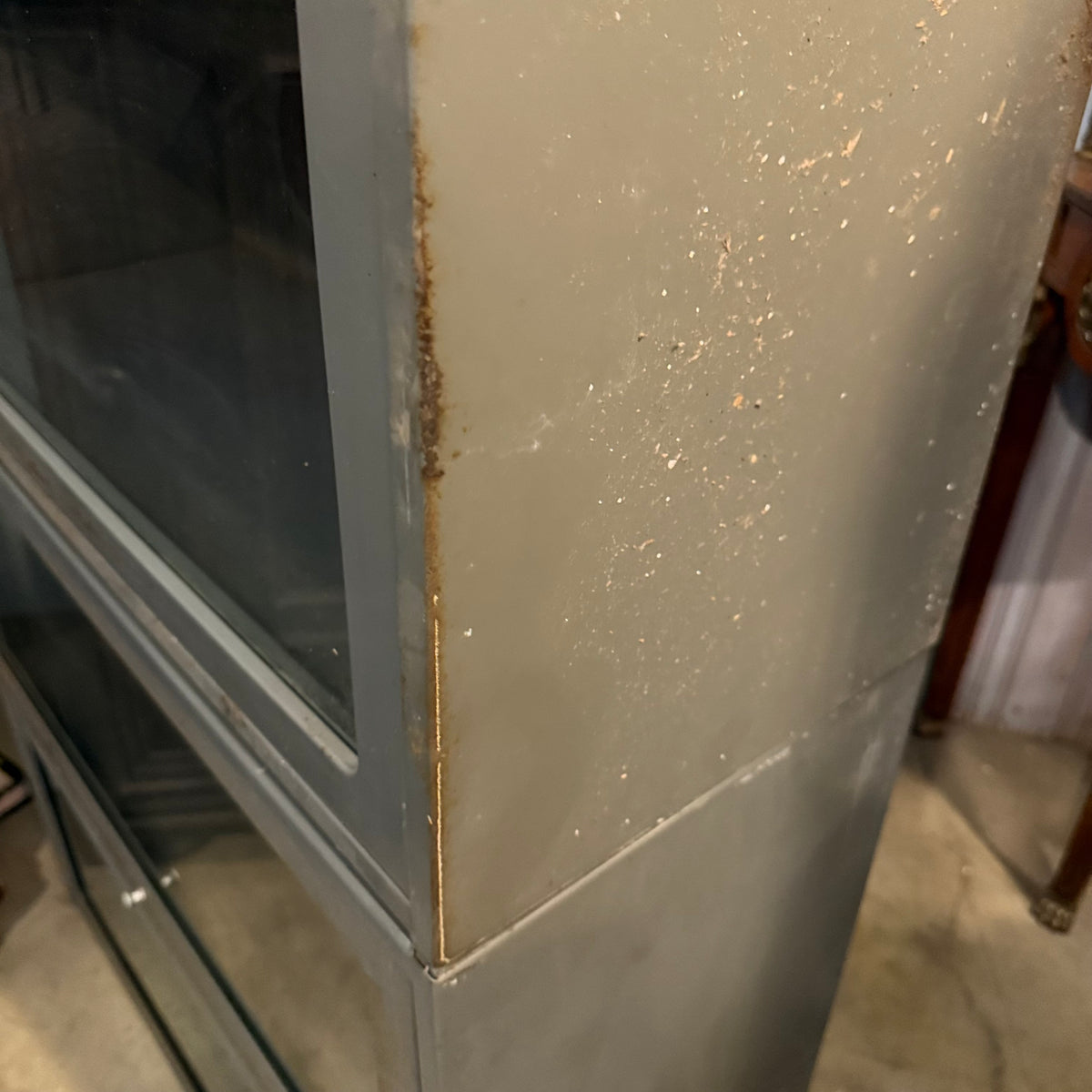 Please note, this barrister bookcase is missing its base. One of the knobs to the glass compartment all the way at the top is also missing (see photos). Please also note, there is an extensive amount of rusting throughout and chipping to the metal finish in some areas (see photos).