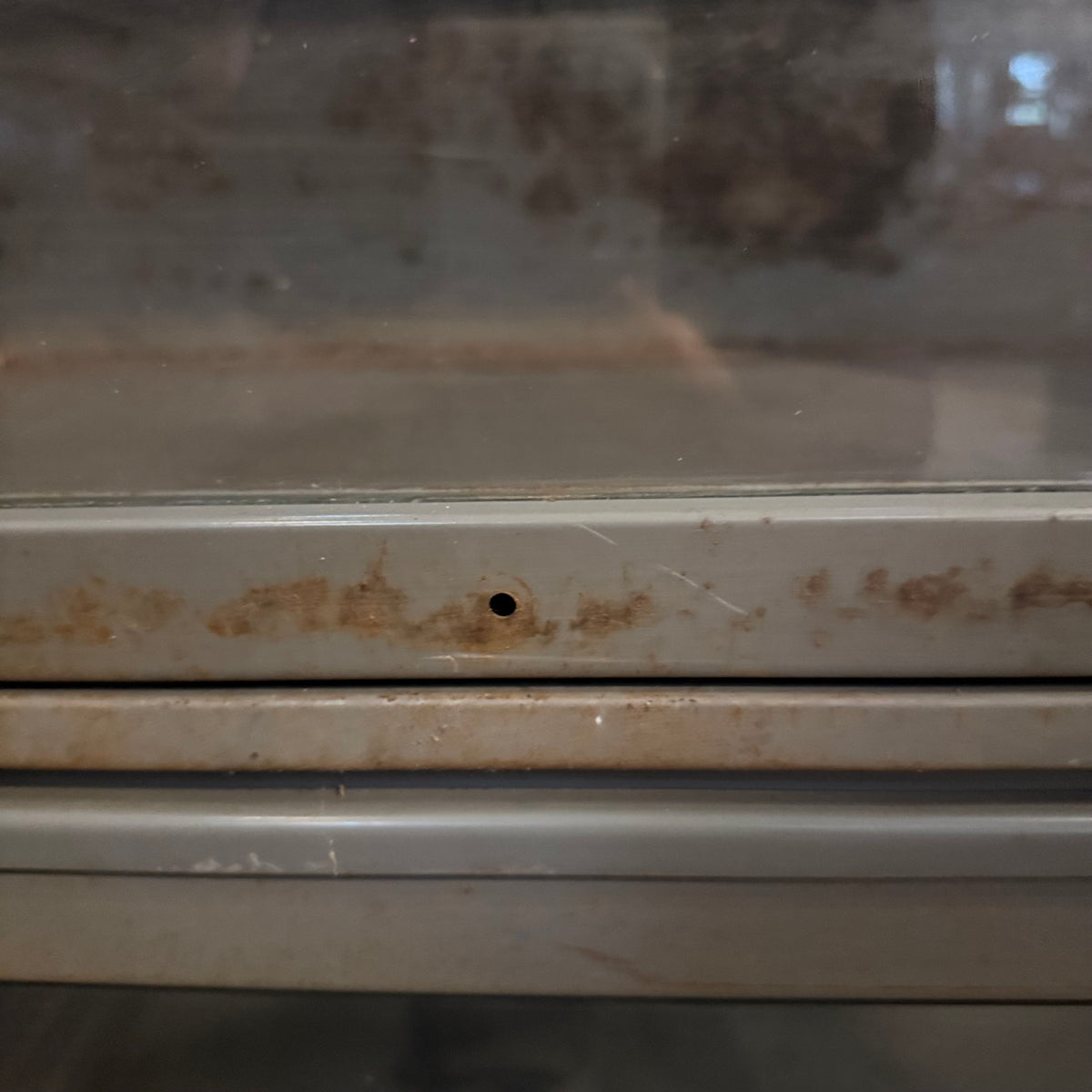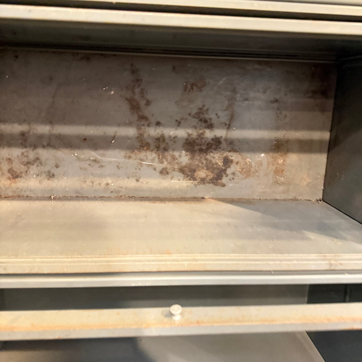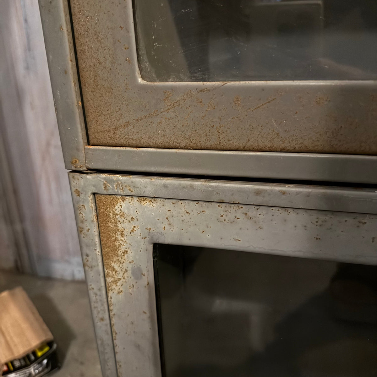 Please note, this barrister bookcase is missing its base. One of the knobs to the glass compartment all the way at the top is also missing (see photos). Please also note, there is an extensive amount of rusting throughout and chipping to the metal finish in some areas (see photos).