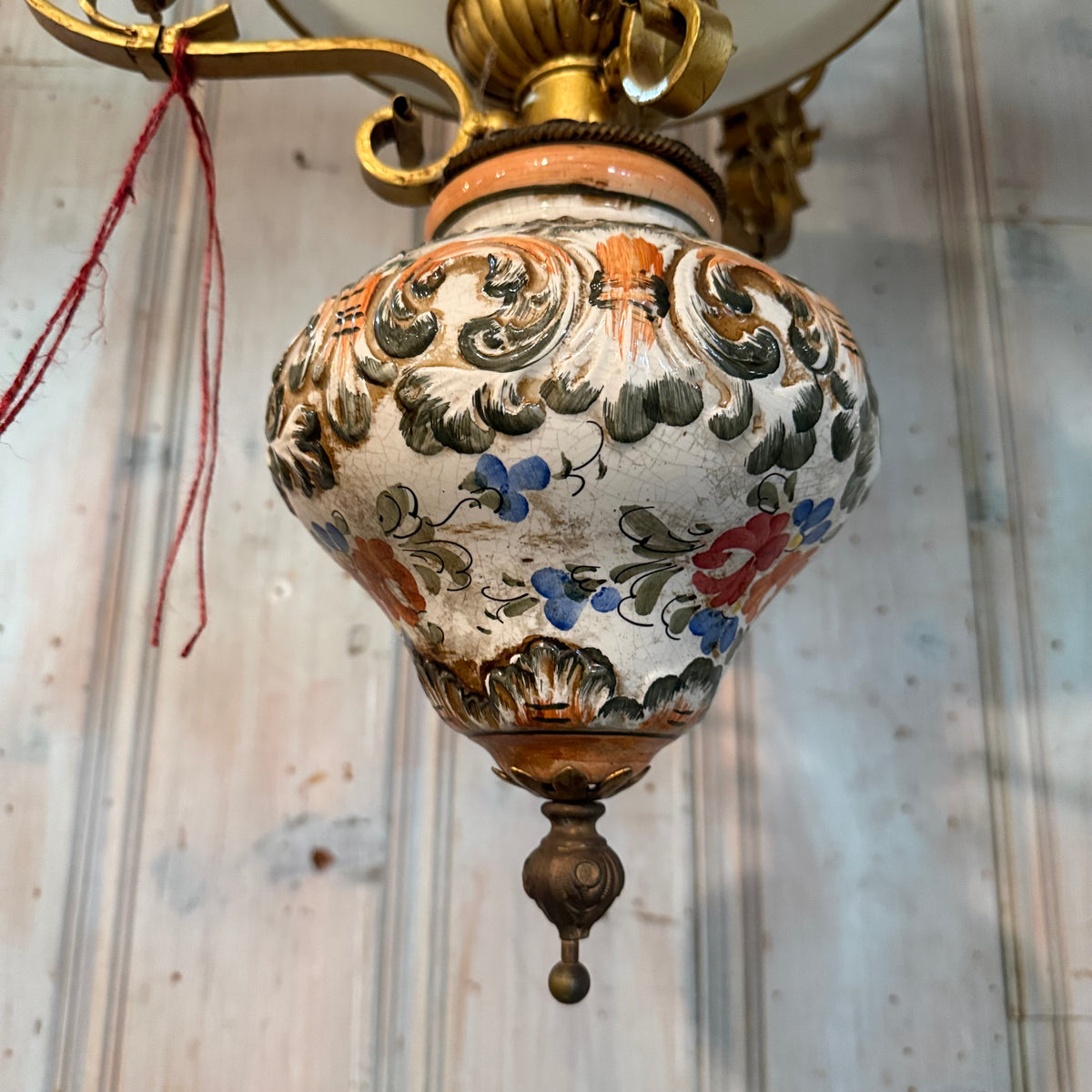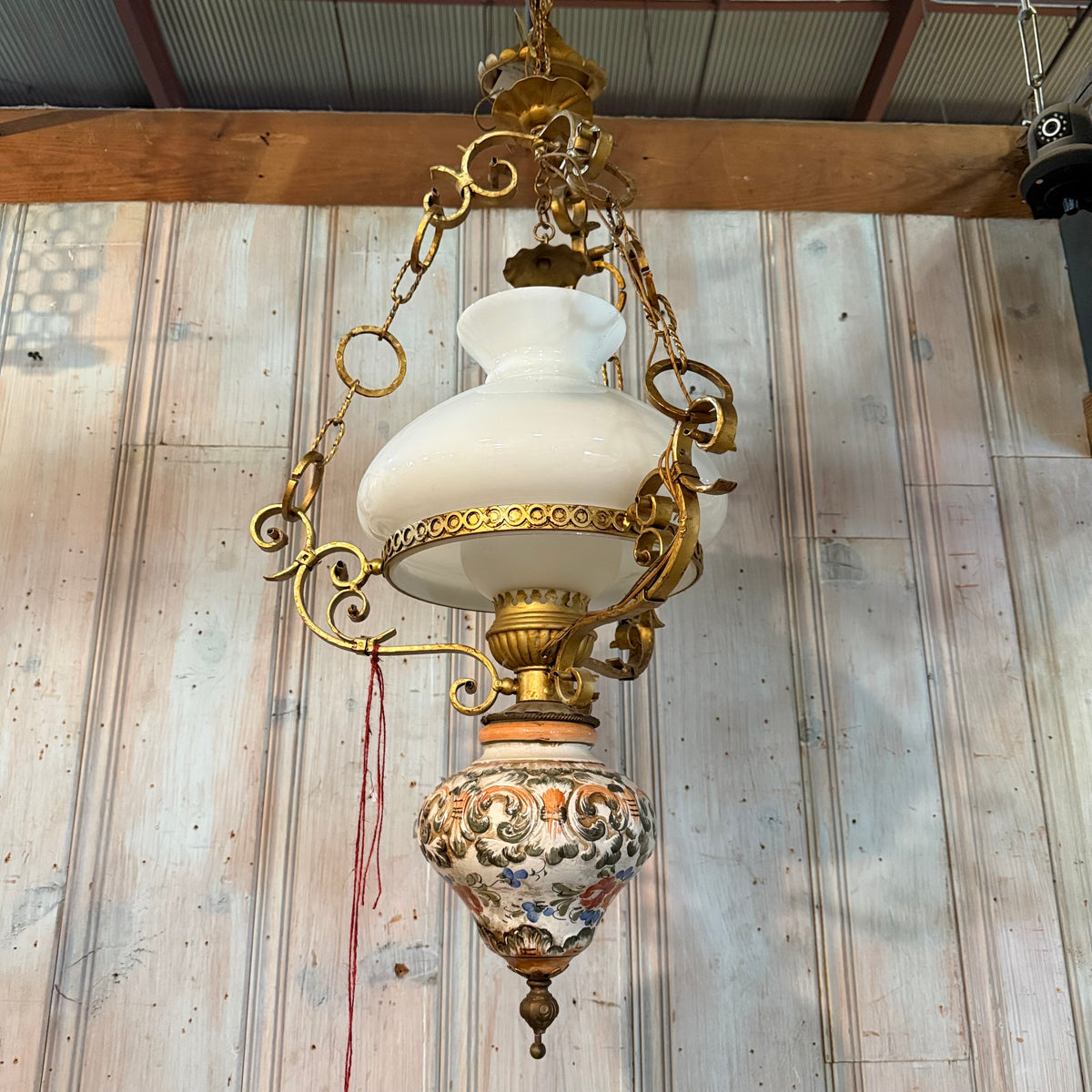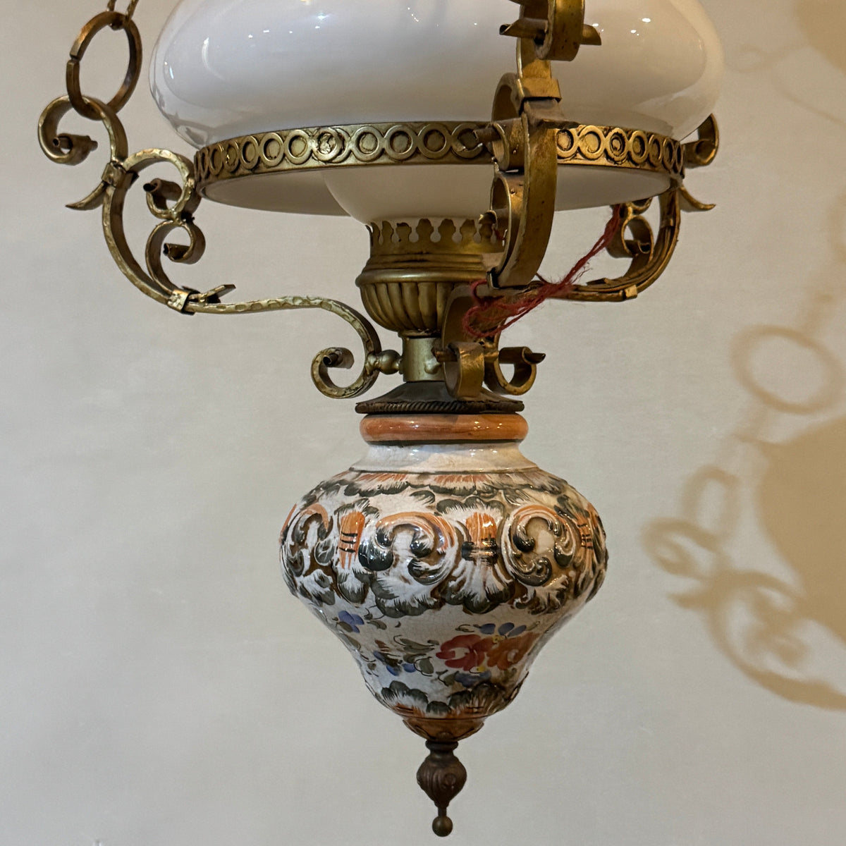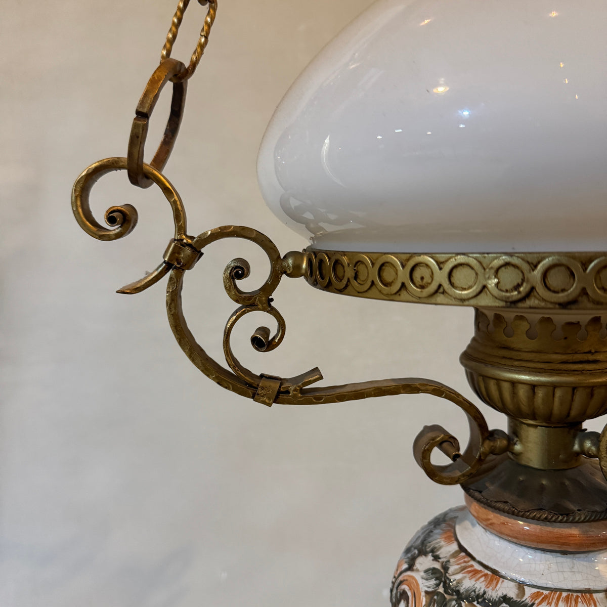 This vintage, early 20th century style library pendant features brass-toned metal framework with an Italian, majolica, hand-painted ceramic body and a white milk-glass shade. It is suspended by the canopy from three decorative brass chains and uses one standard medium (E26) base bulb.