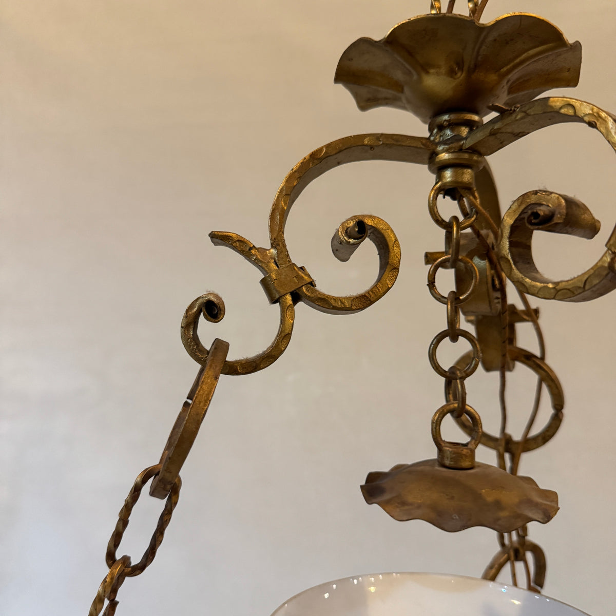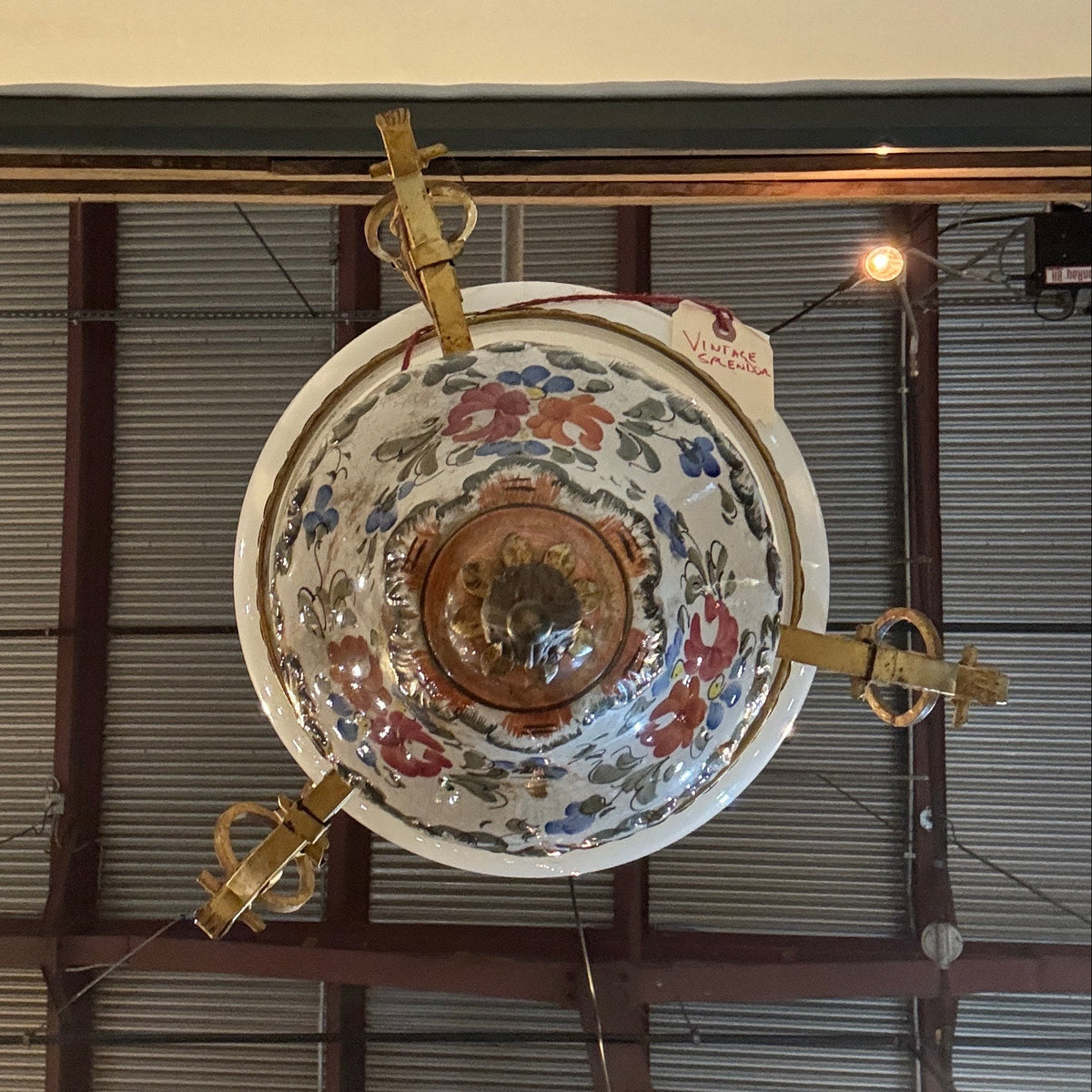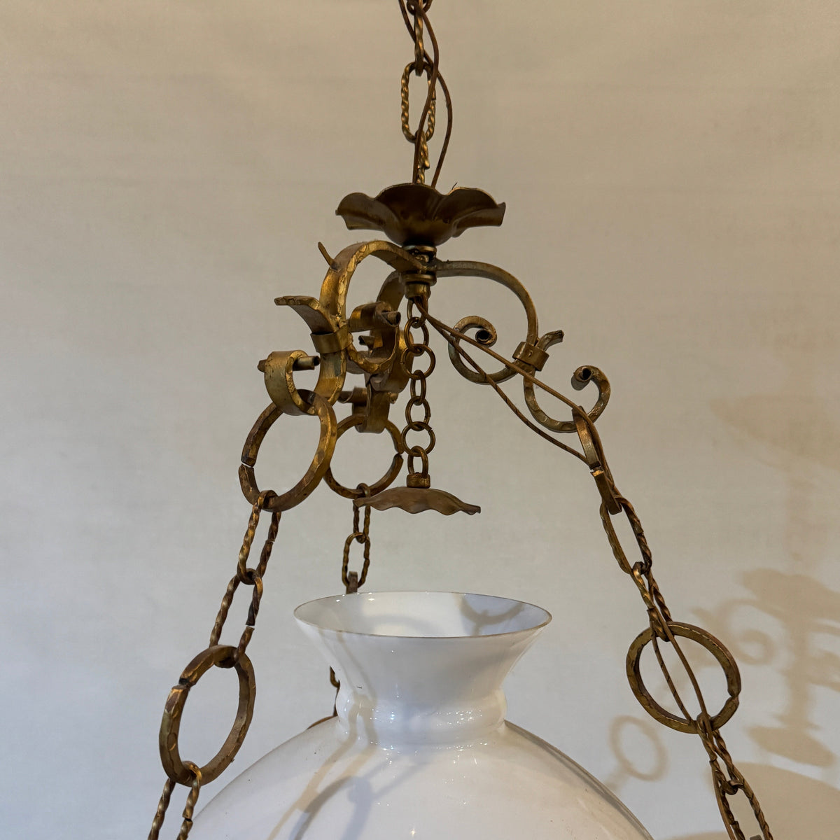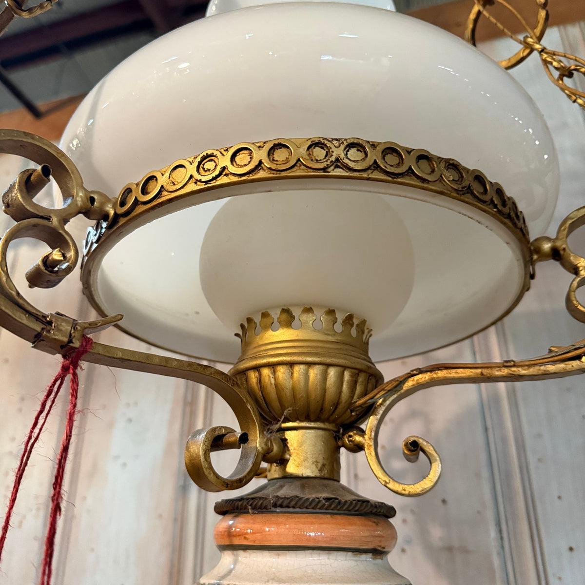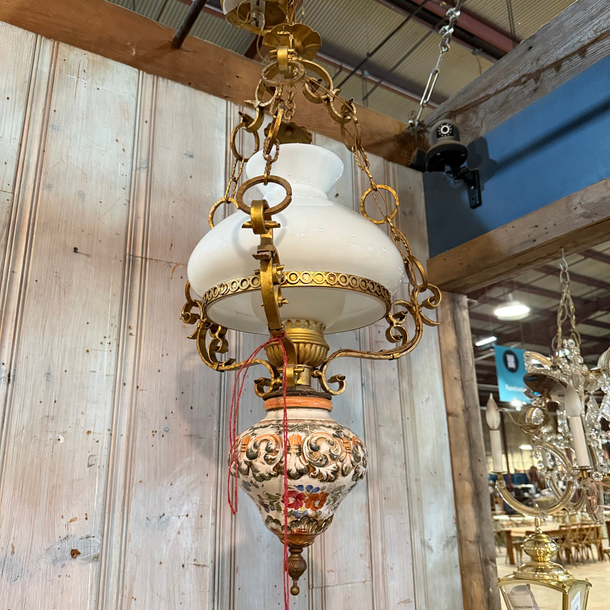 This vintage, early 20th century style library pendant features brass-toned metal framework with an Italian, majolica, hand-painted ceramic body and a white milk-glass shade. It is suspended by the canopy from three decorative brass chains and uses one standard medium (E26) base bulb.